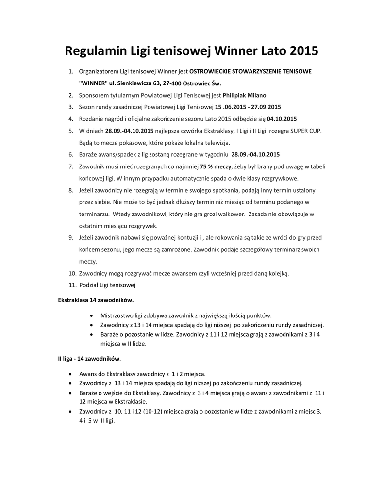 Regulamin Ligi tenisowej Winner Lato 2015