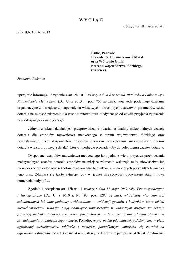 WYCIĄG Łódź, dnia 19 marca 2014 r. ZK-III.6310.167.2013 Panie, Panowie Prezydenci, Burmistrzowie Miast oraz Wójtowie Gmin z terenu województwa łódzkiego (wszyscy) Szanowni Państwo, uprzejmie informuję, iż zgodnie z art. 24 ust. 1 ustawy z dnia 8 września 2006 roku o Państwowym Ratownictwie Medycznym (Dz. U. z 2013 r., poz. 757 ze zm.), wojewoda podejmuje działania organizacyjne zmierzające do zapewnienia właściwych, określonych ustawowo, parametrów czasu dotarcia na miejsce zdarzenia dla zespołu ratownictwa medycznego od chwili przyjęcia zgłoszenia przez dyspozytora medycznego. Jednym z takich działań jest przeprowadzanie kwartalnej analizy maksymalnych czasów dotarcia dla zespołów ratownictwa medycznego z terenu województwa łódzkiego oraz przedstawianie przez dysponentów zespołów przyczyn przekraczania maksymalnych czasów dotarcia wraz z propozycją działań, których podjęcie prowadziłoby do polepszenia czasów dotarcia. Dysponenci zespołów ratownictwa medycznego jako jedną z wielu przyczyn przekraczania maksymalnych czasów dotarcia zespołów na miejsce zdarzenia wskazują m.in. niewłaściwe lub niewidoczne dla członków zespołów oznakowanie budynków, a w niektórych przypadkach również jego brak. Zdarzają się także sytuacje, gdy w jednej miejscowości obowiązuje stara i nowa numeracja budynków. Zgodnie z przepisem art. 47b ust. 1 ustawy z dnia 17 maja 1989 roku Prawo geodezyjne i kartograficzne (Dz. U. z 2010 r. Nr 193, poz. 1287 ze zm.), właściciele nieruchomości zabudowanych lub inne podmioty uwidocznione w ewidencji gruntów i budynków, które takimi nieruchomościami władają, mają obowiązek umieszczenia w widocznym miejscu na ścianie frontowej budynku tabliczki z numerem porządkowym, w terminie 30 dni od dnia otrzymania zawiadomienia o ustaleniu tego numeru. Ponadto, w przypadku gdy budynek położony jest w głębi ogrodzonej nieruchomości, tabliczkę z numerem porządkowym umieszcza się również na ogrodzeniu - stosownie do art. 47b ust. 4 ww. ustawy. Jednocześnie przepis art. 47b ust. 2 cytowanej ustawy wskazuje, iż na ww. tabliczce, oprócz numeru porządkowego zamieszcza się również nazwę ulicy lub placu, a w miejscowościach bez ulic lub placów albo posiadających ulice lub place bez nazw – nazwę miejscowości. Prawidłowe i widoczne oznakowanie budynków, wyraźne ich ponumerowanie jest niezmierne ważne w pracy zespołów ratownictwa medycznego, ponieważ przyczynia się do szybszego dotarcia zespołu do miejsca zdarzenia. W przypadku wezwań, do których dysponowane są zespoły ratownictwa medycznego niejednokrotnie istotne znaczenie mają minuty, a nawet sekundy, dlatego tak ważne jest, aby zespół bez problemów (takich jak np. szukanie właściwego budynku) mógł dotrzeć do osoby w stanie nagłego zagrożenia zdrowotnego i udzielić jej jak najszybciej medycznych czynności ratunkowych. W związku z powyższym, odpowiadając za planowanie, organizowanie, koordynowanie systemu Państwowego Ratownictwa Medycznego na terenie województwa łódzkiego oraz sprawując nadzór nad tym systemem na obszarze województwa łódzkiego, zgodnie z art. 19 ust. 2 ustawy o Państwowym Ratownictwie Medycznym, mając na względzie bezpieczeństwo zdrowia i życia mieszkańców województwa łódzkiego, zwracam się do Państwa z uprzejmą prośbą o upowszechnienie wśród swoich mieszkańców informacji o konieczności widocznego i czytelnego oznaczenia budynków. Umieszczenie tabliczki z numerem porządkowym wraz z nazwą ulicy lub placu, a w miejscowościach bez ulic lub placów albo posiadających ulice lub place bez nazw z nazwą miejscowości w widocznym miejscu na ścianie frontowej budynku, pozwoli na szybkie odnalezienie właściwego adresu przez wszystkie służby ratunkowe, w tym zespoły ratownictwa medycznego, a tym samym szybsze udzielenie pomocy poszkodowanym. …................... Podjęcie przez Państwa ww. działań przyczyni się do zwiększenia bezpieczeństwa zdrowia i życia mieszkańców poszczególnych gmin, gdyż właściwe oznakowanie ulic i placów oraz prawidłowa numeracja budynków, pozwolą na szybsze dotarcie służb ratunkowych do miejsca zdarzenia. Z poważaniem, WOJEWODA ŁÓDZKI Jolanta Chełmińska