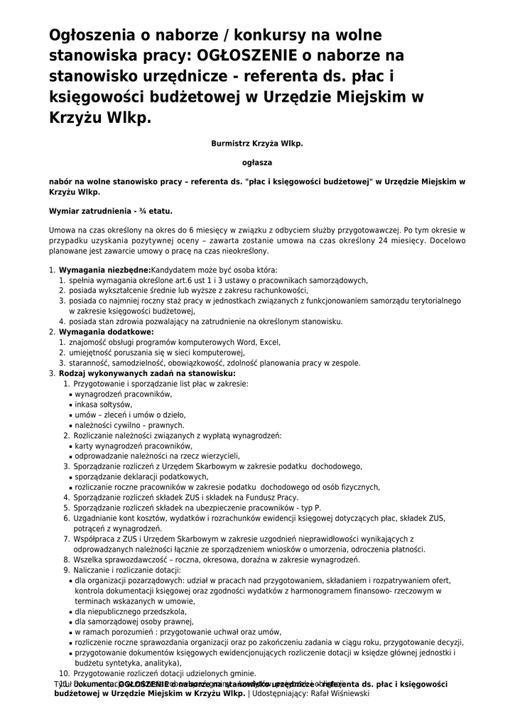 Ogłoszenia o naborze / konkursy na wolne stanowiska pracy: OGŁOSZENIE o naborze na stanowisko urzędnicze - referenta ds. płac i księgowości budżetowej w Urzędzie Miejskim w Krzyżu Wlkp. Burmistrz Krzyża Wlkp. ogłasza nabór na wolne stanowisko pracy – referenta ds. "płac i księgowości budżetowej" w Urzędzie Miejskim w Krzyżu Wlkp. Wymiar zatrudnienia - ¾ etatu. Umowa na czas określony na okres do 6 miesięcy w związku z odbyciem służby przygotowawczej. Po tym okresie w przypadku uzyskania pozytywnej oceny – zawarta zostanie umowa na czas określony 24 miesięcy. Docelowo planowane jest zawarcie umowy o pracę na czas nieokreślony. 1. Wymagania niezbędne:Kandydatem może być osoba która: 1. spełnia wymagania określone art.6 ust 1 i 3 ustawy o pracownikach samorządowych, 2. posiada wykształcenie średnie lub wyższe z zakresu rachunkowości, 3. posiada co najmniej roczny staż pracy w jednostkach związanych z funkcjonowaniem samorządu terytorialnego w zakresie księgowości budżetowej, 4. posiada stan zdrowia pozwalający na zatrudnienie na określonym stanowisku. 2. Wymagania dodatkowe: 1. znajomość obsługi programów komputerowych Word, Excel, 2. umiejętność poruszania się w sieci komputerowej, 3. staranność, samodzielność, obowiązkowość, zdolność planowania pracy w zespole. 3. Rodzaj wykonywanych zadań na stanowisku: 1. Przygotowanie i sporządzanie list płac w zakresie: wynagrodzeń pracowników, inkasa sołtysów, umów – zleceń i umów o dzieło, należności cywilno – prawnych. 2. Rozliczanie należności związanych z wypłatą wynagrodzeń: karty wynagrodzeń pracowników, odprowadzanie należności na rzecz wierzycieli, 3. Sporządzanie rozliczeń z Urzędem Skarbowym w zakresie podatku dochodowego, sporządzanie deklaracji podatkowych, rozliczanie roczne pracowników w zakresie podatku dochodowego od osób fizycznych, 4. Sporządzanie rozliczeń składek ZUS i składek na Fundusz Pracy. 5. Sporządzanie rozliczeń składek na ubezpieczenie pracowników - typ P. 6. Uzgadnianie kont kosztów, wydatków i rozrachunków ewidencji księgowej dotyczących płac, składek ZUS, potrąceń z wynagrodzeń. 7. Współpraca z ZUS i Urzędem Skarbowym w zakresie uzgodnień nieprawidłowości wynikających z odprowadzanych należności łącznie ze sporządzeniem wniosków o umorzenia, odroczenia płatności. 8. Wszelka sprawozdawczość – roczna, okresowa, doraźna w zakresie wynagrodzeń. 9. Naliczanie i rozliczanie dotacji: dla organizacji pozarządowych: udział w pracach nad przygotowaniem, składaniem i rozpatrywaniem ofert, kontrola dokumentacji księgowej oraz zgodności wydatków z harmonogramem finansowo- rzeczowym w terminach wskazanych w umowie, dla niepublicznego przedszkola, dla samorządowej osoby prawnej, w ramach porozumień : przygotowanie uchwał oraz umów, rozliczenie roczne sprawozdania organizacji oraz po zakończeniu zadania w ciągu roku, przygotowanie decyzji, przygotowanie dokumentów księgowych ewidencjonujących rozliczenie dotacji w księdze głównej jednostki i budżetu syntetyka, analityka), 10. Przygotowanie rozliczeń dotacji udzielonych gminie. 11. Dokumentacja w zakresie zobowiązań – kredytów,urzędnicze pożyczek i obligacji: Tytuł dokumentu: OGŁOSZENIE o naborzegminy na stanowisko - referenta ds. płac i księgowości budżetowej w Urzędzie Miejskim w Krzyżu Wlkp. | Udostępniający: Rafał Wiśniewski ■ ■ ■ ■ ■ ■ ■ ■ ■ ■ ■ ■ ■ ■ kontrola naliczanych odsetek. przestrzeganie terminowości płatności rat i odsetek. 12. Przygotowywanie dokumentów w zakresie zaciągania kredytów, pożyczek, emisji obligacji dotyczących: przetargów tj. SIWZ, tabel i zestawień oraz dokumentów wymaganych przez banki i instytucje do udzielenia kredytu, pożyczki, emisji obligacji, wniosków o niezaleganiu w płatnościach ZUS i US, prognozy spłaty długu tj. przygotowanie zarządzenia Burmistrza, wystąpienie do RIO o wydanie opinii, przygotowanie druku propozycji kredytu, pożyczki, obligacji do prognozy spłaty długu, 13. Prowadzenie dokumentacji księgowej zakładowego funduszu świadczeń socjalnych, naliczanie funduszu i rozliczanie do faktycznego stanu zatrudnienia, przygotowanie dokumentów do zmian w budżecie. 14. Terminowe przekazywanie odpisu na fundusz świadczeń socjalnych. 15. Opracowywanie materiałów w zakresie planowania płac, płatności w zakresie obsługi długu, Wieloletniej Prognozy Finansowej, ZFŚS, dotacji. 16. Inne prace zlecone przez Burmistrza, Skarbnika lub Zastępcę Skarbnika. Wymagane dokumenty: 1. list motywacyjny, życiorys (CV) z uwzględnieniem dokładnego przebiegu kariery zawodowej, 2. wypełniony kwestionariusz osobowy wraz ze zdjęciem (formularz kwestionariusza do pobrania w sekretariacie Urzędu), 3. dokumenty potwierdzające wykształcenie i kwalifikacje zawodowe wymagane do wykonywania oferowanej pracy - kserokopie uwierzytelnione przez organy do tego upoważnione, 4. oświadczenie kandydata o: posiadaniu pełnej zdolności do czynności prawnych, korzystaniu w pełni z praw publicznych, niekaralności za przestępstwa popełnione umyślnie, 5. oświadczenie lekarskie o stanie zdrowia pozwalającym na zatrudnienie na określonym stanowisku. Informacja o naborze umieszczona będzie w Biuletynie Informacji Publicznej oraz na tablicy ogłoszeń w Urzędzie Miejskim w Krzyżu. Dokumenty składane przez osoby ubiegające się o zatrudnienie w Urzędzie Miejskim mogą być przyjmowane tylko po umieszczeniu ogłoszenia o organizowanym naborze i tylko w formie pisemnej. Nie ma możliwości przekazywania dokumentów drogą elektroniczną. Wstępna ocena kandydatów zostanie przeprowadzona na podstawie analizy dokumentów aplikacyjnych. Celem analizy będzie porównanie danych zawartych w aplikacji z wymogami formalnymi określonymi w ogłoszeniu i wstępne określenie przydatności kandydata do pracy na wolnym stanowisku. Nabór kandy