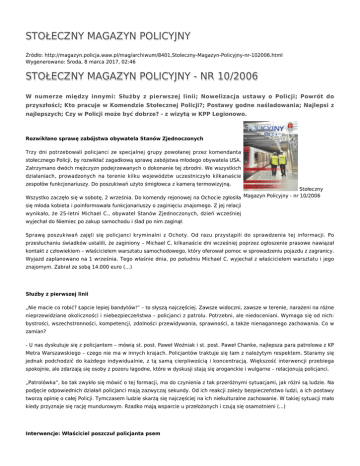 STOŁECZNY MAGAZYN POLICYJNY Źródło: http://magazyn.policja.waw.pl/mag/archiwum/8401,Stoleczny-Magazyn-Policyjny-nr-102006.html Wygenerowano: Środa, 8 marca 2017, 02:46 STOŁECZNY MAGAZYN POLICYJNY - NR 10/2006 W numerze między innymi: Służby z pierwszej linii; Nowelizacja ustawy o Policji; Powrót do przyszłości; Kto pracuje w Komendzie Stołecznej Policji?; Postawy godne naśladowania; Najlepsi z najlepszych; Czy w Policji może być dobrze? - z wizytą w KPP Legionowo. Rozwikłano sprawę zabójstwa obywatela Stanów Zjednoczonych Trzy dni potrzebowali policjanci ze specjalnej grupy powołanej przez komendanta stołecznego Policji, by rozwikłać zagadkową sprawę zabójstwa młodego obywatela USA. Zatrzymano dwóch mężczyzn podejrzewanych o dokonanie tej zbrodni. We wszystkich działaniach, prowadzonych na terenie kilku województw uczestniczyło kilkanaście zespołów funkcjonariuszy. Do poszukiwań użyto śmigłowca z kamerą termowizyjną. Stołeczny Magazyn Policyjny nr 10/2006 Wszystko zaczęło się w sobotę, 2 września. Do komendy rejonowej na Ochocie zgłosiła się młoda kobieta i poinformowała funkcjonariuszy o zaginięciu znajomego. Z jej relacji wynikało, że 25-letni Michael C., obywatel Stanów Zjednoczonych, dzień wcześniej wyjechał do Niemiec po zakup samochodu i ślad po nim zaginął. Sprawą poszukiwań zajęli się policjanci kryminalni z Ochoty. Od razu przystąpili do sprawdzenia tej informacji. Po przesłuchaniu świadków ustalili, że zaginiony – Michael C. kilkanaście dni wcześniej poprzez ogłoszenie prasowe nawiązał kontakt z człowiekiem – właścicielem warsztatu samochodowego, który oferował pomoc w sprowadzeniu pojazdu z zagranicy. Wyjazd zaplanowano na 1 września. Tego właśnie dnia, po południu Michael C. wyjechał z właścicielem warsztatu i jego znajomym. Zabrał ze sobą 14.000 euro (…) Służby z pierwszej linii „Nie macie co robić? Łapcie lepiej bandytów!” – to słyszą najczęściej. Zawsze widoczni, zawsze w terenie, narażeni na różne nieprzewidziane okoliczności i niebezpieczeństwa – policjanci z patrolu. Potrzebni, ale niedoceniani. Wymaga się od nich: bystrości, wszechstronności, kompetencji, zdolności przewidywania, sprawności, a także nienagannego zachowania. Co w zamian? - U nas dyskutuje się z policjantem – mówią st. post. Paweł Woźniak i st. post. Paweł Chanke, najlepsza para patrolowa z KP Metra Warszawskiego – czego nie ma w innych krajach. Policjantów traktuje się tam z należytym respektem. Staramy się jednak podchodzić do każdego indywidualnie, z tą samą cierpliwością i koncentracją. Większość interwencji przebiega spokojnie, ale zdarzają się osoby z pozoru łagodne, które w dyskusji stają się aroganckie i wulgarne – relacjonują policjanci. „Patrolówka”, bo tak zwykło się mówić o tej formacji, ma do czynienia z tak przeróżnymi sytuacjami, jak różni są ludzie. Na podjęcie odpowiednich działań policjanci mają zazwyczaj sekundy. Od ich reakcji zależy bezpieczeństwo ludzi, a ich postawy tworzą opinię o całej Policji. Tymczasem ludzie skarżą się najczęściej na ich niekulturalne zachowanie. W takiej sytuacji mało kiedy przyznaje się rację mundurowym. Rzadko mają wsparcie u przełożonych i czują się osamotnieni (...) Interwencje: Właściciel poszczuł policjanta psem O tym, że policjanci powinni być przygotowani na każdą sytuację, nawet zagrażającą ich życiu świadczy zdarzenie, do którego doszło na terenie KRP Warszawa VI. Północnoprascy policjanci zatrzymali mężczyznę, który podczas jednej z interwencji poszczuł psem rasy amstaff jednego z funkcjonariuszy. Pies ugryzł policjanta w nogę i rzucił mu się do gardła. Na szczęście rany nie były groźne. Zwierzę zostało zastrzelone przez drugiego z funkcjonariuszy (...) Pełne teksty oraz pozostałe artykuły przeczytasz w elektronicznym wydaniu Stołecznego Magazynu Policyjnego – do pobrania w formacie PDF. ZAŁĄCZNIKI DO STRONY Stołeczny Magazyn Policyjny - nr 10/2006 (PDF) 1.08 MB Ocena: 0/5 (0) Tweetnij