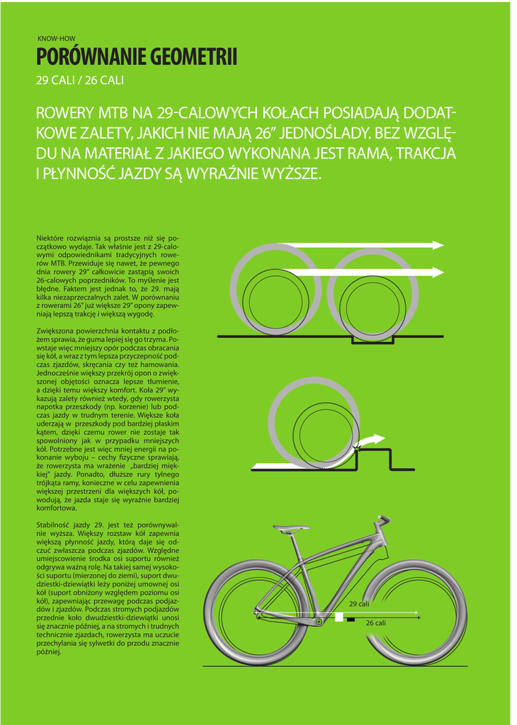 Know-how Porównanie geometrii 29 cali / 26 cali Rowery MTB na 29-calowych kołach posiadają dodatkowe zalety, jakich nie mają 26” jednoślady. Bez względu na materiał z jakiego wykonana jest rama, trakcja i płynność jazdy są wyraźnie wyższe. Niektóre rozwiąznia są prostsze niż się początkowo wydaje. Tak właśnie jest z 29-calowymi odpowiednikami tradycyjnych rowerów MTB. Przewiduje się nawet, że pewnego dnia rowery 29” całkowicie zastąpią swoich 26-calowych poprzedników. To myślenie jest błędne. Faktem jest jednak to, że 29. mają kilka niezaprzeczalnych zalet. W porównaniu z rowerami 26” już większe 29” opony zapewniają lepszą trakcję i większą wygodę. Zwiększona powierzchnia kontaktu z podłożem sprawia, że guma lepiej się go trzyma. Powstaje więc mniejszy opór podczas obracania się kół, a wraz z tym lepsza przyczepność podczas zjazdów, skręcania czy też hamowania. Jednocześnie większy przekrój opon o zwiększonej objętości oznacza lepsze tłumienie, a dzięki temu większy komfort. Koła 29” wykazują zalety również wtedy, gdy rowerzysta napotka przeszkody (np. korzenie) lub podczas jazdy w trudnym terenie. Większe koła uderzają w przeszkody pod bardziej płaskim kątem, dzięki czemu rower nie zostaje tak spowolniony jak w przypadku mniejszych kół. Potrzebne jest więc mniej energii na pokonanie wyboju – cechy fizyczne sprawiają, że rowerzysta ma wrażenie „bardziej miękkiej” jazdy. Ponadto, dłuższe rury tylnego trójkąta ramy, konieczne w celu zapewnienia większej przestrzeni dla większych kół, powodują, że jazda staje się wyraźnie bardziej komfortowa. Stabilność jazdy 29. jest też porównywalnie wyższa. Większy rozstaw kół zapewnia większą płynność jazdy, którą daje się odczuć zwłaszcza podczas zjazdów. Względne umiejscowienie środka osi suportu również odgrywa ważną rolę. Na takiej samej wysokości suportu (mierzonej do ziemi), suport dwudziestki-dziewiątki leży poniżej umownej osi kół (suport obniżony względem poziomu osi kół), zapewniając przewagę podczas podjazdów i zjazdów. Podczas stromych podjazdów przednie koło dwudziestki-dziewiątki unosi się znacznie później, a na stromych i trudnych technicznie zjazdach, rowerzysta ma uczucie przechylania się sylwetki do przodu znacznie później. 29 cali 26 cali