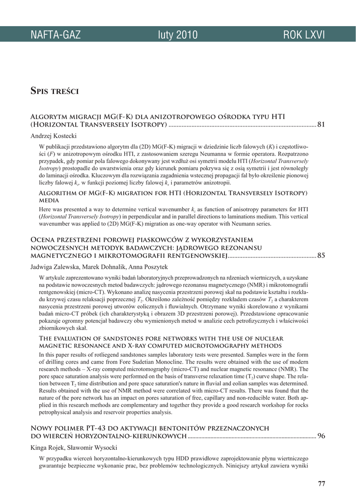 NAFTA-GAZ luty 2010 ROK LXVI Spis treści Algorytm migracji MG(F-K) dla anizotropowego ośrodka typu HTI (Horizontal Transversely Isotropy)������������������������������������������������������������������������������������������ 81 Andrzej Kostecki W publikacji przedstawiono algorytm dla (2D) MG(F-K) migracji w dziedzinie liczb falowych (K) i częstotliwości (F) w anizotropowym ośrodku HTI, z zastosowaniem szeregu Neumanna w formie operatora. Rozpatrzono przypadek, gdy pomiar pola falowego dokonywany jest wzdłuż osi symetrii modelu HTI (Horizontal Transversely Isotropy) prostopadle do uwarstwienia oraz gdy kierunek pomiaru pokrywa się z osią symetrii i jest równoległy do laminacji ośrodka. Kluczowym dla rozwiązania zagadnienia wstecznej propagacji fal było określenie pionowej liczby falowej kz, w funkcji poziomej liczby falowej kx i parametrów anizotropii. Algorithm of MG(F-K) migration for HTI (Horizontal Transversely Isotropy) media Here was presented a way to determine vertical wavenumber kz as function of anisotropy parameters for HTI (Horizontal Transversely Isotropy) in perpendicular and in parallel directions to laminations medium. This vertical wavenumber was applied to (2D) MG(F-K) migration as one-way operator with Neumann series. Ocena przestrzeni porowej piaskowców z wykorzystaniem nowoczesnych metodyk badawczych: jądrowego rezonansu magnetycznego i mikrotomografii rentgenowskiej������������������������������������������������������ 85 Jadwiga Zalewska, Marek Dohnalik, Anna Poszytek W artykule zaprezentowano wyniki badań laboratoryjnych przeprowadzonych na rdzeniach wiertniczych, a uzyskane na podstawie nowoczesnych metod badawczych: jądrowego rezonansu magnetycznego (NMR) i mikrotomografii rentgenowskiej (micro-CT). Wykonano analizę nasycenia przestrzeni porowej skał na podstawie kształtu i rozkładu krzywej czasu relaksacji poprzecznej T2. Określono zależność pomiędzy rozkładem czasów T2 a charakterem nasycenia przestrzeni porowej utworów eolicznych i fluwialnych. Otrzymane wyniki skorelowano z wynikami badań micro-CT próbek (ich charakterystyką i obrazem 3D przestrzeni porowej). Przedstawione opracowanie pokazuje ogromny potencjał badawczy obu wymienionych metod w analizie cech petrofizycznych i właściwości zbiornikowych skał. The evaluation of sandstones pore networks with the use of nuclear magnetic resonance and X-ray computed microtomography methods In this paper results of rotliegend sandstones samples laboratory tests were presented. Samples were in the form of drilling cores and came from Fore Sudetian Monocline. The results were obtained with the use of modern research methods – X-ray computed microtomography (micro-CT) and nuclear magnetic resonance (NMR). The pore space saturation analysis were performed on the basis of transverse relaxation time (T2) curve shape. The relation between T2 time distribution and pore space saturation's nature in fluvial and eolian samples was determined. Results obtained with the use of NMR method were correlated with micro-CT results. There was found that the nature of the pore network has an impact on pores saturation of free, capillary and non-reducible water. Both applied in this research methods are complementary and together they provide a good research workshop for rocks petrophysical analysis and reservoir properties analysis. Nowy polimer PT-43 do aktywacji bentonitów przeznaczonych do wierceń horyzontalno-kierunkowych������������������������������������������������������������������������������������� 96 Kinga Rojek, Sławomir Wysocki W przypadku wierceń horyzontalno-kierunkowych typu HDD prawidłowe zaprojektowanie płynu wiertniczego gwarantuje bezpieczne wykonanie prac, bez problemów technologicznych. Niniejszy artykuł zawiera wyniki 77 NAFTA-GAZ badań laboratoryjnych nad wykorzystaniem nowego polimeru PT-43 do modyfikacji bentonitów przeznaczonych do zastosowania w technologii HDD. W artykule opisano badania parametrów reologicznych skomponowanych płuczek, ich odporności na skażenie jonami jedno- i wielowartościowymi oraz smarności. Dobrano również modele reologiczne opisujące badane płuczki. Wyniki badań wykazują, że badany polimer może znaleźć zastosowanie w technologiach HDD. New polymer PT-43 for bentonite activation to HDD drilling HDD (Horizontal Directional Drilling) is classified as trenchless technology. Specific character of HDD caused specific parameters of drilling mud. Searching innovated solutions is important to fulfill increasing technological requirements. The paper presents results of lab research of new polymer PT-43 to bentonite modifications. Research of reological parametrs, mono- and multivalent ions contamination resistance and lubricity was conducted. Rheological models for tested muds was presented also. Results show possibility for industrial application of PT-43 polymer. Ocena efektywności kwasowania matrycowego formacji węglanowych������100 Marek Czupski Podczas kwasowania matrycowego formacji węglanowych płyn kwasujący rozpuszcza skałę w sposób niejednorodny, tworząc kanały o dużej przepuszczalności – zwane otworami robaczkowymi. Zjawisko ich formowania ma fundamentalne znaczenie dla powodzenia tego typu zabiegów i zależy od szybkości tłoczenia kwasu, kinetyki reakcji kwas-skała oraz filtracji płynu z otworów robaczkowych. W niniejszym artykule scharakteryzowano podstawowe typy struktur rozpuszczanych przez kwas w formacjach węglanowych. Przedsta