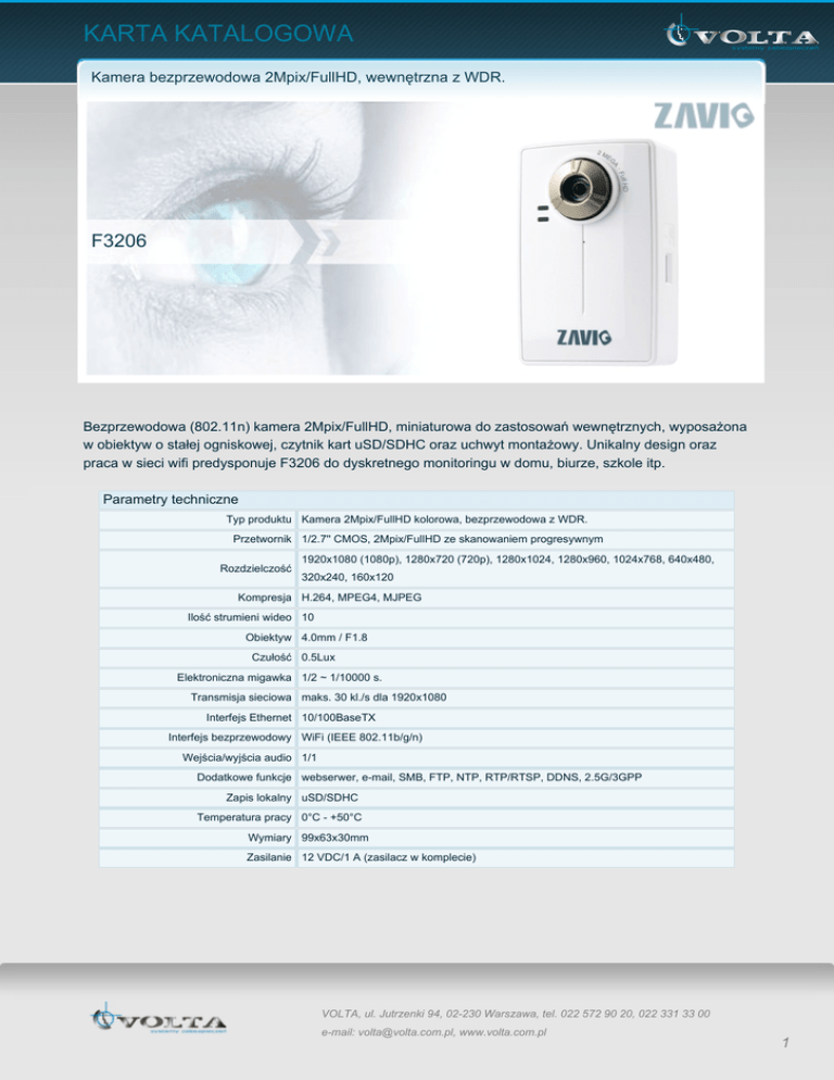KARTA KATALOGOWA Kamera bezprzewodowa 2Mpix/FullHD, wewnętrzna z WDR. F3206 Bezprzewodowa (802.11n) kamera 2Mpix/FullHD, miniaturowa do zastosowań wewnętrznych, wyposażona w obiektyw o stałej ogniskowej, czytnik kart uSD/SDHC oraz uchwyt montażowy. Unikalny design oraz praca w sieci wifi predysponuje F3206 do dyskretnego monitoringu w domu, biurze, szkole itp. Parametry techniczne Typ produktu Kamera 2Mpix/FullHD kolorowa, bezprzewodowa z WDR. Przetwornik 1/2.7'' CMOS, 2Mpix/FullHD ze skanowaniem progresywnym Rozdzielczość 1920x1080 (1080p), 1280x720 (720p), 1280x1024, 1280x960, 1024x768, 640x480, 320x240, 160x120 Kompresja H.264, MPEG4, MJPEG Ilość strumieni wideo 10 Obiektyw 4.0mm / F1.8 Czułość 0.5Lux Elektroniczna migawka 1/2 ~ 1/10000 s. Transmisja sieciowa maks. 30 kl./s dla 1920x1080 Interfejs Ethernet 10/100BaseTX Interfejs bezprzewodowy WiFi (IEEE 802.11b/g/n) Wejścia/wyjścia audio 1/1 Dodatkowe funkcje webserwer, e-mail, SMB, FTP, NTP, RTP/RTSP, DDNS, 2.5G/3GPP Zapis lokalny uSD/SDHC Temperatura pracy 0°C - +50°C Wymiary 99x63x30mm Zasilanie 12 VDC/1 A (zasilacz w komplecie) VOLTA, ul. Jutrzenki 94, 02-230 Warszawa, tel. 022 572 90 20, 022 331 33 00 e-mail: [email protected], www.volta.com.pl 1