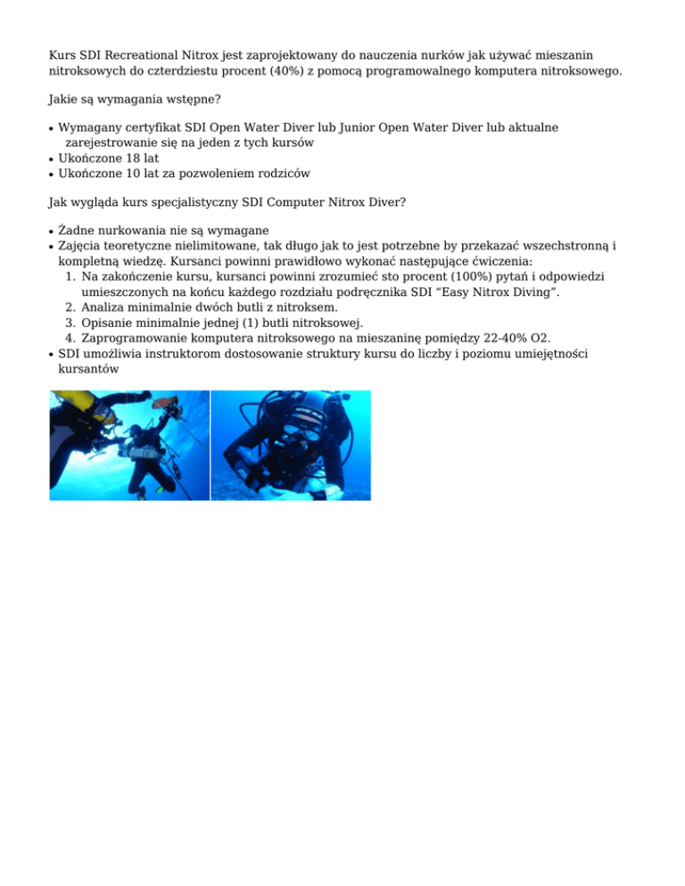 Kurs SDI Recreational Nitrox jest zaprojektowany do nauczenia nurków jak używać mieszanin nitroksowych do czterdziestu procent (40%) z pomocą programowalnego komputera nitroksowego. Jakie są wymagania wstępne? ● ● ● Wymagany certyfikat SDI Open Water Diver lub Junior Open Water Diver lub aktualne zarejestrowanie się na jeden z tych kursów Ukończone 18 lat Ukończone 10 lat za pozwoleniem rodziców Jak wygląda kurs specjalistyczny SDI Computer Nitrox Diver? ● ● ● Żadne nurkowania nie są wymagane Zajęcia teoretyczne nielimitowane, tak długo jak to jest potrzebne by przekazać wszechstronną i kompletną wiedzę. Kursanci powinni prawidłowo wykonać następujące ćwiczenia: 1. Na zakończenie kursu, kursanci powinni zrozumieć sto procent (100%) pytań i odpowiedzi umieszczonych na końcu każdego rozdziału podręcznika SDI “Easy Nitrox Diving”. 2. Analiza minimalnie dwóch butli z nitroksem. 3. Opisanie minimalnie jednej (1) butli nitroksowej. 4. Zaprogramowanie komputera nitroksowego na mieszaninę pomiędzy 22-40% O2. SDI umożliwia instruktorom dostosowanie struktury kursu do liczby i poziomu umiejętności kursantów