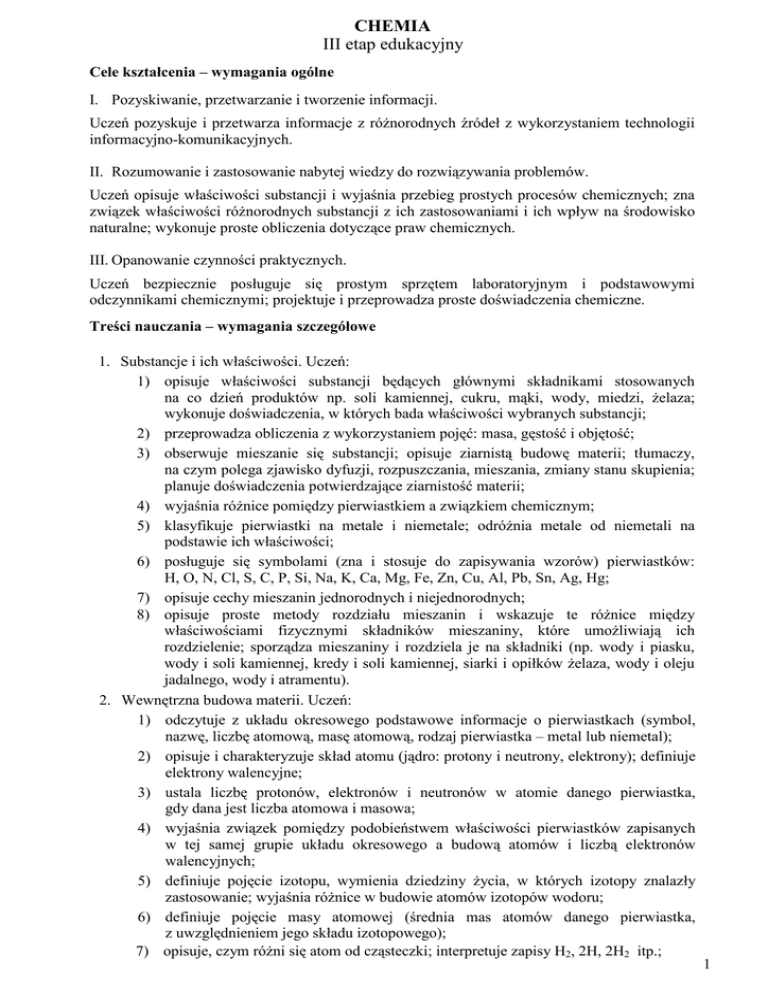 CHEMIA III etap edukacyjny Cele kształcenia – wymagania ogólne I. Pozyskiwanie, przetwarzanie i tworzenie informacji. Uczeń pozyskuje i przetwarza informacje z róŜnorodnych źródeł z wykorzystaniem technologii informacyjno-komunikacyjnych. II. Rozumowanie i zastosowanie nabytej wiedzy do rozwiązywania problemów. Uczeń opisuje właściwości substancji i wyjaśnia przebieg prostych procesów chemicznych; zna związek właściwości róŜnorodnych substancji z ich zastosowaniami i ich wpływ na środowisko naturalne; wykonuje proste obliczenia dotyczące praw chemicznych. III. Opanowanie czynności praktycznych. Uczeń bezpiecznie posługuje się prostym sprzętem laboratoryjnym i podstawowymi odczynnikami chemicznymi; projektuje i przeprowadza proste doświadczenia chemiczne. Treści nauczania – wymagania szczegółowe 1. Substancje i ich właściwości. Uczeń: 1) opisuje właściwości substancji będących głównymi składnikami stosowanych na co dzień produktów np. soli kamiennej, cukru, mąki, wody, miedzi, Ŝelaza; wykonuje doświadczenia, w których bada właściwości wybranych substancji; 2) przeprowadza obliczenia z wykorzystaniem pojęć: masa, gęstość i objętość; 3) obserwuje mieszanie się substancji; opisuje ziarnistą budowę materii; tłumaczy, na czym polega zjawisko dyfuzji, rozpuszczania, mieszania, zmiany stanu skupienia; planuje doświadczenia potwierdzające ziarnistość materii; 4) wyjaśnia róŜnice pomiędzy pierwiastkiem a związkiem chemicznym; 5) klasyfikuje pierwiastki na metale i niemetale; odróŜnia metale od niemetali na podstawie ich właściwości; 6) posługuje się symbolami (zna i stosuje do zapisywania wzorów) pierwiastków: H, O, N, Cl, S, C, P, Si, Na, K, Ca, Mg, Fe, Zn, Cu, Al, Pb, Sn, Ag, Hg; 7) opisuje cechy mieszanin jednorodnych i niejednorodnych; 8) opisuje proste metody rozdziału mieszanin i wskazuje te róŜnice między właściwościami fizycznymi składników mieszaniny, które umoŜliwiają ich rozdzielenie; sporządza mieszaniny i rozdziela je na składniki (np. wody i piasku, wody i soli kamiennej, kredy i soli kamiennej, siarki i opiłków Ŝelaza, wody i oleju jadalnego, wody i atramentu). 2. Wewnętrzna budowa materii. Uczeń: 1) odczytuje z układu okresowego podstawowe informacje o pierwiastkach (symbol, nazwę, liczbę atomową, masę atomową, rodzaj pierwiastka – metal lub niemetal); 2) opisuje i charakteryzuje skład atomu (jądro: protony i neutrony, elektrony); definiuje elektrony walencyjne; 3) ustala liczbę protonów, elektronów i neutronów w atomie danego pierwiastka, gdy dana jest liczba atomowa i masowa; 4) wyjaśnia związek pomiędzy podobieństwem właściwości pierwiastków zapisanych w tej samej grupie układu okresowego a budową atomów i liczbą elektronów walencyjnych; 5) definiuje pojęcie izotopu, wymienia dziedziny Ŝycia, w których izotopy znalazły zastosowanie; wyjaśnia róŜnice w budowie atomów izotopów wodoru; 6) definiuje pojęcie masy atomowej (średnia mas atomów danego pierwiastka, z uwzględnieniem jego składu izotopowego); 7) opisuje, czym róŜni się atom od cząsteczki; interpretuje zapisy H2, 2H, 2H2 itp.; 1 8) opisuje rolę elektronów walencyjnych w łączeniu się atomów; 9) na przykładzie cząsteczek H2, Cl2, N2, CO2, H2O, HCl, NH3 opisuje powstawanie wiązań atomowych (kowalencyjnych); zapisuje wzory sumaryczne i strukturalne tych cząsteczek; 10) definiuje pojęcie jonów i opisuje, jak powstają; zapisuje elektronowo mechanizm powstawania jonów, na przykładzie Na, Mg, Al, Cl, S; opisuje powstawanie wiązania jonowego; 11) porównuje właściwości związków kowalencyjnych i jonowych (stan skupienia, rozpuszczalność w wodzie, temperatury topnienia i wrzenia); 12) definiuje pojęcie wartościowości jako liczby wiązań, które tworzy atom, łącząc się z atomami innych pierwiastków; odczytuje z układu okresowego wartościowość maksymalną dla pierwiastków grup: 1., 2., 13., 14., 15., 16. i 17. (względem tlenu i wodoru); 13) rysuje wzór strukturalny cząsteczki związku dwupierwiastkowego (o wiązaniach kowalencyjnych) o znanych wartościowościach pierwiastków; 14) ustala dla prostych związków dwupierwiastkowych, na przykładzie tlenków: nazwę na podstawie wzoru sumarycznego; wzór sumaryczny na podstawie nazwy; wzór sumaryczny na podstawie wartościowości. 3. Reakcje chemiczne. Uczeń: 1) opisuje róŜnice w przebiegu zjawiska fizycznego i reakcji chemicznej; podaje przykłady zjawisk fizycznych i reakcji chemicznych zachodzących w otoczeniu człowieka; planuje i wykonuje doświadczenia ilustrujące zjawisko fizyczne i reakcję chemiczną; 2) opisuje, na czym polega reakcja syntezy, analizy i wymiany; podaje przykłady róŜnych typów reakcji i zapisuje odpowiednie równania; wskazuje substraty i produkty; dobiera współczynniki w równaniach reakcji chemicznych; obserwuje doświadczenia ilustrujące typy reakcji i formułuje wnioski; 3) definiuje pojęcia: reakcje egzoenergetyczne (jako reakcje, którym towarzyszy wydzielanie się energii do otoczenia, np. procesy spalania) i reakcje endoenergetyczne (do przebiegu których energia musi być dostarczona, np. procesy rozkładu – pieczenie ciasta); 4) oblicza masy cząsteczkowe prostych związków chemicznych; dokonuje prostych obliczeń związanych z zastosowaniem prawa stałości składu i prawa zachowania masy. 4. Powietrze i inne gazy. Uczeń: 1) wykonuje lub obserwuje doświadczenie potwierdzające, Ŝe powietrze jest mieszaniną; opisuje skład i właściwości powietrza; 2) opisuje właściwości fizyczne i chemiczne azotu, tlenu, wodoru, tlenku węgla(IV); odczytuje z układu okresowego pierwiastków i innych źródeł wiedzy informacje o azocie, tlenie i wodorze; planuje i wykonuje doświadczenia dotyczące badania właściwości wymienionych gazów; 3) wyjaśnia, dlaczego gazy szlachetne są bardzo mało aktywne chemicznie; wymienia ich zastosowania; 4) pisze 
