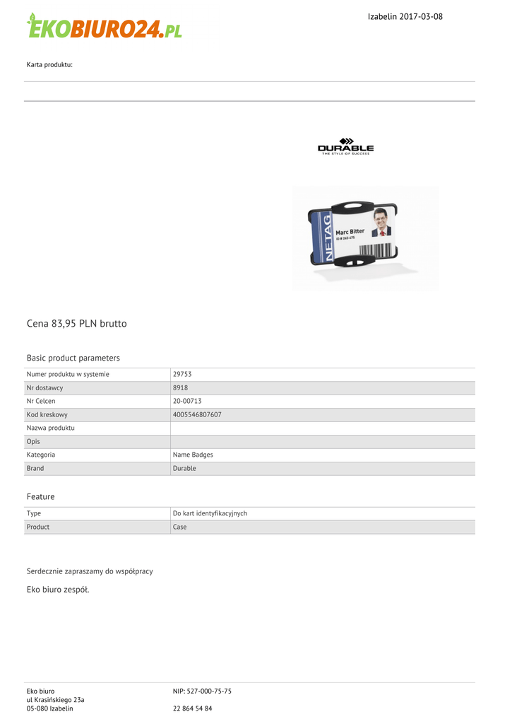 Izabelin 2017-03-08 Karta produktu: Cena 83,95 PLN brutto Basic product parameters Numer produktu w systemie 29753 Nr dostawcy 8918 Nr Celcen 20-00713 Kod kreskowy 4005546807607 Nazwa produktu Opis Kategoria Name Badges Brand Durable Feature Type Do kart identyfikacyjnych Product Case Serdecznie zapraszamy do współpracy Eko biuro zespół. Eko biuro ul Krasińskiego 23a 05-080 Izabelin NIP: 527-000-75-75 22 864 54 84