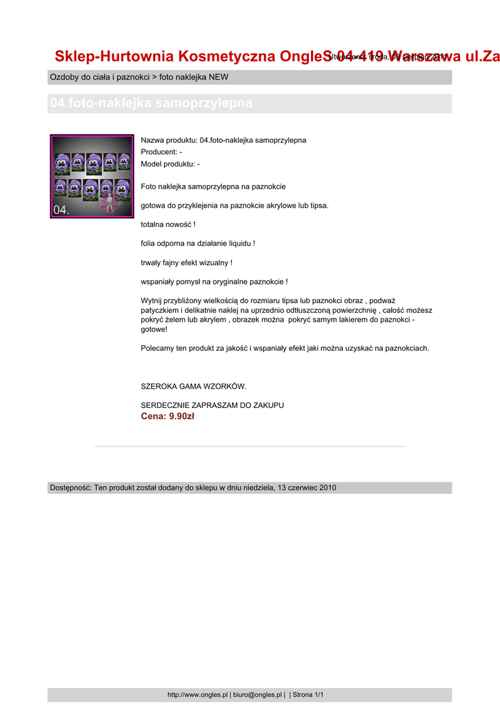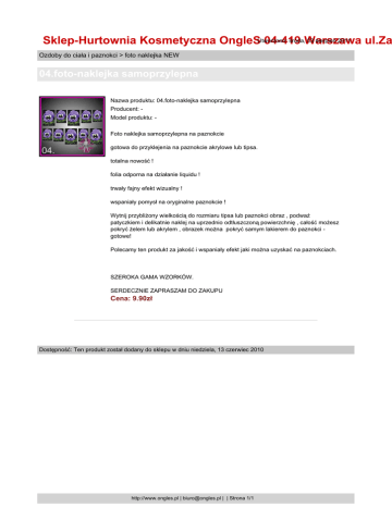 środa,Warszawa 03 sierpień 2011 Sklep-Hurtownia Kosmetyczna OngleSUtworzono: 04-419 ul.Za Ozdoby do ciała i paznokci > foto naklejka NEW 04.foto-naklejka samoprzylepna Nazwa produktu: 04.foto-naklejka samoprzylepna Producent: Model produktu: Foto naklejka samoprzylepna na paznokcie gotowa do przyklejenia na paznokcie akrylowe lub tipsa. totalna nowość ! folia odporna na działanie liquidu ! trwały fajny efekt wizualny ! wspaniały pomysł na oryginalne paznokcie ! Wytnij przybliżony wielkością do rozmiaru tipsa lub paznokci obraz , podważ patyczkiem i delikatnie naklej na uprzednio odtłuszczoną powierzchnię , całość możesz pokryć żelem lub akrylem , obrazek można pokryć samym lakierem do paznokci gotowe! Polecamy ten produkt za jakość i wspaniały efekt jaki można uzyskać na paznokciach. SZEROKA GAMA WZORKÓW. SERDECZNIE ZAPRASZAM DO ZAKUPU Cena: 9.90zł Dostępność: Ten produkt został dodany do sklepu w dniu niedziela, 13 czerwiec 2010 http://www.ongles.pl | [email protected] | | Strona 1/1