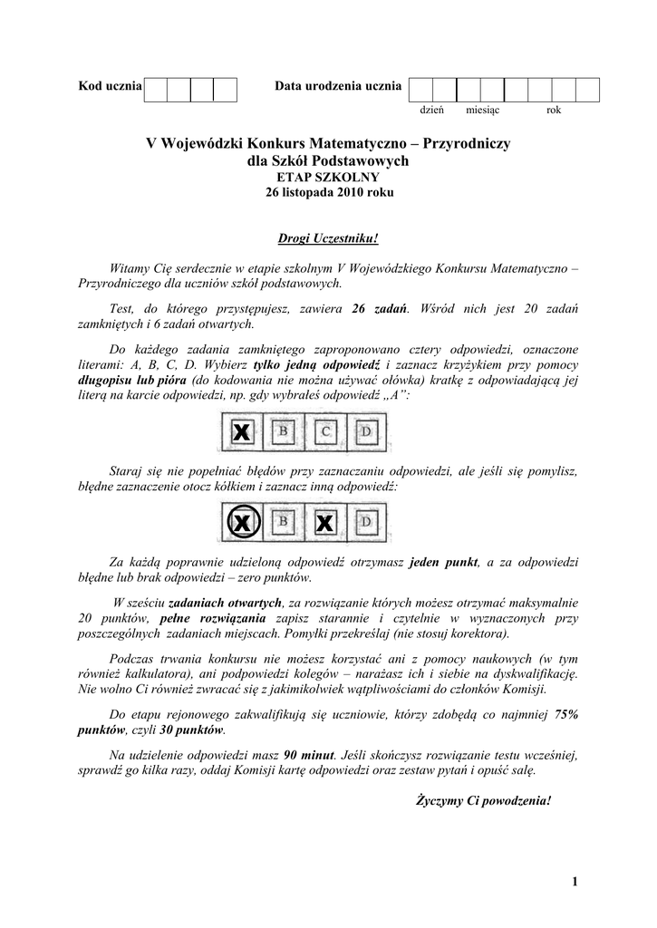 Kod ucznia Data urodzenia ucznia dzień miesiąc rok V Wojewódzki Konkurs Matematyczno – Przyrodniczy dla Szkół Podstawowych ETAP SZKOLNY 26 listopada 2010 roku Drogi Uczestniku! Witamy Cię serdecznie w etapie szkolnym V Wojewódzkiego Konkursu Matematyczno – Przyrodniczego dla uczniów szkół podstawowych. Test, do którego przystępujesz, zawiera 26 zadań. Wśród nich jest 20 zadań zamkniętych i 6 zadań otwartych. Do każdego zadania zamkniętego zaproponowano cztery odpowiedzi, oznaczone literami: A, B, C, D. Wybierz tylko jedną odpowiedź i zaznacz krzyżykiem przy pomocy długopisu lub pióra (do kodowania nie można używać ołówka) kratkę z odpowiadającą jej literą na karcie odpowiedzi, np. gdy wybrałeś odpowiedź „A”: X Staraj się nie popełniać błędów przy zaznaczaniu odpowiedzi, ale jeśli się pomylisz, błędne zaznaczenie otocz kółkiem i zaznacz inną odpowiedź: X X Za każdą poprawnie udzieloną odpowiedź otrzymasz jeden punkt, a za odpowiedzi błędne lub brak odpowiedzi – zero punktów. W sześciu zadaniach otwartych, za rozwiązanie których możesz otrzymać maksymalnie 20 punktów, pełne rozwiązania zapisz starannie i czytelnie w wyznaczonych przy poszczególnych zadaniach miejscach. Pomyłki przekreślaj (nie stosuj korektora). Podczas trwania konkursu nie możesz korzystać ani z pomocy naukowych (w tym również kalkulatora), ani podpowiedzi kolegów – narażasz ich i siebie na dyskwalifikację. Nie wolno Ci również zwracać się z jakimikolwiek wątpliwościami do członków Komisji. Do etapu rejonowego zakwalifikują się uczniowie, którzy zdobędą co najmniej 75% punktów, czyli 30 punktów. Na udzielenie odpowiedzi masz 90 minut. Jeśli skończysz rozwiązanie testu wcześniej, sprawdź go kilka razy, oddaj Komisji kartę odpowiedzi oraz zestaw pytań i opuść salę. Życzymy Ci powodzenia! 1 ZADANIA ZAMKNIĘTE: Zadanie 1. (1 pkt) Wiele danych przyrodniczych zapamiętujemy w formie przybliżonej. Przyjmując, że powierzchnia Polski wynosi około 312 683 km2, podaj przybliżenie tej liczby z dokładnością do tysięcy. A. 313 tys. km2 B. 300 tys. km2 C. 310 tys. km2 D. 312 tys. km2 Zadanie 2. (1 pkt) Do zapisu której z podanych liczb dwucyfrowych w systemie rzymskim trzeba użyć najwięcej znaków? A. 79 B. 46 C. 88 D. 37 Zadanie 3. (1 pkt) Diagram przedstawia frekwencję (obecność) uczniów klasy szóstej na zajęciach lekcyjnych od poniedziałku do czwartku. Ilu uczniów było obecnych w szkole w piątek, jeśli średnia liczba obecnych w tej klasie w minionym tygodniu wynosiła 18 uczniów. 25 liczba obecnych A. 17 uczniów B. 18 uczniów C. 20 uczniów D. 19 uczniów 21 19 20 16 15 15 10 5 0 pn śr wt czw Zadanie 4. (1 pkt) Cztery mapy mają równe wymiary, ale są wykonane w różnych skalach. Wskaż, która z nich obejmuje największy obszar. A. 1 : 600 000 B. 1 : 650 000 C. 1 : 400 000 D. 1 : 450 000 Zadanie 5. (1 pkt) W pewnym trójkącie każdy kolejny kąt ma miarę o 18 większą od poprzedniego kąta. Oblicz, jaką miarę będzie mieć największy z kątów tego trójkąta. A. 42 B. 84 C. 60 D. 78 Zadanie 6. (1 pkt) W garnku znajdowało się 2 23 litra zupy. Podczas gotowania zupy pozostało w garnku? A. 2 13 24 litra B. 1 3 litra C. 1 19 24 litra 1 8 zupy odparowała. Ile litrów D. 2 13 litra 2 Zadanie 7. (1 pkt) Pan Truchciński, idąc szybkim tempem, stawia kroki o długości 7dm, a jego syn maszeruje, stawiając stopy co 45cm. W jakiej odległości od progu domu ich ślady po raz pierwszy się pokryją, gdy pójdą jeden za drugim w tym samym kierunku? A. 6,3m B. 31,5m C. 63m D. 3,15m Zadanie 8. (1 pkt) Członkowie kółka przyrodniczego zgłosili się do pomocy przy sadzeniu lasu. Pracę rozplanowano na dwa dni. Pierwszego dnia uczniowie posadzili 0,45 przydzielonych sadzonek, a drugiego dnia pozostałe 165 drzewek. Wskaż, które równanie pozwoli obliczyć, ile drzewek posadzili łącznie uczniowie, jeśli przydzieloną im liczbę sadzonek oznaczymy przez x. A. 0,45x 165 B. 0,45 165 x C. 0,45x 165 x D. 0,45x x 165 Zadanie 9. (1 pkt) Arystoteles, jeden z najwybitniejszych uczonych starożytnych, żył w latach 384 – 322 p.n.e., natomiast wybitny filozof i badacz przyrody naszej ery, Leonardo da Vinci, żył w latach 1452 – 1519. Oblicz, ile lat upłynęło pomiędzy narodzinami tych uczonych. A. 1836 lat B. 1130 lat C. 1774 lata D. 1068 lat Zadanie 10. (1 pkt) Oblicz, ile co najmniej drutu potrzeba, aby wykonać z niego szkielety trzech jednakowych sześcianów o krawędzi 8cm każdy. Przyjmij, że kawałki drutu będą ze sobą zlutowane, dlatego nie musisz doliczać drutu na ich połączenie. A. 96cm B. 288cm C. 48cm D. 144cm Zadanie 11. (1 pkt) Poprzez wzrost organizmu rozumiemy: A. B. C. D. zdolność do wydawania potomstwa, proces wytwarzania pokarmu, zmianę wyglądu i sposobu funkcjonowania organizmu, zwiększanie się liczby, rozmiarów komórek w organizmie. Zadanie 12. (1 pkt) Kraina geograficzna silnie przekształcona przez człowieka to: A. Pojezierze Suwalskie, C. Wyżyna Śląska, B. Bieszczady, D. Nizina Północnopodlaska. Zadanie 13. (1 pkt) W sytuacji zagrożenia życia i zdrowia mieszkańców płonącego wieżowca należy jak najszybciej powiadomić służby ratownicze, dzwoniąc pod numer telefonu: A. 112 B. 102 C. 100 D. 122 3 Zadanie 14. (1 pkt) Wklęsłe formy terenu przedstawione zostały na rysunkach: rys. I A. I i II rys. II B. III i IV C. I i III rys. III rys. IV D. II i IV Zadanie 15. (1 pkt) Narządem układu pokarmowego jest: B. przełyk, A. jajnik, C. tchawica, D. krtań. Zadanie 16. (1 pkt) Rozpoznaj, jakie elementy budowy ciała zwierząt wielokomórkowych przedstawiają kolejne rysunki I, II, III i IV. I A. B. C. D. II I- komórka ; II- układ narządów I- tkanka ; II- układ narządów I- narząd ; II- układ narządów I- komórka ; II- narząd III ; III- tkanka ; III- komórka ; III- tkanka ; III- układ narządów IV ; IV- narząd ; IV- narząd ; IV