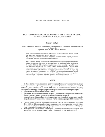ROCZNIKI NAUKPRZEMYS£U ROLNICZYCH, SERIA G, T. 96,DO z. 1, 2009 DOSTOSOWANIA POLSKIEGO SPO¯YWCZEGO WARUNKÓW UE 7 DOSTOSOWANIA POLSKIEGO PRZEMYS£U SPO¯YWCZEGO DO WARUNKÓW UNII EUROPEJSKIEJ1 Roman Urban Instytut Ekonomiki Rolnictwa i Gospodarki ¯ywnociowej  Pañstwowy Instytut Badawczy w Warszawie Dyrektor: prof. dr hab. Andrzej Kowalski S³owa kluczowe: przemys³ spo¿ywczy, integracja z UE, rynek krajowy, eksport, produkcja, inwestycje, struktura firm, wyniki finansowe Key words: food industry, European integration, domestic market, export, production, investments, structure of companies, financial results S y n o p s i s. Procesy dostosowawcze przemys³u spo¿ywczego do gospodarki rynkowej dobrze przygotowa³y ten sektor do funkcjonowania na wspólnym rynku europejskim. Po wejciu Polski do UE nast¹pi³o przyspieszenie rozwoju produkcji i sprzeda¿y wyrobów przemys³u spo¿ywczego. By³ to efekt wzrostu dochodów ludnoci i rozwoju krajowego rynku ¿ywnoci oraz bardzo wysokiego tempa wzrostu eksportu produktów rolnospo¿ywczych. Du¿a by³a aktywnoæ inwestycyjna producentów ¿ywnoci, do czego przyczyni³o siê wsparcie funduszami UE. Nast¹pi³a radykalna poprawa wyników i stanu finansowego przedsiêbiorstw tego sektora. Nie spe³ni³y siê obawy o masowej upad³oci firm krajowych i zagro¿eniu importem ¿ywnoci z rozwiniêtych krajów UE. WSTÊP O stanie dostosowania przemys³u spo¿ywczego do funkcjonowania na wspólnym rynku europejskim zadecydowa³y przemiany tego sektora do dzia³ania w systemie gospodarki rynkowej, jakie dokona³y siê w latach 1988-2003. Z punktu widzenia potrzeb integracji szczególnie wa¿ne by³y nastêpuj¹ce przemiany przetwórstwa rolno-spo¿ywczego2 :  gruntowna zmiana struktur w³asnociowych,  powstanie zró¿nicowanej i p³ynnej struktury podmiotowej, sprzyjaj¹cej konkurencji i umo¿liwiaj¹cej odtworzenie rynkowych mechanizmów regulacji,  przebudowa struktur produkcyjnych skutkuj¹ca rozwojem oferty towarowej ¿ywnoci, bogactwem asortymentowym i wzrostem wartoci dodanej do produktów rolnictwa, 1 2 Artyku³ ten jest wynikiem analiz prowadzonych w IERiG¯-PIB w Programie Wieloletnim 2005-2009 pt. Ekonomiczne i spo³eczne uwarunkowania rozwoju polskiej gospodarki ¿ywnociowej po wst¹pieniu Polski do Unii Europejskiej w zadaniu Ocena stanu polskiej gospodarki ¿ywnociowej po wejciu Polski do UE. Szerzej problem ten omówiono w monografii Przemiany przemys³u spo¿ywczego w latach 1988-2003 (red. R. Urban). IERIG¯. Studia i Monografie, z. 121, Warszawa 2004. 8 R. URBAN   postêp w efektywnoci produkcji mierzonej wydajnoci¹ pracy i zu¿yciem energii, przyspieszenie modernizacji potencja³u wytwórczego sektora, restrukturyzacja przedsiêbiorstw, dop³yw know-how w sferze zarz¹dzania, organizacji, marketingu, systemów jakoci itp. W przemianach tych istotn¹ rolê odegra³y du¿e inwestycje zagraniczne i szybka prywatyzacja przedsiêbiorstw pañstwowych, które w³¹czy³y sektor w procesy globalizacji. Efektem przemian by³o ukszta³towanie siê grupy du¿ych i rednich przedsiêbiorstw, stanowi¹cych trzon poszczególnych sektorów, które pod wzglêdem struktury zasobów, standardu jakociowego i sposobu dzia³ania nie ró¿ni³y siê istotnie od podobnych firm w krajach starej UE. W przeddzieñ integracji w wiêkszoci dzia³ów produkcji ¿ywnoci polskie firmy przemys³u spo¿ywczego mia³y wyrane przewagi cenowo-kosztowe nad producentami ¿ywnoci z krajów UE. Przemiany te mia³y trwa³y charakter i tworzy³y dobre perspektywy dla dalszego rozwoju polskiego przemys³u spo¿ywczego oraz dla zwiêkszania roli eksportu w tym rozwoju. ROZWÓJ PRZEMYS£U SPO¯YWCZEGO PO WEJCIU DO UNII EUROPEJSKIEJ Polski przemys³ spo¿ywczy dobrze wykorzysta³ przewagi, jakie osi¹gn¹³ w wyniku wczeniejszych przekszta³ceñ. Po wejciu Polski do UE wyst¹pi³o o¿ywienie produkcyjne w tym sektorze, którego sprzeda¿ od 2003 roku zwiêksza³a siê w tempie 6-7% rocznie. To o¿ywienie mia³o trwa³e podstawy, gdy¿:  pod wp³ywem wzrostu dochodów rozwija³ siê krajowy rynek ¿ywnoci i napojów,  rozwija siê równie¿ orientacja eksportowa przedsiêbiorstw, co wyra¿a siê wzrostem udzia³u eksportu w sprzeda¿y sektora (do 22% w 2007 roku). Skala przyspieszenia rozwoju przemys³u spo¿ywczego by³a du¿a. Po kilkuletnim okresie stagnacji (w latach 2000-2002) tempo wzrostu produkcji tego sektora od 2003 roku wynosi³o rednio 6,4% rocznie, a wartoæ produkcji sprzedanej (w cenach sta³ych) w 2007 roku by³a o ponad 40% wy¿sza ni¿ w 1999 roku i o 36,5% wy¿sza ni¿ w 2002 roku. Istotne jest tak¿e to, ¿e w ocenianym okresie przyrost produkcji przemys³u spo¿ywczego by³ ponad dwukrotnie wy¿szy ni¿ spo¿ycia krajowego czy te¿ produkcji towarowej rolnictwa (rys. 1). W latach 1999-2007 wartoæ produkcji przemys³u spo¿ywczego zwiêkszy³a siê o 43%, a spo¿ycia ¿ywnoci, napojów i wyrobów tytoniowych oraz towarowej produkcji rolnictwa o ok. 17,5%. Natomiast w okresie integrowania z UE (w latach 2002-2007) wskaniki te wynosi³y odpowiednio 36,5 i 13,5%. Ró¿nice wskaników wzrostu przemys³u spo¿ywczego, popytu krajowego i towarowej produkcji rolnictwa wynikaj¹ g³ównie z rosn¹cego udzia³u tego przemys³u w zaopatrzeniu rynku krajowego i w zagospodarowaniu produkcji rolnictwa, a tak¿e ze sta³ego wzrostu stopnia przetworzenia ¿ywnoci. Najszybciej i systematycznie rozwija siê wtórne przetwórstwo ¿ywnoci, którego wartoæ w 2007 roku by³a o ok. 60% wy¿sza ni¿ w 1999 roku i o 42,5% wy¿sza ni¿ w 2002 roku (rys. 2). W tym okresie wysoki by³ tak¿e wzrost pierwotnego przetwórstwa produktów rolnictwa, którego wartoæ by³a o 40% wy¿sza ni¿ w koñcu lat dziewiêædziesi¹tych i o 24% przekroczy³a poziom z 2002 roku. Spowolnienie tego przetwórstwa nast¹pi³o dopiero po niskich zbiorach 2006 i 2007 roku. Po wejciu do UE notujemy wyrane przyspieszenie rozwoju produkcji u¿ywek (napojów alkoholowych i wyrobów tytoniowych). Od czterech la