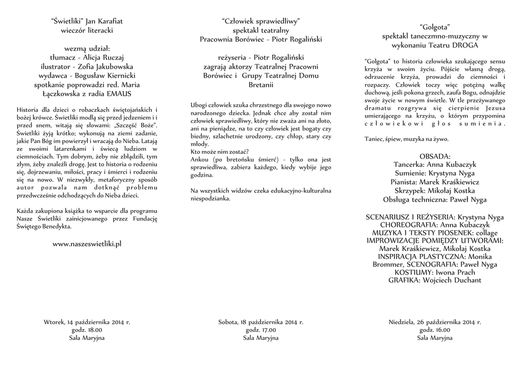 “Œwietliki” Jan Karafiat wieczór literacki wezm¹ udzia³: t³umacz - Alicja Ruczaj ilustrator - Zofia Jakubowska wydawca - Bogus³aw Kiernicki spotkanie poprowadzi red. Maria £¹czkowska z radia EMAUS Historia dla dzieci o robaczkach œwiêtojañskich i bo¿ej krówce. Œwietliki modl¹ siê przed jedzeniem i i przed snem, witaj¹ siê s³owami: „Szczêœæ Bo¿e”. Œwietliki ¿yj¹ krótko; wykonuj¹ na ziemi zadanie, jakie Pan Bóg im powierzy³ i wracaj¹ do Nieba. Lataj¹ ze swoimi latarenkami i œwiec¹ ludziom w ciemnoœciach. Tym dobrym, ¿eby nie zb³¹dzili, tym z³ym, ¿eby znaleŸli drogê. Jest to historia o rodzeniu siê, dojrzewaniu, mi³oœci, pracy i œmierci i rodzeniu siê na nowo. W niezwyk³y, metaforyczny sposób autor pozwala nam dotkn¹æ problemu przedwczeœnie odchodz¹cych do Nieba dzieci. “Cz³owiek sprawiedliwy” spektakl teatralny Pracownia Borówiec - Piotr Rogaliñski re¿yseria - Piotr Rogaliñski zagraj¹ aktorzy Teatralnej Pracowni Borówiec i Grupy Teatralnej Domu Bretanii Ubogi cz³owiek szuka chrzestnego dla swojego nowo narodzonego dziecka. Jednak chce aby zosta³ nim cz³owiek sprawiedliwy, który nie zwa¿a ani na z³oto, ani na pieni¹dze, na to czy cz³owiek jest bogaty czy biedny, szlachetnie urodzony, czy ch³op, stary czy m³ody. Kto mo¿e nim zostaæ? Ankou (po bretoñsku œmieræ) - tylko ona jest sprawiedliwa, zabiera ka¿dego, kiedy wybije jego godzina. Na wszystkich widzów czeka edukacyjno-kulturalna niespodzianka. Ka¿da zakupiona ksi¹¿ka to wsparcie dla programu Nasze Œwietliki zainicjowanego przez Fundacjê Œwiêtego Benedykta. “Golgota” to historia cz³owieka szukaj¹cego sensu krzy¿a w swoim ¿yciu. Pójœcie w³asn¹ drog¹, odrzucenie krzy¿a, prowadzi do ciemnoœci i rozpaczy. Cz³owiek toczy wiêc potê¿n¹ walkê duchow¹, jeœli pokona grzech, zaufa Bogu, odnajdzie swoje ¿ycie w nowym œwietle. W tle prze¿ywanego dramatu rozgrywa siê cierpienie Jezusa umieraj¹cego na krzy¿u, o którym przypomina cz³owiekowi g³os sumienia. Taniec, œpiew, muzyka na ¿ywo. OBSADA: Tancerka: Anna Kubaczyk Sumienie: Krystyna Nyga Pianista: Marek Kraœkiewicz Skrzypek: Miko³aj Kostka Obs³uga techniczna: Pawe³ Nyga SCENARIUSZ I RE¯YSERIA: Krystyna Nyga CHOREOGRAFIA: Anna Kubaczyk MUZYKA I TEKSTY PIOSENEK: collage IMPROWIZACJE POMIÊDZY UTWORAMI: Marek Kraœkiewicz, Miko³aj Kostka INSPIRACJA PLASTYCZNA: Monika Brommer, SCENOGRAFIA: Pawe³ Nyga KOSTIUMY: Iwona Prach GRAFIKA: Wojciech Duchant www.naszeswietliki.pl Wtorek, 14 paŸdziernika 2014 r. godz. 18.00 Sala Maryjna “Golgota” spektakl taneczmno-muzyczny w wykonaniu Teatru DROGA Sobota, 18 paŸdziernika 2014 r. godz. 17.00 Sala Maryjna Niedziela, 26 paŸdziernika 2014 r. godz. 16.00 Sala Maryjna “Aktualny stan wiedzy o p³ótnach grobowych Jezusa Chrystusa” prelekcja Akcja Katolicka Hanna Szweycer W treœci przedstawionych zagadnieñ znajduj¹ siê: Ca³un Turyñski z utrwalonym obrazem ukrzy¿owanego, martwego Chrystusa, Sudarion z Oviedo czyli chusta, któr¹ owiniêto po œmierci na krzy¿u g³owê Chrystusa i Chusta z Manopello, wczeœniej znana jako Chusta z Kamulii a przywieziona do Rzymu w VIII w. zwana Weronik¹ od s³ów vera i eikon (prawdziwy obraz). Jesienne Dni Kultury Chrzeœcijañskiej Parafia Nawiedzenia Najœwiêtszej Marii Panny paŸdziernik 2014 os. Bohaterów II Wojny Œwiatowej 88 61-382 Poznañ Parafialny Odzia³ Akcji Katolickiej parafia Nawiedzenia Najœwiêtszej Marii Panny Wtorek, 28 paŸdziernika 2014 r. godz. 17.00 Sala Maryjna przy wspó³pracy z Rad¹ Osiedla Rataje