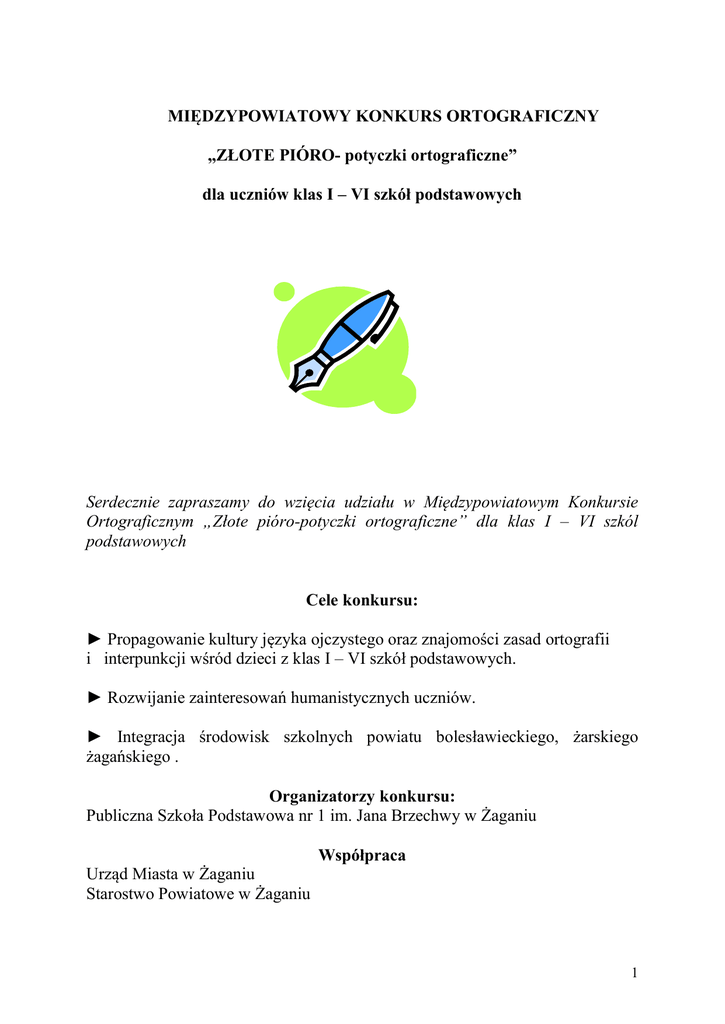 MIĘDZYPOWIATOWY KONKURS ORTOGRAFICZNY „ZŁOTE PIÓRO- potyczki ortograficzne” dla uczniów klas I – VI szkół podstawowych Serdecznie zapraszamy do wzięcia udziału w Międzypowiatowym Konkursie Ortograficznym „Złote pióro-potyczki ortograficzne” dla klas I – VI szkól podstawowych Cele konkursu: ► Propagowanie kultury języka ojczystego oraz znajomości zasad ortografii i interpunkcji wśród dzieci z klas I – VI szkół podstawowych. ► Rozwijanie zainteresowań humanistycznych uczniów. ► Integracja środowisk szkolnych powiatu bolesławieckiego, żarskiego żagańskiego . Organizatorzy konkursu: Publiczna Szkoła Podstawowa nr 1 im. Jana Brzechwy w Żaganiu Współpraca Urząd Miasta w Żaganiu Starostwo Powiatowe w Żaganiu 1 Patronat medialny: 1. Kuratorium Oświaty w Gorzowie Wielkopolskim 2. Urząd Miasta w Żaganiu 3. „Gazeta Lubuska” 4. Centrum Edukacji Humanistycznej „Logos” 5. Starostwo Powiatowe w Żaganiu 6. „Gazeta Regionalna” Nasz adres : Publiczna Szkoła Podstawowa nr 1 im. Jana Brzechwy ul. Wojska Polskiego 7 68 – 100 Żagań Tel. 4781677 lub 4782191 www.jedynka.zagan.pl REGULAMIN MIĘDZYPOWIATOWEGO KONKURSU ORTOGRAFICZNEGO „ZŁOTE PIÓRO- potyczki ortograficzne” dla uczniów szkół podstawowych Organizacja i przebieg konkursu Konkurs organizowany jest trzystopniowo : I stopień – eliminacje szkolne II stopień - eliminacje rejonowe do 15 lutego 2016 26 lutego 2016 (godz. ustala Rejonowy Organizator Konkursu) III stopień – eliminacje międzypowiatowe 19 marca 2016 godz. 09.00 Eliminacje szkolne przeprowadzają nauczyciele wytypowani przez dyrektora szkoły. Na eliminacjach rejonowych obowiązuje dyktando i test, które wyłonią uczestników eliminacji powiatowych . Na eliminacjach międzypowiatowych przeprowadza się dyktando + test, które wyłonią zwycięzcę : 1 , 2, 3 miejsca w każdej kategorii wiekowej. 2 Kategorie wiekowe uczestników : Kategoria I : Kategoria II : Kategoria III : Kategoria IV : Kategoria V : Kategoria VI : klasa 1 klasa 2 klasa 3 klasa 4 klasa 5 klasa 6 I ETAP Eliminacje szkolne: Eliminacje szkolne przeprowadzają Szkolne Komisje Konkursowe w dowolnej formie. Za organizację i przebieg eliminacji szkolnych odpowiedzialni są dyrektorzy szkół . Eliminacje szkolne mają na celu wyłonienie uczestników Eliminacji Rejonowych. Po przeprowadzeniu eliminacji szkolnych (do 15 lutego 2016 r.) Szkolna Komisja Konkursowa przesyła kartę zgłoszeniową oraz protokoły(załącznik=pełna wersja) z konkursu drogą elektroniczną(wyłącznie e-mail) do Rejonowego Organizatora Konkursu(patrz :Organizatorzy eliminacji rejonowych – strona 7,8,9) do dnia 17 lutego 2016r. II ETAP Eliminacje rejonowe : Rejonowy Organizator Konkursu powołuje komisje czuwające nad przebiegiem konkursu w każdej kategorii wiekowej. Eliminacje rejonowe składają się z dwóch etapów: I etap – dyktando II etap – potyczki ortograficzne ( test) Test i dyktando oraz karta zgłoszeniowa do III etapu konkursu wraz z protokołem przygotowanym przez nauczycieli – organizatorów konkursu 3 z Publicznej Szkoły Podstawowej nr 1 w Żaganiu zostaną przesłane do Rejonowych Organizatorów Konkursu drogą elektroniczną do dnia 19 lutego 2016 r. Rejonowy Organizator Konkursu zgłasza do eliminacji międzypowiatowych tych uczniów, którzy w eliminacjach rejonowych zajęli 1, 2, 3 miejsce w swoich kategoriach wiekowych. Rejonowe Komisje Konkursowe podają do publicznej wiadomości ilość zdobytych punktów przez każdego uczestnika konkursu oraz miejsce, które zajął w klasyfikacji ogólnej. Po przeprowadzeniu eliminacji rejonowych(26 lutego2016 r.) Rejonowa Komisja Konkursowa przesyła kartę zgłoszeniową do III etapu konkursu wraz z protokołem z konkursu drogą elektroniczną do Organizatora Konkursu w ciągu 5 dni na adres: [email protected] III ETAP Eliminacje międzypowiatowe Eliminacje międzypowiatowe przeprowadza Międzypowiatowa Komisja Konkursowa, która powołuje komisje czuwające nad przebiegiem konkursu w każdej kategorii wiekowej. Eliminacje międzypowiatowe składają się z dwóch etapów: I etap – dyktando II etap – potyczki ortograficzne ( test) Po przeprowadzeniu eliminacji międzypowiatowych 19 marca 2016r. Międzypowiatowy Organizator Konkursu wyłania laureatów we wszystkich kategoriach : - klasy I – 1,2,3, miejsce – złote, srebrne i brązowe pióro - klasy II – 1, 2, 3, miejsce – złote, srebrne i brązowe pióro - klasy III – 1,2, 3, miejsce – złote, srebrne i brązowe pióro - klasy IV - 1, 2 , 3, miejsce – złote, srebrne i brązowe pióro - klasy V - 1,2,3, miejsce -złote, srebrne i brązowe pióro - klasy VI – 1,2,3, miejsce - złote, srebrne i brązowe pióro Międzypowiatowa Komisja Konkursowa podaje do publicznej wiadomości ilość zdobytych punktów przez każdego uczestnika konkursu oraz miejsce, które zajął w klasyfikacji ogólnej. Wszyscy uczestnicy Międzypowiatowego Konkursu Ortograficznego otrzymują pamiątkowe dyplomy. 4 Wyniki finału konkursu oraz lista laureatów i finalistów opublikowane zostaną na stronie internetowej www.jedynka.zagan.pl w ciągu 10 dni od daty przeprowadzenia konkursu międzypowiatowego . Na łamach Gazety Lubuskiej zostanie opublikowana lista laureatów Międzypowiatowego Konkursu Ortograficznego. 5 POSTANOWIENIA KOŃCOWE : 1. Zgłoszenia do konkursu , czyli do etapu rejonowego oraz protokoły z przebiegu konkursu(pełna ich wersje składająca się z 3 stron) będą przyjmowane tylko drogą elektroniczną do 17.02.2016 (wypełnione tylko na komputerze: e-mail). Nie przyjmujemy faxów, scanów dokumentów. 2. Udział w konkursie jest dobrowolny i oznacza przyjęcie w pełni postanowień niniejszego regulaminu. 3. Decyzja komisji konkursowych na każdym etapie jest ostateczna. 4. Podczas pisania testów nie wolno korzystać z żadnej pomocy , porozumiewać się z innymi uczestnikami, opuszczać sali przed zebraniem prac, korzystać z 