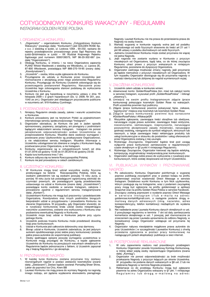 COTYGODNIOWY KONKURS WAKACYJNY - REGULAMIN INSTAGRAM GOLDEN ROSE POLSKA I. ORGANIZACJA KONKURSU 1. 2. 3. 4. 5. „Organizator” – organizatorem Konkursu „Cotygodniowy Konkurs Wakacyjny” (zwanego dalej: “Konkursem”) jest GOLDEN ROSE Sp. z o.o. z siedzib w odzi, ul. Lodowa 126A , 93-232, wpisana do rejestru przedsi biorców prowadzonego przez S d Rejonowy dla odzi- ródmie cia w odzi – XX Wydzia Krajowego Rejestru S dowego pod numerem 0000139375, NIP 98-20-302-667 (zw. dalej “Organizatorem”). Obs ug Konkursu, w imieniu i na rzecz Organizatora zapewnia PLAN2 Witold Wasilewski z siedzib we W oc awku, ul. Lipowa 2E, 87-800 W oc awek, posiadaj ca NIP 888-270-19-95 (zwany dalej: „Koordynatorem”). „Uczestnik” – osoba, która wy le zg oszenie do Konkursu. Przyst pienie do udzia u w Konkursie przez Uczestnika jest równoznaczne z akceptacj przez niego postanowie Regulaminu Konkursu. Przyst puj c do Konkursu Uczestnik zobowi zuje si do przestrzegania postanowie Regulaminu. Naruszenie przez Uczestnika tego zobowi zania stanowi podstaw do wykluczenia Uczestnika z Konkursu. Konkurs nie jest gr hazardow w rozumieniu ustawy z dnia 19 listopada 2009 r. o grach hazardowych (Dz. U. 2009, Nr 201, poz. 1540 ze zm.). Organizator jest sk adaj cym przyrzeczenie publiczne w rozumieniu art. 919 Kodeksu Cywilnego. II. POSTANOWIENIA OGÓLNE 1. 2. 3. 4. 5. 6. 7. Niniejszy Regulamin okre la zasady, zakres i warunki uczestnictwa w Konkursie. Konkurs prowadzony jest na terytorium Polski za po rednictwem internetowego serwisu spo eczno ciowego “Instagram”. Organizator o wiadcza, e Konkurs nie jest w aden sposób sponsorowany, popierany, zarz dzany, ani powi zany z podmiotami b d cymi w a cicielami serwisu Instagram. Instagram nie ponosi jakiejkolwiek odpowiedzialno ci wobec Uczestników za przeprowadzenie Konkursu. Wszelkie dane osobowe wymagane i powierzane przez U ytkowników s przekazywane Organizatorowi, a nie w a cicielowi serwisu Instagram. Wszelkie informacje o Uczestniku udost pniane lub zbierane w zwi zku z Konkursem b d przetwarzane przez Organizatora, a nie Instagram. Konkursy organizowane s w cotygodniowych turach od dnia 01.07.2016 od godziny 15:00 do 01.09.2016 do godziny 23:59. Ka da tura konkursowa trwa 7 dni. Konkurs odbywa si na terenie Rzeczypospolitej Polskiej. Konkurs nie jest prowadzony w celach zarobkowych. III. UCZESTNICY KONKURSU 1. 2. 3. 4. 5. 6. 7. W Konkursie mog bra udzia wszystkie osoby fizyczne Rzeczpospolitej Polskiej, które s przebywaj ce na terenie osobami pe noletnimi lub s osobami powy ej 13 roku ycia, a poni ej 18 roku ycia lub posiadaj cymi ograniczon zdolno do czynno ci prawnych, ale posiadaj cymi zgod przedstawiciela ustawowego na udzia w Konkursie (zwane dalej: „Uczestnikiem”) posiadaj ce konto osobiste w serwisie Instagram, za o one i prowadzone zgodnie z regulaminem serwisu Instagram(zwane dalej: „Kontem”). Uczestnikami Konkursu nie mog by pracownicy i przedstawiciele Organizatora, Koordynatora oraz innych podmiotów bior cych bezpo redni udzia w przygotowaniu i prowadzeniu Konkursu na zlecenie Organizatora. W przypadku, gdy Organizator stwierdzi, e w rywalizacji konkursowej bra a udzia osoba niespe niaj ca warunków uczestnictwa, zostanie ona wykluczona z Konkursu oraz pozbawiona ewentualnej Nagrody w Konkursie. Uczestnik mo e bra udzia w Konkursie jedynie przy u yciu jednego Konta. Uczestnik podczas trwania Konkursu mo e przedstawi dowoln ilo prac konkursowych. Udzia w Konkursie jest ca kowicie dobrowolny oraz darmowy. Bior c udzia w Konkursie, Uczestnik za wiadcza, e jest jedynym autorem opublikowanego przez siebie pracy konkursowej i posiada pe ne prawa autorskie do wspomnianej publikacji. Osoby spe niaj ce opisane powy ej wymagania uczestnictwa w Konkursie mog przyst pi do Konkursu, a ka de zg oszenie Uczestnika do Konkursu na powy szych warunkach okre lonych w Regulaminie b dzie jednoznaczne z faktem, i Uczestnik zapozna si z tre ci Regulaminu i go akceptuje. IV. PRZYZNAWANIE NAGRÓD 1. 2. W ka dej turze Konkursu zostana przyznane trzy zestawy równorz dnych nagród w postaci zestawów kosmetyków (zwane dalej: „Zestawami”). Zestaw b dzie zawiera : Pomadk Sheer Shine, Lakier do paznokci Ice Chic, Krem BB Laureaci Konkursu nie maj prawa do wymiany Nagrody na nagrod dania wyp acenia ekwiwalentu pieni nego innego rodzaju, ani Strona 1 z 2 3. 4. 5. 6. Nagrody. Laureat Konkursu nie ma prawa do przeniesienia prawa do Nagrody na osoby trzecie. Warto wygranej w konkursie nagrody wolna jest od podatku dochodowego od osób fizycznych stosownie do tre ci art 21 ust 1 pkt 68 ustawy o podatku dochodowym od osób fizycznych. Jednemu Uczestnikowi Konkursu mo e zosta przyznana nie wi cej ni jedna Nagroda. Je li nagroda nie zostanie wydana w Konkursie z przyczyn niezale nych od Organizatora, b d taka, co do której zwyci zca Konkursu utraci prawo z przyczyn wskazanych w niniejszym Regulaminie, pozostanie do dyspozycji Organizatora. Organizator zastrzega mo liwo zmiany nagrody, je li przyznanie jej b dzie niemo liwe z przyczyn niezale nych od Organizatora. W tym wypadku Organizator obowi zuje si do przyznania nagrody o warto ci identycznej lub zbli onej do nagród wymienionych wy ej. V. ZA O ENIA KONKURSOWE 1. Uczestnik celem udzia u w konkursie winien: A. obserwowa konto: GoldenRosePolska (tzn. mie lub za o y konto w serwisie Instagram, wyszuka profil „GoldenRosePolska” i klikn „obserwuj”), B. Umie ci na swoim profilu Instagramowym zdj cie (prace konkursow ) pokazuj ce kosmetyki Golden Rose na wakacjach. Profil uczestnika powinien by publiczny. C. Zdj cie (praca konkursowa) powinno pokazywa fajne, ciekawe, "egzotyczne" miejsca oraz kosmetyk lub kosmetyki Golden Rose oznaczone D. Z d j c i e ( p r a c a k o n k u r s o w a ) p o w i n n o b y #GoldenRosePolska i #WakacjeGR 2. Wszystkie zg oszenia, zawieraj ce tre ci obra liwe lub obel ywe, naruszaj ce czyje prawa autorskie; zawieraj ce tre ci erotyczne, niecenzuralne, o mieszaj ce, nieprz