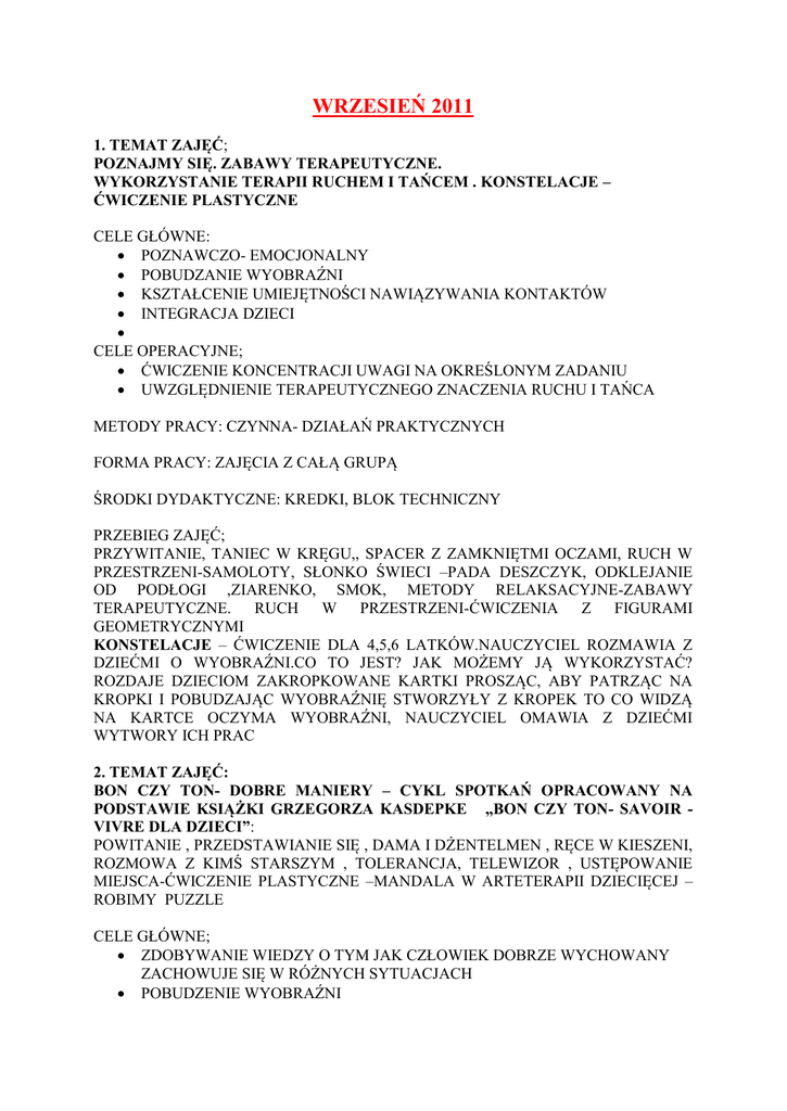 WRZESIEŃ 2011 1. TEMAT ZAJĘĆ; POZNAJMY SIĘ. ZABAWY TERAPEUTYCZNE. WYKORZYSTANIE TERAPII RUCHEM I TAŃCEM . KONSTELACJE – ĆWICZENIE PLASTYCZNE CELE GŁÓWNE: POZNAWCZO- EMOCJONALNY POBUDZANIE WYOBRAŹNI KSZTAŁCENIE UMIEJĘTNOŚCI NAWIĄZYWANIA KONTAKTÓW INTEGRACJA DZIECI CELE OPERACYJNE; ĆWICZENIE KONCENTRACJI UWAGI NA OKREŚLONYM ZADANIU UWZGLĘDNIENIE TERAPEUTYCZNEGO ZNACZENIA RUCHU I TAŃCA METODY PRACY: CZYNNA- DZIAŁAŃ PRAKTYCZNYCH FORMA PRACY: ZAJĘCIA Z CAŁĄ GRUPĄ ŚRODKI DYDAKTYCZNE: KREDKI, BLOK TECHNICZNY PRZEBIEG ZAJĘĆ; PRZYWITANIE, TANIEC W KRĘGU,, SPACER Z ZAMKNIĘTMI OCZAMI, RUCH W PRZESTRZENI-SAMOLOTY, SŁONKO ŚWIECI –PADA DESZCZYK, ODKLEJANIE OD PODŁOGI ,ZIARENKO, SMOK, METODY RELAKSACYJNE-ZABAWY TERAPEUTYCZNE. RUCH W PRZESTRZENI-ĆWICZENIA Z FIGURAMI GEOMETRYCZNYMI KONSTELACJE – ĆWICZENIE DLA 4,5,6 LATKÓW.NAUCZYCIEL ROZMAWIA Z DZIEĆMI O WYOBRAŹNI.CO TO JEST? JAK MOŻEMY JĄ WYKORZYSTAĆ? ROZDAJE DZIECIOM ZAKROPKOWANE KARTKI PROSZĄC, ABY PATRZĄC NA KROPKI I POBUDZAJĄC WYOBRAŹNIĘ STWORZYŁY Z KROPEK TO CO WIDZĄ NA KARTCE OCZYMA WYOBRAŹNI, NAUCZYCIEL OMAWIA Z DZIEĆMI WYTWORY ICH PRAC 2. TEMAT ZAJĘĆ: BON CZY TON- DOBRE MANIERY – CYKL SPOTKAŃ OPRACOWANY NA PODSTAWIE KSIĄŻKI GRZEGORZA KASDEPKE „BON CZY TON- SAVOIR VIVRE DLA DZIECI”: POWITANIE , PRZEDSTAWIANIE SIĘ , DAMA I DŻENTELMEN , RĘCE W KIESZENI, ROZMOWA Z KIMŚ STARSZYM , TOLERANCJA, TELEWIZOR , USTĘPOWANIE MIEJSCA-ĆWICZENIE PLASTYCZNE –MANDALA W ARTETERAPII DZIECIĘCEJ – ROBIMY PUZZLE CELE GŁÓWNE; ZDOBYWANIE WIEDZY O TYM JAK CZŁOWIEK DOBRZE WYCHOWANY ZACHOWUJE SIĘ W RÓŻNYCH SYTUACJACH POBUDZENIE WYOBRAŹNI POZNAWCZO EMOCJONALNY CELE OPERACYJNE; ĆWICZENIE KONCENTRACJI UWAGI NA OKREŚLONYM ZADANIU ĆWICZENIE PAMIĘCI METODY PRACY: SŁOWNA-ROZMOWA, CZYNNA- ZADANIA STAWIANE DO WYKONANIA FORMA PRACY: ZAJĘCIA Z CAŁĄ GRUPĄ ŚRODKI DYDAKTYCZNE; KREDKI, WZORY MANDALI, NOŻYCZKI PRZEBIEG ZAJĘĆ: NAUCZYCIEL WPROWADZA DZIECI W TEMATYKĘ DZISIEJSZYCH ZAJĘĆ , DZIĘKI WYKORZYSTANIU ODPOWIEDNICH ĆWICZEŃ DYDAKTYCZNYCH UTRWALA Z DZIEĆMI POZNANE ZASADY DOBREGO WYCHOWANIA, POD KONIEC ZAJĘĆ NAUCZYCIEL ROZPOCZYNA Z DZIEĆMI PRACĘ Z MANDALĄ, KTÓRĄ DZIECI WYKONUJĄ OD PODSTAW – TWORZĄC KOŁO I PROJEKTUJĄC WNĘTRZE MANDALI NASTĘPNIE TNĄ JĄ NOŻYCZKAMI TWORZĄC PUZZLE JEŻELI NIE ZDĄŻĄ KOŃCZĄ SWOJĄ PRACĘ Z RODZICAMI W DOMU . Jednym z najstarszych symboli ludzkości jest niewątpliwie mandala. Słowo to pochodzi z sans-krytu i oznacza: koło życia, obwód o znaczeniu magicznym, cały świat, święty krąg, centrum. Obecnie praca z mandalą coraz częściej wykorzystywana jest w arteterapii i powstaje na jej temat coraz więcej opracowań. Tworzony w trakcie swobodnej ekspresji magiczny, fascynujący, tajemniczy, barwny krąg, umożliwia wewnętrzną przemianę i ma ogromne działanie terapeutyczne. W osobistej mandali, czyli obramowanej przestrzeni własnej, koło stanowi odzwierciedlenie jaźni. Symbolicznie ujęta przestrzeń jaźni wypełniana jest, na skutek projekcji, kształtami i barwami o charakterze bardzo indywidualnym. Powstaje obraz ukazujący nam nasze konflikty, lęki, napięcia. Zakreślenie wokół siebie ochronnej, magicznej linii, skupienie się na centrum, przyjrzenie się formom i kształtom obrazującym nasze wnętrze powoduje, że czujemy się bardziej pewni, bezpieczni, silniejsi i możemy z dystansem podejść do swoich problemów. W wyniku takiego aktu kreacji powstaje poczucie uwolnienia się od negatywnych emocji, wyciszenia, harmonii, pełni. Trudno jest w sposób naukowy odnieść się do wieloznacznej symboliki mandali. Każdy człowiek posiada swój własny wewnętrzny świat, do którego centrum, tylko on sam ma pełny dostęp. Wszelkie sugerowanie rozwiązań, narzucanie gotowych odpowiedzi, dopowiadanie prawd, stanowi manipulację i nie prowadzi do pozytywnych efektów. Rolą arteterapeuty powinno być jedynie stworzenie odpowiedniej atmosfery, będącej zachętą do wykorzystywania twórczego potencjału i umożliwiającej podejmowanie tego rodzaju działań. 3.TEMAT ZAJĘĆ : DOBRE MANIERY – CHUSTKA DO NOSA , DŁUBANIE W NOSIE, WYCIERANIE NOSA, BEKANIE, WYBRZYDZANIE , SZEPTANIE NA UCHO, PLUCIE, POKAZYWANIE JĘZYKA ,HAŁASOWANIE, PAZNOKCIE , GAFA, KASZEL, PRZEKRZYKIWANIE SIĘ , WYCHODZENIE PO ANGIELSKU – KODEKS DAMY I DŻENTELMENA CELE GŁÓWNE; ZDOBYWANIE WIEDZY O TYM JAK CZŁOWIEK DOBRZE WYCHOWANY ZACHOWUJE SIĘ W RÓŻNYCH SYTUACJACH POBUDZENIE WYOBRAŹNI POZNAWCZO EMOCJONALNY CELE OPERACYJNE; ĆWICZENIE KONCENTRACJI UWAGI NA OKREŚLONYM ZADANIU ĆWICZENIE PAMIĘCI METODY PRACY: SŁOWNA-ROZMOWA, CZYNNA- ZADANIA STAWIANE DO WYKONANIA FORMA PRACY: ZAJĘCIA Z CAŁĄ GRUPĄ ŚRODKI DYDAKTYCZNE: KREDKI, WZORY MANDALI, NOŻYCZKI PRZEBIEG ZAJĘĆ: NAUCZYCIEL WPROWADZA DZIECI W TEMATYKĘ DZISIEJSZYCH ZAJĘĆ , DZIĘKI WYKORZYSTANIU ODPOWIEDNICH ĆWICZEŃ DYDAKTYCZNYCH UTRWALA Z DZIEĆMI POZNANE ZASADY DOBREGO WYCHOWANIA Z ZAJĘĆ DZISIEJSZYCH I POPRZEDNICH. RAZEM Z DZIEĆMI NAUCZYCIEL TWORZY KODEKS DAMY I DŻENTELMENA, KTÓRY ZOSTANIE WYWIESZONY W PRZEDSZKOLNEJ SZATNI. ZASADY SAVOIR VIVRE KULTURALNE DZIECI : 1. ZAWSZE SŁUCHAJĄ SWOICH RODZICÓW, DZIADKÓW I PAŃ W PRZEDSZKOLU 2. PRZEDSTAWIJĄ SIĘ I MÓWIĄ DZIEŃ DOBRY 3. NIE PRZEKRZYKUJĄ SIĘ, NIE HAŁASUJĄ ,NIE POKAZUJĄ JĘZYKA , NIE PLUJĄ . 4. NIE PRZERYWAJĄ KIEDY KTOŚ COŚ MÓWI. 5. NIE TRZYMAJĄ RĄK W KIESZENI PODCZAS ROZMOWY Z OSOBĄ STARSZĄ 6. NIE SIEDZĄ PODCZAS ROZMOWY Z KIMŚ STARSZYM KTO W DANYM MOMENCIE STOI 7. OSOBY KULTURALNE SĄ TOLERANCYJNE – INNY NIE ZNACZY GORSZY 8. NIE OGLĄDAJĄ TELEWIZJI GDY PRZYCHODZĄ GOŚCIE 9. POZWALAJĄ SWOIM GOŚCIOM BAWIĆ SIĘ SWOIMI ZABAWKAMI. 10. NIE DŁUBIĄ W NOSIE .NOS WYCIERAJĄ W CHUSTECZKĘ I NAJLEPIEJ NA UBOCZU NIE PRZY WSZYSTKICH. ZUŻYTE PAPIEROWE CHUSTKI WYRZUCAJĄ DO KOSZA 11. NIE BEKAJĄ PRZY STOLE 12. NIE WYBRZYDZAJĄ PODCZAS POSIŁKÓW, ZAKUPÓW-MOŻEMY SPRAWIĆ KOMUŚ PRZYKROŚĆ 13. NIE SZEPCZĄ D