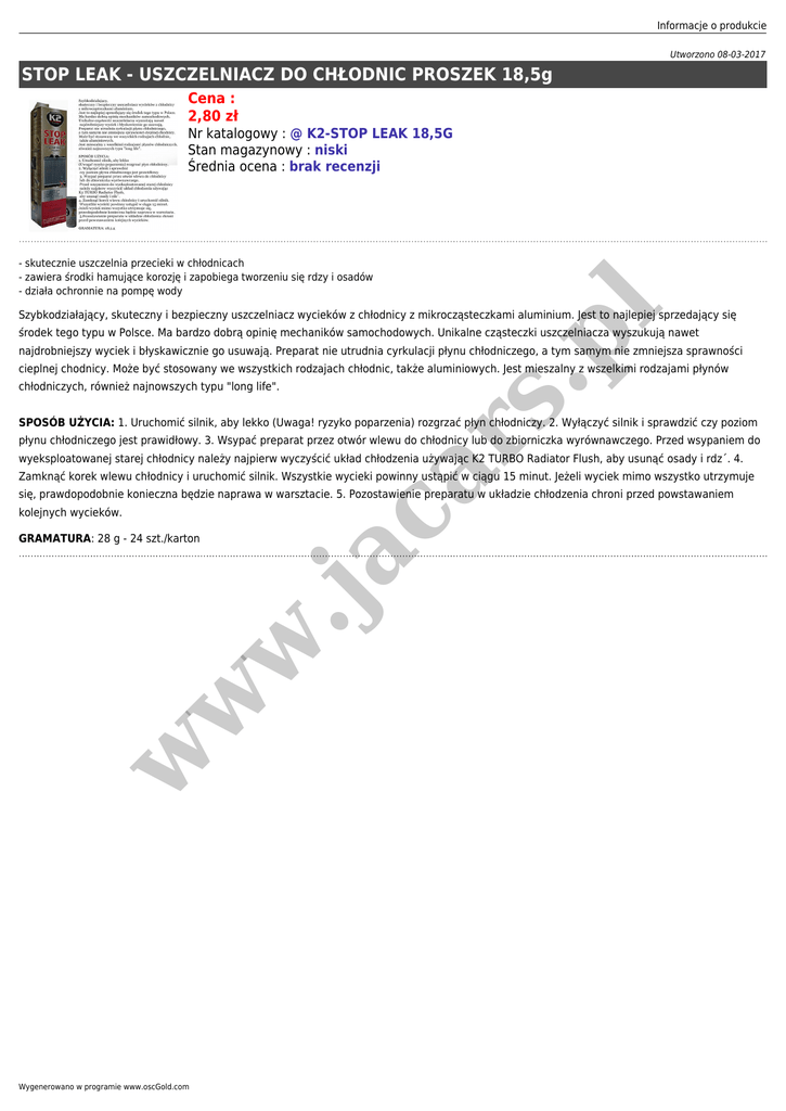 Informacje o produkcie Utworzono 08-03-2017 STOP LEAK - USZCZELNIACZ DO CHŁODNIC PROSZEK 18,5g Cena : 2,80 zł Nr katalogowy : @ K2-STOP LEAK 18,5G Stan magazynowy : niski Średnia ocena : brak recenzji l - skutecznie uszczelnia przecieki w chłodnicach - zawiera środki hamujące korozję i zapobiega tworzeniu się rdzy i osadów - działa ochronnie na pompę wody Szybkodziałający, skuteczny i bezpieczny uszczelniacz wycieków z chłodnicy z mikrocząsteczkami aluminium. Jest to najlepiej sprzedający się .p środek tego typu w Polsce. Ma bardzo dobrą opinię mechaników samochodowych. Unikalne cząsteczki uszczelniacza wyszukują nawet najdrobniejszy wyciek i błyskawicznie go usuwają. Preparat nie utrudnia cyrkulacji płynu chłodniczego, a tym samym nie zmniejsza sprawności cieplnej chodnicy. Może być stosowany we wszystkich rodzajach chłodnic, także aluminiowych. Jest mieszalny z wszelkimi rodzajami płynów rs chłodniczych, również najnowszych typu "long life". SPOSÓB UŻYCIA: 1. Uruchomić silnik, aby lekko (Uwaga! ryzyko poparzenia) rozgrzać płyn chłodniczy. 2. Wyłączyć silnik i sprawdzić czy poziom płynu chłodniczego jest prawidłowy. 3. Wsypać preparat przez otwór wlewu do chłodnicy lub do zbiorniczka wyrównawczego. Przed wsypaniem do ca wyeksploatowanej starej chłodnicy należy najpierw wyczyścić układ chłodzenia używając K2 TURBO Radiator Flush, aby usunąć osady i rdz´. 4. Zamknąć korek wlewu chłodnicy i uruchomić silnik. Wszystkie wycieki powinny ustąpić w ciągu 15 minut. Jeżeli wyciek mimo wszystko utrzymuje się, prawdopodobnie konieczna będzie naprawa w warsztacie. 5. Pozostawienie preparatu w układzie chłodzenia chroni przed powstawaniem kolejnych wycieków. w w w .ja GRAMATURA: 28 g - 24 szt./karton Wygenerowano w programie www.oscGold.com