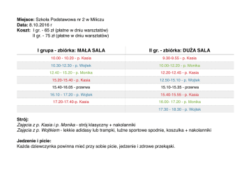 Miejsce: Szkoła Podstawowa nr 2 w Miliczu Data: 8.10.2016 r Koszt: I gr. - 65 zł (płatne w dniu warsztatów) II gr. - 75 zł (płatne w dniu warsztatów) I grupa - zbiórka: MAŁA SALA II gr. - zbiórka: DUŻA SALA 10.00 - 10.20 - p. Kasia 9.30-9.55 - p. Kasia 10.30-12.30 - p. Wojtek 10.00-12.20 - p. Monika 12.40 - 15.20 - p. Monika 12.20-12.45 - p. Kasia 15.20-15.40 - p. Kasia 12.50-15.10 - p. Wojtek 15.40-16.05 - przerwa 15.10-15.35 - przerwa 16.10 - 17.20 - p. Wojtek 15.40-15.55 - p. Kasia 17.20-17.40-p. Kasia 16.00- 17.20 - p. Monika 17.30 - 18.30 - p. Wojtek Strój: Zajęcia z p. Kasia i p. Monika - strój klasyczny + nakolanniki Zajęcia z p. Wojtkiem - lekkie adidasy lub trampki, luźne sportowe spodnie, koszulka + nakolanniki Jedzenie i picie: Każda dziewczynka powinna mieć przy sobie picie, jedzenie i zdrowe przekąski.