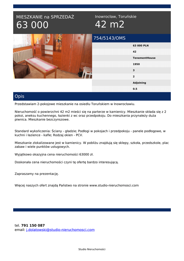 Inowrocław, Toruńskie MIESZKANIE na SPRZEDAŻ 42 m2 63 000 754/5143/OMS 63 000 PLN 42 TenementHouse 1950 3 2 Adjoining 0.5 Opis Przedstawiam 2-pokojowe mieszkanie na osiedlu Toruńskiem w Inowrocławiu. Nieruchomość o powierzchni 42 m2 mieści się na parterze w kamienicy. Mieszkanie składa się z 2 pokoi, aneksu kuchennego, łazienki z wc oraz przedpokoju. Do mieszkania przynależy duża piwnica. Mieszkanie bezczynszowe. Standard wykończenia: Ściany - gładzie; Podłogi w pokojach i przedpokoju - panele podłogowe, w kuchni i łazience - kafle; Rodzaj okien - PCV. Mieszkanie zlokalizowane jest w kamienicy. W pobliżu znajdują się sklepy, szkoła, przedszkole, plac zabaw i wiele punktów usługowych. Wyjątkowo okazyjna cena nieruchomości 63000 zł. Doskonała cena nieruchomości czyni tę ofertę bardzo interesującą. Zapraszamy na prezentację. Więcej naszych ofert znajdą Państwo na stronie www.studio-nieruchomosci.com tel. 791 150 087 email: [email protected] Studio Nieruchomości Studio Nieruchomości Powered by TCPDF (www.tcpdf.org)