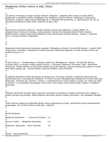 Miejskie Centrum Sportu i Rekreacji w Skarżysku-Kamiennej Akademia Orlika rośnie w siłę! (foto) 21.01.2012. Już ponad 18 miesięcy trwają treningi młodych chłopców - adeptów piłki nożnej (rocznik 2003) skupionych w Akademii Orlika, działającej przy Miejskim Centrum Sportu i Rekreacji w SkarżyskuKamiennej. Zajęcia z piłką nożną odbywają się w miejskiej hali sportowej, ul. Sienkiewicza 34, lub na sztucznej nawierzchni Orlika 2012, zależnie od pory roku. Niezmiennie trenerami zdolnych, młodych piłkarzy są Dariusz Kasprzyk i Łukasz Białek. Po ubiegłorocznym halowym turnieju, kiedy gościem imprezy był eksreprezentant Polski, Dariusz Dziekanowski, zespoły skarżyskiej Akademii Orlika zanotowały niemałe sukcesy. Jednak 17 grudnia 2011r. przyszło wybitne osiągnięcie. Akademia Orlika Skarżysko-Kamienna wygrała I Mikołajkowy Halowy Turniej Piłki Nożnej - rocznik 2003. rozgrywany w Kielcach. Podopieczni trenera Dariusza Kasprzyka pokonali w finale Koronę I Kielce po rzutach karnych 2:1. W hali II LO im. J. Śniadeckiego w Kielcach odbył się I Mikołajkowy Halowy Turniej Piłki Nożnej, rocznika 2003, w turnieju wzięło udział 8 drużyn z Krakowa, Radomia, Chorzowa, Kielc i SkarżyskaKamiennej. Młodzi piłkarze ze Skarżyska spisali się bardzo dobrze, wygrali swoją grupę, gdzie za rywali mieli takie zespoły jak : Korona Kielce, Cracovia Kraków i Ruch Chorzów. W półfinale Akademia Orlika Skarżysko zmierzyła się z Cracovią I Kraków, spotkanie zakończyło się jednobramkowym zwycięstwem Akademii. W finale Turnieju Mikołajkowego podopieczni trenera Dariusza Kasprzyka zmierzyli się z Koroną I Kielce, w regulaminowym czasie żadnej z drużyn nie udało się trafić do bramki i o zwycięstwie decydowały rzuty karne, które lepiej wykonywali młodzi chłopcy z Akademii Skarżysko. Ostatnim akcentem turnieju było wręczenie wszystkim uczestnikom medali, pucharów oraz nagród w postaci sprzętu sportowego. Młodzi piłkarze otrzymali również słodkie upominki z rąk Świętego Mikołaja. Trener Dariusz Kasprzyk podkreśla bardzo dobrą organizację turnieju, sprawiliśmy dużą niespodziankę wygrywając ten turniej zarówno sobie jak i rodzicom. Wyniki grupowe: Akademia Skarżysko - Cracovia II Kraków 2:1 Korona I Kielce - Akademia Skarżysko 1:0 Akademia Skarżysko - Ruch Chorzów 5:1 Wyniki - faza pucharowa http://mcsir.skarzysko.pl Kreator PDF Utworzono 8 March, 2017, 01:47 Miejskie Centrum Sportu i Rekreacji w Skarżysku-Kamiennej Korona I Kielce - Radomiak Radom Cracovia I - Akademia Orlika Skarżysko Cracovia II - Korona II 0:0, w karnych Akademia Kielce - Ruch Chorzów 3:0 0:1 3:2 2:1 mecz o 5. miejsce: Cracovia II - Akademia Kielce 1:2 Mecz o 3. miejsce: Radomiak - Cracovia I 3:1 Finał: Korona I - Akademia Skarżysko 0:0, w karnych 1:2. Klasyfikacja Końcowa - Akademia Orlika Skarżysko - Korona I Kielce - Radomiak Radom - Cracovia I - Akademia Orlika Kielce - Cracovia II - Korona II Kielce - Ruch Chorzów. Nagrody indywidualne: Mikołaj Kotliński (Korona I) - najlepszy bramkarz Jan Gruszka (Cracovia II) - najlepszy zawodnik Radosław Seweryś (Akademia Kielce) - najlepszy strzelec - 6 bramek. Akademia Orlika Skarżysko wystąpiła w składzie: http://mcsir.skarzysko.pl Kreator PDF Utworzono 8 March, 2017, 01:47 Miejskie Centrum Sportu i Rekreacji w Skarżysku-Kamiennej Kajtek Kubicki, Dawid Korbacz, Maciej Walkowiak, Maksymilian Bator, Jakub Chechłowski, Piotr Jastrząb, Igor Duda, Miłosz Kruk, Kacper Jędrzejczyk, Adam Grzywalski, Kacper Ostrowski, Dominik Kowalik. Trener Dariusz Kasprzyk. Najwięcej bramek dla Akademii Skarżysko zdobył Miłosz Kruk - 6 bramek Dokumentacja turnieju i zajęć w hali MCSiR: zdjęcia: tsk24.pl/własne http://mcsir.skarzysko.pl Kreator PDF Utworzono 8 March, 2017, 01:47