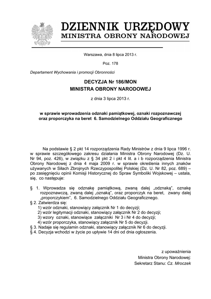 Warszawa, dnia 8 lipca 2013 r. Poz. 178 Departament Wychowania i promocji Obronności DECYZJA Nr 186/MON MINISTRA OBRONY NARODOWEJ z dnia 3 lipca 2013 r. w sprawie wprowadzenia odznaki pamiątkowej, oznaki rozpoznawczej oraz proporczyka na beret 6. Samodzielnego Oddziału Geograficznego Na podstawie § 2 pkt 14 rozporządzenia Rady Ministrów z dnia 9 lipca 1996 r. w sprawie szczegółowego zakresu działania Ministra Obrony Narodowej (Dz. U. Nr 94, poz. 426), w związku z § 34 pkt 2 i pkt 4 lit. a i b rozporządzenia Ministra Obrony Narodowej z dnia 4 maja 2009 r. w sprawie określenia innych znaków używanych w Siłach Zbrojnych Rzeczypospolitej Polskiej (Dz. U. Nr 82, poz. 689) – po zasięgnięciu opinii Komisji Historycznej do Spraw Symboliki Wojskowej – ustala, się, co następuje: § 1. Wprowadza się odznakę pamiątkową, zwaną dalej „odznaką”, oznakę rozpoznawczą, zwaną dalej „oznaką”, oraz proporczyk na beret, zwany dalej „proporczykiem”, 6. Samodzielnego Oddziału Geograficznego. § 2. Zatwierdza się: 1) wzór odznaki, stanowiący załącznik Nr 1 do decyzji; 2) wzór legitymacji odznaki, stanowiący załącznik Nr 2 do decyzji; 3) wzory oznaki, stanowiące załączniki Nr 3 i Nr 4 do decyzji; 4) wzór proporczyka, stanowiący załącznik Nr 5 do decyzji. § 3. Nadaje się regulamin odznaki, stanowiący załącznik Nr 6 do decyzji. § 4. Decyzja wchodzi w życie po upływie 14 dni od dnia ogłoszenia. z upoważnienia Ministra Obrony Narodowej: Sekretarz Stanu: Cz. Mroczek Załączniki do decyzji Nr 186/MON Ministra Obrony Narodowej z dnia 03.07.2013 r. (poz. 178) Załącznik Nr 1 WZÓR GRAFICZNY ODZNAKI PAMIĄTKOWEJ 6. SAMODZIELNEGO ODDZIAŁU GEOGRAFICZNEGO Załącznik Nr 2 WZÓR GRAFICZNY LEGITYMACJI ODZNAKI PAMIĄTKOWEJ 6. SAMODZIELNEGO ODDZIAŁU GEOGRAFICZNEGO Rozkazem Dowódcy Nr ………. z dn. …………. LEGITYMACJA Nr …………… ………………………………………….. (stopień imię i nazwisko) jest uprawniony do posiadania i noszenia „ODZNAKI PAMIĄTKOWEJ 6. SAMODZIELNEGO ODDZIAŁU GEOGRAFICZNEGO” mp Toruń Dnia ………………………… r. DOWÓDCA …………………. 6. Samodzielny Oddział G e o g r af i c z n y Toruń Załącznik Nr 3 WZÓR GRAFICZNY OZNAKI ROZPOZNAWCZEJ 6. SAMODZIELNEGO ODDZIAŁU GEOGRAFICZNEGO NA MUNDUR WYJŚCIOWY Załącznik Nr 4 WZÓR GRAFICZNY OZNAKI ROZPOZNAWCZEJ 6. SAMODZIELNEGO ODDZIAŁU GEOGRAFICZNEGO NA MUNDUR POLOWY Załącznik Nr 5 WZÓR GRAFICZNY PROPORCZYKA NA BERET 6. SAMODZIELNEGO ODDZIAŁU GEOGRAFICZNEGO Załącznik Nr 6 REGULAMIN ODZNAKI PAMIĄTKOWEJ 6. SAMODZIELNEGO ODDZIAŁU GEOGRAFICZNEGO 1. Odznaka pamiątkowa, zwana dalej „odznaką”, 6. Samodzielnego Oddziału Geograficznego, zwanego dalej „Oddziałem”, jest widocznym znakiem nienagannej służby w szeregach oddziału oraz zewnętrznym symbolem przynależności, solidarności żołnierskiej, współpracy w służbie wojskowej pełnionej lub odbytej pod wspólnym sztandarem. Jest znakiem dziedziczonej i kultywowanej tradycji służby geograficznej Wojska Polskiego, zespolenia i przywiązania do oddziału a także symbolem wyróżniającym żołnierzy 6. Samodzielnego Oddziału Geograficznego. 2. Celem nadania odznaki pamiątkowej jest uhonorowanie wzorowej służby wojskowej, podniesienie rangi oddziału w środowisku wojskowym i cywilnym. 3. Odznaka wykonana jest z metalu oksydowanego, częściowo wypełnionego emalią - dwuwarstwowa. Podstawą odznaki jest krzyż maltański – wzorowany na odznace 12. Kompanii Geograficznej 2 Korpusu Polskiego. Wykonany jest z metalu pokrytego czarną emalią ze złoto-białym obrzeżem. Kolor czarny symbolizuje służby techniczne w tym geografię i kartografię wojskową. Drugą warstwę stanowi orzeł w koronie, wzorowany na orle z odznaki pamiątkowej Wojskowego Instytutu Geograficznego z 1928 roku, umieszczony na niebieskim globusie z siatką południków i równoleżników, symbolizuje on Glob Ziemski oraz nawiązuje do emblematu („korpusówki”) Korpusu Oficerów Geografów z okresu II Rzeczypospolitej. Na pierś orła nałożona jest tarcza, wypełniona białą emalią z niebieską obwódką. Na tarczy znajduje się cyfra „6” barwy czarnej, odzwierciedlająca numer oddziału. Glob ziemski obwiedziony jest wieńcem laurowo-dębowym . 4. Prawo do otrzymania odznaki przysługuje: 1) dowódcy Oddziału z tytułu objęcia stanowiska służbowego; 2) żołnierzom zawodowym po co najmniej rocznej nienagannej służbie. W uzasadnionych przypadkach (np. dokonanie czynu bohaterskiego, szczególnych zasług dla umacniania systemu obronnego i Sił Zbrojnych RP) okres ten może być skrócony; 3) pozostałym żołnierzom (NSR, rezerwy, itp.), tylko za wybitne zasługi; 4) byłym żołnierzom zawodowym Oddziału za zasługi wniesione w pomnażanie tradycji 6. Samodzielnego Oddziału Geograficznego; 5) osobom fizycznym i prawnym, które wniosły szczególne zasługi w upowszechnianiu i popularyzacji tradycji Oddziału oraz które w sposób ciągły współpracują w dziedzinie umacniania obronności RP i patriotycznego wychowania; 6) pracownikom wojska po przepracowaniu co najmniej dwóch lat w Oddziale. 5. Odznakę nadaje się imiennie wraz z legitymacją. 6. Odznaka jest numerowana. 7. Odznakę nadaje Dowódca Oddziału z własnej inicjatywy, na wniosek Komisji do Spraw Odznaki Pamiątkowej, zwanej dalej „Komisją” lub na wniosek zebrania żołnierzy zawodowych Oddziału. 8. Z tytułu nadania odznaki nie przysługują żadne dodatkowe prawa ani przywileje. 9. Odznakę wręcza się z okazji świąt państwowych, wojskowych, oraz innych szczególnie ważnych okolicznościach, zgodnie z wymogami ceremoniału wojskowego. 10. Sposób noszenia odznaki określa rozporządzenie Ministra Obrony Narodowej w sprawie wzorów, noszenia umundurowania, odznak i oznak oraz uzbrojenia przez żołnierzy w czynnej służbie wojskowej. Miniatrukę odznaki można nosić do wizytowego ubioru