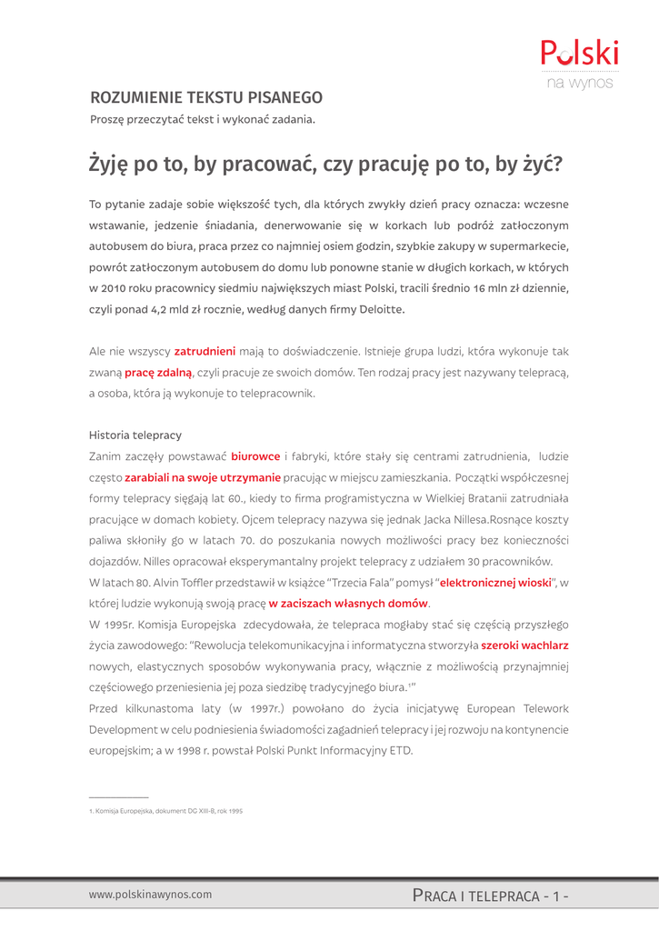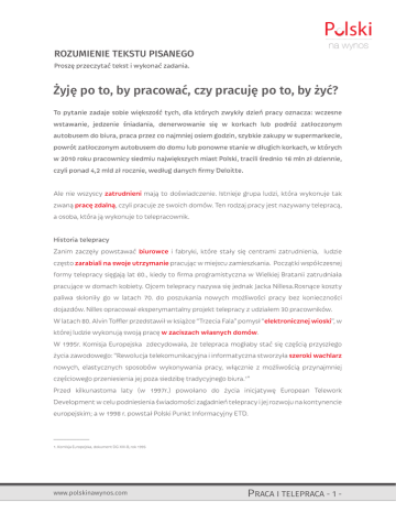 na wynos ROZUMIENIE TEKSTU PISANEGO Proszę przeczytać tekst i wykonać zadania. Żyję po to, by pracować, czy pracuję po to, by żyć? To pytanie zadaje sobie większość tych, dla których zwykły dzień pracy oznacza: wczesne wstawanie, jedzenie śniadania, denerwowanie się w korkach lub podróż zatłoczonym autobusem do biura, praca przez co najmniej osiem godzin, szybkie zakupy w supermarkecie, powrót zatłoczonym autobusem do domu lub ponowne stanie w długich korkach, w których w 2010 roku pracownicy siedmiu największych miast Polski, tracili średnio 16 mln zł dziennie, czyli ponad 4,2 mld zł rocznie, według danych firmy Deloitte. Ale nie wszyscy zatrudnieni mają to doświadczenie. Istnieje grupa ludzi, która wykonuje tak zwaną pracę zdalną, czyli pracuje ze swoich domów. Ten rodzaj pracy jest nazywany telepracą, a osoba, która ją wykonuje to telepracownik. Historia telepracy Zanim zaczęły powstawać biurowce i fabryki, które stały się centrami zatrudnienia, ludzie często zarabiali na swoje utrzymanie pracując w miejscu zamieszkania. Początki współczesnej formy telepracy sięgają lat 60., kiedy to firma programistyczna w Wielkiej Bratanii zatrudniała pracujące w domach kobiety. Ojcem telepracy nazywa się jednak Jacka Nillesa.Rosnące koszty paliwa skłoniły go w latach 70. do poszukania nowych możliwości pracy bez konieczności dojazdów. Nilles opracował eksperymantalny projekt telepracy z udziałem 30 pracowników. W latach 80. Alvin Toffler przedstawił w książce “Trzecia Fala” pomysł “elektronicznej wioski”, w której ludzie wykonują swoją pracę w zaciszach własnych domów. W 1995r. Komisja Europejska zdecydowała, że telepraca mogłaby stać się częścią przyszłego życia zawodowego: “Rewolucja telekomunikacyjna i informatyczna stworzyła szeroki wachlarz nowych, elastycznych sposobów wykonywania pracy, włącznie z możliwością przynajmniej częściowego przeniesienia jej poza siedzibę tradycyjnego biura.1” Przed kilkunastoma laty (w 1997r.) powołano do życia inicjatywę European Telework Development w celu podniesienia świadomości zagadnień telepracy i jej rozwoju na kontynencie europejskim; a w 1998 r. powstał Polski Punkt Informacyjny ETD. ___________ 1. Komisja Europejska, dokument DG XIII-B, rok 1995 www.polskinawynos.com PRACA I TELEPRACA - 1 - na wynos Zalety telepracy Praca z domu, z kawiarni czy parku wydaje się być idealnym rozwiązaniem, zwłaszcza że w małym boksie w oszklonym biurowcu nie zawsze towarzyszy nam natchnienie i chęć do pracy, a wręcz często marnujemy wiele czasu na bezproduktywne czynności. Nie wszyscy pracodawcy są zgodni co to tego, że bardziej owocnym i zdecydowanie tańszym rozwiązaniem byłaby praca zdalna, dlatego telepraca w Polsce to wciąż nowość. Wykonuje ją jedynie 3% pracowników (dla porównania w Europie – 15%). Zarówno firmy jak i osoby prywatne mogą czerpać wiele korzyści z telepracy. Jedną z korzyści dla firm jest to, że mogą one zaoszczędzić pieniądze. Praca zdalna umożliwia pracodawcy ograniczenie kosztów m.in. powierzchni biurowej, mediów, a także wynajmu miejsc parkingowych. Korzyścią dla pracownika są z kolei m.in. niższe koszty i oszczędność czasu związana z dojazdami do pracy. Warto również wspomnieć, że telepraca umożliwia pracownikom łatwiejsze pogodzenie obowiązków służbowych ze sprawami osobistymi i rodzinnymi, co jest jej ogromną zaletą. Ponadto ta forma organizacji pracy pozwala aktywizować pracowników mieszkających na wsiach, a także osoby niepełnosprawne. Praca zdalna powoduje ograniczenie ruchu samochodowego i związanego z nim zanieczyszczenia środowiska. Może ona również wpłynąć pozytywnie na morale pracowników. Pracownicy, którzy mogą dokonywać wyboru działania są często szczęśliwsi. Jeżeli pracownicy są szczęśliwsi, mogą być lepszymi pracownikami. Technologia Pracownik, który decyduje się na telepracę powinien mieć zagwarantowany przez swojego pracodawcę niezbędny sprzęt służący do wykonywania pracy w formie telepracy. Najpopularniejsze technologie wykorzystywane w pracy zdalnej to telefon oraz narzędzia wykorzystujące Internet — poczta elektroniczna (e-mail), VPN - Wirtualna Sieć Prywatna, VoIP (np. Skype), narzędzia konferencyjne (telekonferencja, wideokonferencja), komunikatory internetowe oraz rozmaite narzędzia pracy grupowej (np. Microsoft SharePoint czy Google Drive). Upowszechnienie pracy zdalnej jest także związane z dostępnością szerokopasmowego dostępu do Internetu, zwłaszcza szybkiego Internetu mobilnego. Wady telepracy Istnieje wiele korzyści płynących z telepracy, ale istnieją również pewne wady. Największym problemem dla pracodawcy jest brak kontroli nad pracownikiem. Jeżeli osoba zatrudniona nie przebywa w biurze, pracodawca nie ma pewności, czy praca nad danym projektem posuwa się do przodu. Innym minusem telepracy jest to, że telepracownik ma mniejsze szanse na awans, www.polskinawynos.com PRACA I TELEPRACA - 2 - na wynos gdyż pracodawcy są bardziej skłonni dać awans pracownikom, których widzą na co dzień. Ujemną stroną telepracy może być też izolacja pracownika, dlatego niezbędne jest zapewnienie mu kontaktów społecznych i udzielenie wsparcia zawodowego. Wydaje się, że telepraca to nie chwilowa moda, ale być może początek zmian na rynku pracy czy zmian społeczno-gospodarczych. W nowoczesnych gospodarkach, zwłaszcza w czasach spowolnienia gospodarczego może być ratunkiem dla wielu zagrożonych firm. Źródła: Biuro w ogrodzie – dlaczego Polacy stronią od pracy w domu? - prnews.pl Telepraca - Wojewódzki Urząd Pracy w Warszawie Poszukiwanie czasu i oszczędności - Newsweek.pl Telepraca - Wikipedia 1. Proszę znaleźć w tekście odpowiednie słówka lub wyrażenia i dopasować je do definicji. (1) __________________________________________________________________________ - usługa