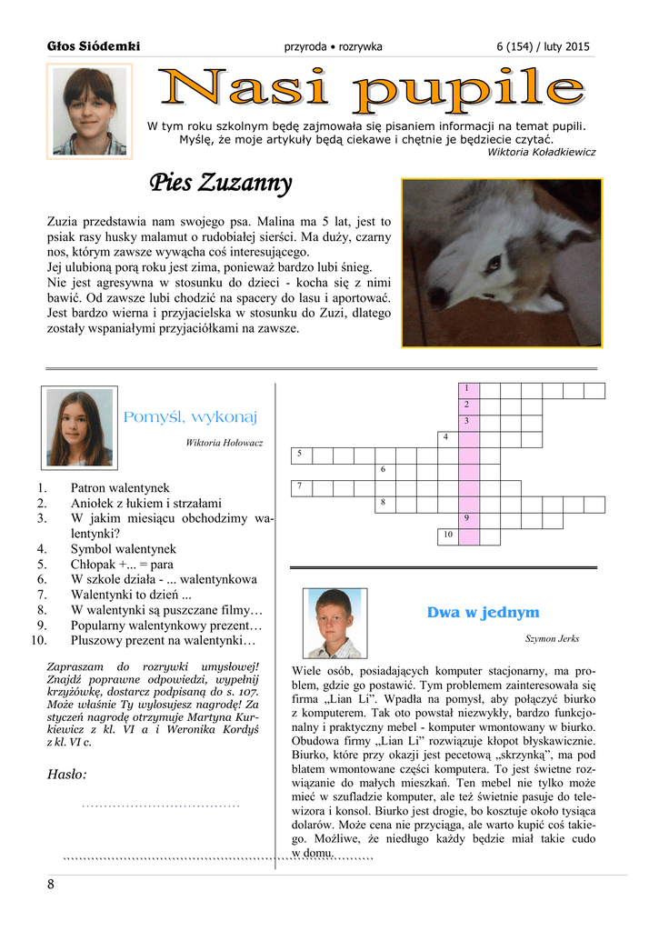 Głos Siódemki przyroda • rozrywka 6 (154) / luty 2015 __________________________________________________________________________________________________________________________________________________________________________________________________________________________________________________________________________________________________________________________________________________________________________________________________________________________________________________________________________ W tym roku szkolnym będę zajmowała się pisaniem informacji na temat pupili. Myślę, że moje artykuły będą ciekawe i chętnie je będziecie czytać. Wiktoria Koładkiewicz Pies Zuzanny Zuzia przedstawia nam swojego psa. Malina ma 5 lat, jest to psiak rasy husky malamut o rudobiałej sierści. Ma duży, czarny nos, którym zawsze wywącha coś interesującego. Jej ulubioną porą roku jest zima, ponieważ bardzo lubi śnieg. Nie jest agresywna w stosunku do dzieci - kocha się z nimi bawić. Od zawsze lubi chodzić na spacery do lasu i aportować. Jest bardzo wierna i przyjacielska w stosunku do Zuzi, dlatego zostały wspaniałymi przyjaciółkami na zawsze. 1 2 Pomyśl, wykonaj 3 4 Wiktoria Hołowacz 5 6 1. 2. 3. Patron walentynek Aniołek z łukiem i strzałami W jakim miesiącu obchodzimy walentynki? Symbol walentynek Chłopak +... = para W szkole działa - ... walentynkowa Walentynki to dzień ... W walentynki są puszczane filmy… Popularny walentynkowy prezent… Pluszowy prezent na walentynki… 4. 5. 6. 7. 8. 9. 10. 7 8 9 10 Dwa w jednym Szymon Jerks Zapraszam do rozrywki umysłowej! Znajdź poprawne odpowiedzi, wypełnij krzyżówkę, dostarcz podpisaną do s. 107. Może właśnie Ty wylosujesz nagrodę! Za styczeń nagrodę otrzymuje Martyna Kurkiewicz z kl. VI a i Weronika Kordyś z kl. VI c. Wiele osób, posiadających komputer stacjonarny, ma problem, gdzie go postawić. Tym problemem zainteresowała się firma „Lian Li”. Wpadła na pomysł, aby połączyć biurko z komputerem. Tak oto powstał niezwykły, bardzo funkcjonalny i praktyczny mebel - komputer wmontowany w biurko. Obudowa firmy „Lian Li” rozwiązuje kłopot błyskawicznie. Biurko, które przy okazji jest pecetową „skrzynką”, ma pod blatem wmontowane części komputera. To jest świetne rozHasło: wiązanie do małych mieszkań. Ten mebel nie tylko może mieć w szufladzie komputer, ale też świetnie pasuje do tele……………………………… wizora i konsol. Biurko jest drogie, bo kosztuje około tysiąca dolarów. Może cena nie przyciąga, ale warto kupić coś takiego. Możliwe, że niedługo każdy będzie miał takie cudo w domu. ````````````````````````````````````````````````````````````````````````````` _____________________________________________________________________________________________________________________________________________________________________________________________________________________________________________________________________________________________________________________________________________________________________________________________________________________________________________________________________________________________________ 8
