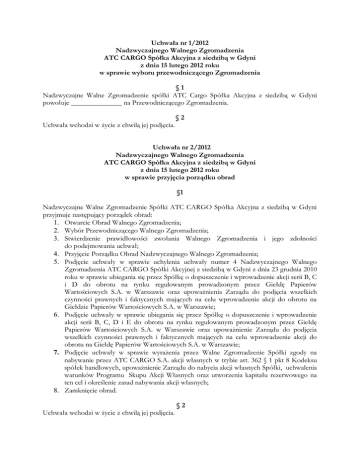 Uchwała nr 1/2012 Nadzwyczajnego Walnego Zgromadzenia ATC CARGO Spółka Akcyjna z siedzibą w Gdyni z dnia 15 lutego 2012 roku w sprawie wyboru przewodniczącego Zgromadzenia §1 Nadzwyczajne Walne Zgromadzenie spółki ATC Cargo Spółka Akcyjna z siedzibą w Gdyni powołuje ______________ na Przewodniczącego Zgromadzenia. §2 Uchwała wchodzi w życie z chwilą jej podjęcia. Uchwała nr 2/2012 Nadzwyczajnego Walnego Zgromadzenia ATC CARGO Spółka Akcyjna z siedzibą w Gdyni z dnia 15 lutego 2012 roku w sprawie przyjęcia porządku obrad §1 Nadzwyczajne Walne Zgromadzenie Spółki ATC CARGO Spółka Akcyjna z siedzibą w Gdyni przyjmuje następujący porządek obrad: 1. Otwarcie Obrad Walnego Zgromadzenia; 2. Wybór Przewodniczącego Walnego Zgromadzenia; 3. Stwierdzenie prawidłowości zwołania Walnego Zgromadzenia i jego zdolności do podejmowania uchwał; 4. Przyjęcie Porządku Obrad Nadzwyczajnego Walnego Zgromadzenia; 5. Podjęcie uchwały w sprawie uchylenia uchwały numer 4 Nadzwyczajnego Walnego Zgromadzenia ATC CARGO Spółki Akcyjnej z siedzibą w Gdyni z dnia 23 grudnia 2010 roku w sprawie ubiegania się przez Spółkę o dopuszczenie i wprowadzenie akcji serii B, C i D do obrotu na rynku regulowanym prowadzonym przez Giełdę Papierów Wartościowych S.A. w Warszawie oraz upoważnienia Zarządu do podjęcia wszelkich czynności prawnych i faktycznych mających na celu wprowadzenie akcji do obrotu na Giełdzie Papierów Wartościowych S.A. w Warszawie; 6. Podjęcie uchwały w sprawie ubiegania się przez Spółkę o dopuszczenie i wprowadzenie akcji serii B, C, D i E do obrotu na rynku regulowanym prowadzonym przez Giełdę Papierów Wartościowych S.A. w Warszawie oraz upoważnienie Zarządu do podjęcia wszelkich czynności prawnych i faktycznych mających na celu wprowadzenie akcji do obrotu na Giełdę Papierów Wartościowych S.A. w Warszawie; 7. Podjęcie uchwały w sprawie wyrażenia przez Walne Zgromadzenie Spółki zgody na nabywanie przez ATC CARGO S.A. akcji własnych w trybie art. 362 § 1 pkt 8 Kodeksu spółek handlowych, upoważnienie Zarządu do nabycia akcji własnych Spółki, uchwalenia warunków Programu Skupu Akcji Własnych oraz utworzenia kapitału rezerwowego na ten cel i określenie zasad nabywania akcji własnych; 8. Zamknięcie obrad. Uchwała wchodzi w życie z chwilą jej podjęcia. §2 Uchwała nr 3/2012 Nadzwyczajnego Walnego Zgromadzenia ATC CARGO Spółka Akcyjna z siedzibą w Gdyni z dnia 15 lutego 2012 roku w sprawie uchylenia uchwały numer 4 Nadzwyczajnego Walnego Zgromadzenia ATC CARGO Spółki Akcyjnej z siedzibą w Gdyni z dnia 23 grudnia 2010 roku w sprawie ubiegania się przez Spółkę o dopuszczenie i wprowadzenie akcji serii B, C i D do obrotu na rynku regulowanym prowadzonym przez Giełdę Papierów Wartościowych S.A. w Warszawie oraz upoważnienia Zarządu do podjęcia wszelkich czynności prawnych i faktycznych mających na celu wprowadzenie akcji do obrotu na Giełdzie Papierów Wartościowych S.A. w Warszawie §1 Nadzwyczajne Walne Zgromadzenie Spółki ATC CARGO Spółka Akcyjna z siedzibą Gdyni postanawia uchylić uchwałę numer 4 Nadzwyczajnego Walnego Zgromadzenia ATC CARGO Spółki Akcyjnej z siedzibą w Gdyni z dnia 23 grudnia 2010 roku w sprawie ubiegania się przez Spółkę o dopuszczenie i wprowadzenie akcji serii B, C i D do obrotu na rynku regulowanym prowadzonym przez Giełdę Papierów Wartościowych S.A. w Warszawie oraz upoważnienia Zarządu do podjęcia wszelkich czynności prawnych i faktycznych mających na celu wprowadzenie akcji do obrotu na Giełdzie Papierów Wartościowych S.A. w Warszawie. §2 Uchwała wchodzi w życie z dniem podjęcia. Uchwała nr 4/2012 Nadzwyczajnego Walnego Zgromadzenia ATC CARGO Spółka Akcyjna z siedzibą w Gdyni z dnia 15 lutego 2012 roku w sprawie ubiegania się przez Spółkę o dopuszczenie i wprowadzenie akcji serii B, C, D i E do obrotu na rynku regulowanym prowadzonym przez Giełdę Papierów Wartościowych S.A. w Warszawie oraz upoważnienie Zarządu do podjęcia wszelkich czynności prawnych i faktycznych mających na celu wprowadzenie akcji do obrotu na Giełdę Papierów Wartościowych S.A. w Warszawie §1 Nadzwyczajne Walne Zgromadzenie Spółki pod firmą ATC CARGO Spółka Akcyjna z siedzibą w Gdyni postanawia wyrazić zgodę na ubieganie się o dopuszczenie i wprowadzenie wszystkich akcji serii B, C, D i E, notowanych w alternatywnym systemie obrotu NewConnect, do obrotu na rynku regulowanym prowadzonym przez Giełdę Papierów Wartościowych S.A. w Warszawie na podstawie przepisów ustawy z dnia 29 lipca 2005 roku o obrocie instrumentami finansowymi. §2 Nadzwyczajne Walne Zgromadzenie Spółki pod firmą ATC CARGO Spółka Akcyjna z siedzibą w Gdyni postanawia upoważnić Zarząd Spółki do podejmowania wszelkich czynności prawnych i organizacyjnych, które będą zmierzały do dopuszczenia i wprowadzenia akcji serii B, C, D i E do obrotu na rynku regulowanym prowadzonym przez Giełdę Papierów Wartościowych S.A. w Warszawie, w tym złożenia stosownych wniosków do Komisji Nadzoru Finansowego oraz Giełdy Papierów Wartościowych S.A. w Warszawie. §3 Niniejsza uchwała wchodzi w życie z dniem jej podjęcia. Uchwała nr 5/2012 Nadzwyczajnego Walnego Zgromadzenia ATC CARGO Spółka Akcyjna z siedzibą w Gdyni z dnia 15 lutego 2012 roku w sprawie wyrażenia przez Walne Zgromadzenie Spółki zgody na nabywanie przez ATC CARGO S.A. akcji własnych w trybie art. 362 § 1 pkt 8 Kodeksu spółek handlowych, upoważnienie Zarządu do nabycia akcji własnych Spółki, uchwalenia warunków Programu Skupu Akcji własnych oraz utworzenia kapitału rezerwowego na ten cel i określenie zasad nabywania akcji własnych Nadzwyczajne Walne Zgromadzenie Spółki, działając na podstawie art. 362 § 1 pkt 8, art. 362 § 2 i 393 pkt 6 Kodeksu spółek handlowych, art. 19 ust. 1 Drugiej Dyrektywy Rady (Dyrektywa 77/91/EWG) z dnia 13 grudnia 1976 roku w sprawie k