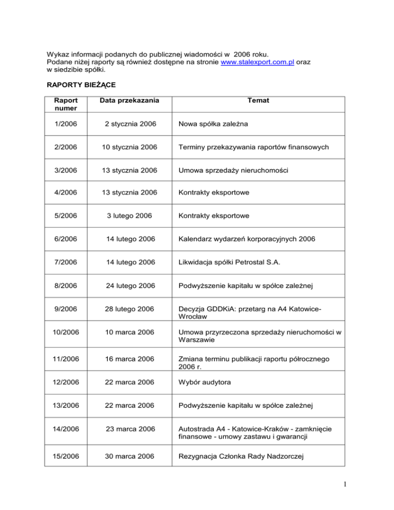 Wykaz informacji podanych do publicznej wiadomości w 2006 roku. Podane niżej raporty są również dostępne na stronie www.stalexport.com.pl oraz w siedzibie spółki. RAPORTY BIEŻĄCE Raport numer Data przekazania Temat 1/2006 2 stycznia 2006 2/2006 10 stycznia 2006 Terminy przekazywania raportów finansowych 3/2006 13 stycznia 2006 Umowa sprzedaży nieruchomości 4/2006 13 stycznia 2006 Kontrakty eksportowe 5/2006 3 lutego 2006 Kontrakty eksportowe 6/2006 14 lutego 2006 Kalendarz wydarzeń korporacyjnych 2006 7/2006 14 lutego 2006 Likwidacja spółki Petrostal S.A. 8/2006 24 lutego 2006 Podwyższenie kapitału w spółce zależnej 9/2006 28 lutego 2006 Decyzja GDDKiA: przetarg na A4 KatowiceWrocław 10/2006 10 marca 2006 Umowa przyrzeczona sprzedaży nieruchomości w Warszawie 11/2006 16 marca 2006 Zmiana terminu publikacji raportu półrocznego 2006 r. 12/2006 22 marca 2006 Wybór audytora 13/2006 22 marca 2006 Podwyższenie kapitału w spółce zależnej 14/2006 23 marca 2006 Autostrada A4 - Katowice-Kraków - zamknięcie finansowe - umowy zastawu i gwarancji 15/2006 30 marca 2006 Rezygnacja Członka Rady Nadzorczej Nowa spółka zależna 1 16/2006 31 marca 2006 Zamiar zwołania ZWZA 08.06.2006 r. 17/2006 20 kwietnia 2006 Kontrakty krajowe 18/2006 21 kwietnia 2006 Nadzwyczajne Walne Zgromadzenie Akcjonariuszy 24.05.2007 r. 19/2006 4 maja 2006 Podpisanie Porozumienia z Bankami ws WRJ 20/2006 10 maja 2006 NWZA 24.05.2006 - projekty uchwał 21/2006 17 maja 2006 Zmiana terminu ZWZA 22/2006 18 maja 2006 Umowa kredytowa 23/2006 23 maja 2006 Lista Akcjonariuszy na NWZA 24.05, DIA-S 24/2006 24 maja 2006 Raport po NWZA: przyjęte uchwały, zmiany w RN i akcjonariat powyżej 5% 25/2006 26 maja 2006 Podpisano Umowę Gwarancji 26/2006 29 maja 2006 Ustanowienie hipoteki 27/2006 29 maja 2006 Rozstrzygnięcie przez Sąd Arbitrażowy 28/2006 30 maja 2006 Terminy przekazania raportów rocznych za 2005 r. i spotkanie z inwestorami 29/2006 31maja 2006 Życiorysy nowo powołanych członków Rady Nadzorczej 30/2006 6 czerwca 2006 Podwyższenie kapitału 30/2006 12 czerwca 2006 Korekta do raportu 30 z dnia 05.06.2006 r. 31/2006 8 czerwca 2006 Porządek obrad ZWZA 30.06.2006 2 32/2006 8 czerwca 2006 Umowa leasingowa 33/2006 12 czerwca 2006 Przydział akcji serii F 34/2006 13 czerwca 2006 Ocena sytuacji Spółki przez Radę Nadzorczą 35/2006 14 czerwca 2006 Projekty uchwał na ZWZA 30.06.2006 36/2006 27 czerwca 2006 Lista Akcjonariuszy na ZWZA 30.06 2006 DIA-S 37/2006 27 czerwca 2006 Umowa z Autostrade S.p.A. 38/2006 27 czerwca 2006 Podwyższenie kapitału 39/2006 27 czerwca 2006 Przydział akcji serii F (kolejna transza) 40/2006 29 czerwca 2006 Wykaz raportów bieżących za 2005 rok 41/2006 30 czerwca 2006 Sprzedaż nieruchomości 42/2006 30 czerwca 2006 Po ZWZA 30.06 2006, Akcjonariat powyżej 5%, Uchwały, ład korporacyjny 2006 r. 43/2006 10 lipca 2006 Rejestracja podwyższenia kapitału Spółki 44/2006 13 lipca 2006 Rezygnacja Członka Rady Nadzorczej 45/2006 21 lipca 2006 ZWZA kontynuacja 46/2006 3 sierpnia 2006 Podwyższenie kapitału 47/2006 3 sierpnia 2006 Kontrakty eksportowe 48/2006 9 sierpień 2006 Zawiadomienie od akcjonariusza 49/2006 16 sierpnia 2006 Kontrakty eksportowe 50/2006 16 sierpnia 2006 Zwołanie NWZA 08.09.2006r. 3 51/2006 16 sierpnia 2006 Podpisanie znaczącej umowy 52/2006 16 sierpnia 2006 ZWZA, pozew akcjonariusza 53/2006 21 sierpnia 2006 Uchwały NWZA 8 września 2006 r. 54/2006 22 sierpnia 2006 Kontrakty eksportowe 55/2006 23 sierpnia 2006 Kontrakty eksportowe 56/2006 25 sierpnia 2006 Rezygnacja Członka Rady Nadzorczej 57/2006 31 sierpnia 2006 Przeniesienie prawa użytkowania wieczystego 58/2006 1 września 2006 Zawiadomienie od akcjonariusza 59/2006 6 września 2006 kontrakty eksportowe 60/2006 6 września 2006 Lista akcjonariuszy- DIA-S 61/2006 8 września 2006 Raport po NWZA 08.09.2006 r. Uchwały, Akcjonariat powyżej 5%, Zmiany w RN 62/2006 12 września 2006 Kontrakty eksportowe 63/2006 12 września 2006 64/2006 15 września 2006 Wykreślenie spółki Centrostal Profil Sp. z o.o. z KRS Zakup nieruchomości 65/2006 18 września 2006 Komunikat Spółki 66/2006 19 września 2006 Życiorysy Członków Rady Nadzorczej 67/2006 19 września 2006 Zakup akcji przez osobę nadzorującą 68/2006 26 września 2006 Komunikat Rady Nadzorczej Spółki 4 69/2006 27 września 2006 Porządek obrad NWZA 20.10.2006r. 70/2006 2 października 2006 Kontrakty eksportowe 71/2006 4 października 2006 Nowy akcjonariusz - zawiadomienie 72/2006 4 października 2006 Uzupełnienie do SA-PS 73/2006 5 października 2006 Kontrakty eksportowe 74/2006 9 października 2006 Kontrakty eksportowe 75/2006 9 października 2006 Nowy akcjonariusz 76/2006 9 października 2006 Objęcie akcji Centrozap SA 77/2006 13 października 2006 Projekty uchwał NWZA 20.10.2006r. 78/2006 18 października 2006 Zwołanie NWZA na 09.11.2006r. 79/2006 18 października 2006 Lista akcjonariuszy na NWZA 20.10.2006 r- DIA-S 80/2006 20 października 2006 Po NWZA 20.10.2006 - uchwały, akcjonariat powyżej 5% 81/2006 21 października 2006 Komunikat Rady Nadzorczej Spółki 82/2006 21 października 2006 Komunikat Zarządu Spółki 83/2006 23 października 2006 Odwołanie NWZA zwołanego na dzień 9.11.2006 r. 84/2006 8 listopada 2006 85/2006 9 listopada 2006 Zwołanie NWZA 20.12.2006 r. 86/2006 15 listopad 2006 Opina i Raport BDO do SA-RS 2005 Spotkanie inwestorskie 5 87/2006 16 listopad 2006 Podpisanie Umowy Kredytowej 88/2006 17 listopad 2006 Decyzja UOKiK 89/2006 20 listopad 2006 Wyłączenie Spółki z segmentu Plus 90/2006 28 listopada 2006 Zmiana w porządku obrad NWZA 20.12.2006 r. 91/2006 29 listopada 2006 Zatwierdzenie prospektu emisyjnego akcji serii F 92/2006 12 grudnia 2006 Projekty uchwał NWZA 20.12.2006 r. 93/2006 13 grudnia 2006 Wybór rewidenta do spraw szczególnych 94/2006 19 grudnia 2006 Lista akcjonariuszy -NWZA 20.12 , DIA-S 95/2006 20 grudnia 2006 Aneks nr 1 do Prospektu 96/2005 20 grudnia 2006 Przerwa w NWZA 