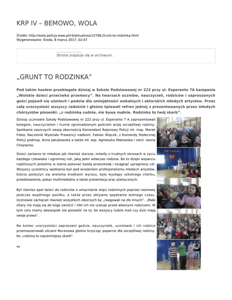 KRP IV – BEMOWO, WOLA Źródło: http://wola.policja.waw.pl/r4/aktualnosci/2766,Grunt-to-rodzinka.html Wygenerowano: Środa, 8 marca 2017, 02:47 Strona znajduje się w archiwum. „GRUNT TO RODZINKA” Pod takim hasłem przebiegała dzisiaj w Szkole Podstawowej nr 222 przy ul. Esperanto 7A kampania „Wolskie dzieci przeciwko przemocy”. Na twarzach uczniów, nauczycieli, rodziców i zaproszonych gości pojawił się uśmiech i podziw dla umiejętności wokalnych i aktorskich młodych artystów. Przez całą uroczystość wszyscy radośnie i głośno śpiewali refren jednej z prezentowanych przez młodych chórzystów piosenki: „z rodzinką cudnie, nie bywa nudnie. Rodzinka to twój skarb”. Dzisiaj uczniowie Szkoły Podstawowej nr 222 przy ul. Esperanto 7 A zaprezentowali kolegom, nauczycielom i licznie zgromadzonym gościom wizję szczęśliwej rodziny. Spotkanie zaszczycili swoją obecnością Komendant Rejonowy Policji mł. insp. Marek Fidos, Naczelnik Wydziału Prewencji nadkom. Fabian Więcek, z Komendy Stołecznej Policji podinsp. Anna Jakubowska a także mł. asp. Agnieszka Makowska i sierż. Iwona Chojnacka. Dzieci zarówno te młodsze jak również starsze, mówiły o trudnych okresach w życiu każdego człowieka i ogromnej roli, jaką pełni wówczas rodzina. Bo to dzięki wsparciu najbliższych jesteśmy w stanie pokonać każdą przeszkodę i osiągnąć upragniony cel. Wszyscy uczestnicy spotkania byli pod wrażeniem profesjonalizmu młodych artystów, którzy posłużyli się wieloma środkami wyrazu, były występy szkolnego chórku, przedstawienia, pokaz multimedialny a także prezentacja prac plastycznych. Był również apel dzieci do rodziców o umacnianie więzi rodzinnych poprzez rozmowy podczas wspólnego posiłku, a także przez aktywne spędzanie wolnego czasu. Uczniowie zachęcali również wszystkich obecnych by „reagowali na zło innych”. „Małe ofiary nie mają się do kogo zwrócić i nikt ich nie uratuje przed własnymi rodzicami. W tym celu mamy obowiązek nie pozwolić na to, bo wszyscy ludzie mali czy duzi mają swoje prawa”. Na koniec uroczystości zaproszeni goście, nauczyciele, uczniowie i ich rodzice przemaszerowali ulicami Muranowa głośno krzycząc poparcie dla szczęśliwej rodziny, bo „rodzina to najcenniejszy skarb”. eg Ocena: 0/5 (0) Tweetnij