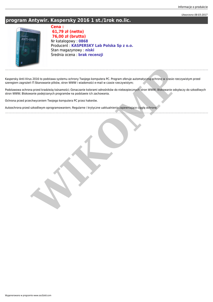 Informacje o produkcie Utworzono 08-03-2017 program Antywir. Kaspersky 2016 1 st./1rok no.lic. Cena : 61,79 zł (netto) 76,00 zł (brutto) Nr katalogowy : 0868 Producent : KASPERSKY Lab Polska Sp z o.o. Stan magazynowy : niski Średnia ocena : brak recenzji P Kaspersky Anti-Virus 2016 to podstawa systemu ochrony Twojego komputera PC. Program oferuje automatyczną ochronę w czasie rzeczywistym przed szeregiem zagrożeń IT:Skanowanie plików, stron WWW i wiadomości e-mail w czasie rzeczywistym; Podstawowa ochrona przed kradzieżą tożsamości; Oznaczanie kolorami odnośników do niebezpiecznych stron WWW; Blokowanie odsyłaczy do szkodliwych stron WWW; Blokowanie podejrzanych programów na podstawie ich zachowania. O M Ochrona przed przechwyceniem Twojego komputera PC przez hakerów. W IK Autoochrona przed szkodliwym oprogramowaniem; Regularne i krytyczne uaktualnienia zapewniające ciągłą ochronę. Wygenerowano w programie www.oscGold.com