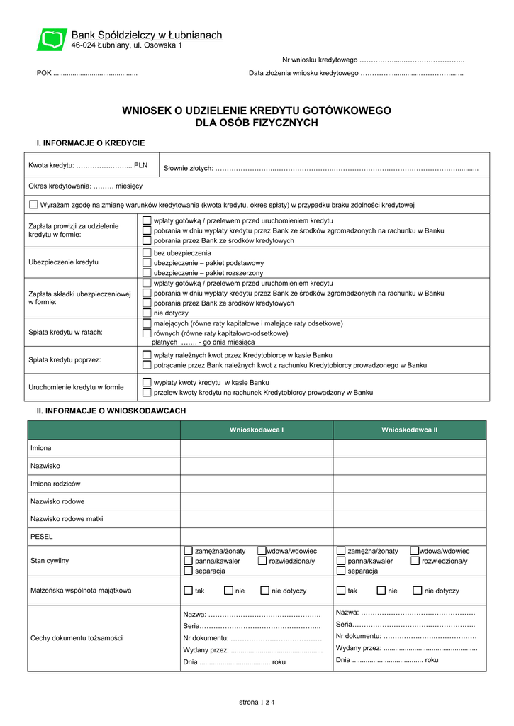 Bank Spółdzielczy w Łubnianach 46-024 Łubniany, ul. Osowska 1 Nr wniosku kredytowego ……………......…………………….. Data złożenia wniosku kredytowego ………….................…………........ POK ............................................ WNIOSEK O UDZIELENIE KREDYTU GOTÓWKOWEGO DLA OSÓB FIZYCZNYCH I. INFORMACJE O KREDYCIE Kwota kredytu: …………….……... PLN Słownie złotych: ……………………..…………………….…………………….…………………………........... Okres kredytowania: ……… miesięcy Wyrażam zgodę na zmianę warunków kredytowania (kwota kredytu, okres spłaty) w przypadku braku zdolności kredytowej Zapłata prowizji za udzielenie kredytu w formie: wpłaty gotówką / przelewem przed uruchomieniem kredytu pobrania w dniu wypłaty kredytu przez Bank ze środków zgromadzonych na rachunku w Banku pobrania przez Bank ze środków kredytowych Ubezpieczenie kredytu bez ubezpieczenia ubezpieczenie – pakiet podstawowy ubezpieczenie – pakiet rozszerzony Zapłata składki ubezpieczeniowej w formie: Spłata kredytu w ratach: wpłaty gotówką / przelewem przed uruchomieniem kredytu pobrania w dniu wypłaty kredytu przez Bank ze środków zgromadzonych na rachunku w Banku pobrania przez Bank ze środków kredytowych nie dotyczy malejących (równe raty kapitałowe i malejące raty odsetkowe) równych (równe raty kapitałowo-odsetkowe) płatnych ……. - go dnia miesiąca Spłata kredytu poprzez: wpłaty należnych kwot przez Kredytobiorcę w kasie Banku potrącanie przez Bank należnych kwot z rachunku Kredytobiorcy prowadzonego w Banku Uruchomienie kredytu w formie wypłaty kwoty kredytu w kasie Banku przelew kwoty kredytu na rachunek Kredytobiorcy prowadzony w Banku II. INFORMACJE O WNIOSKODAWCACH Wnioskodawca I Wnioskodawca II Imiona Nazwisko Imiona rodziców Nazwisko rodowe Nazwisko rodowe matki PESEL Stan cywilny zamężna/żonaty panna/kawaler separacja Małżeńska wspólnota majątkowa tak Cechy dokumentu tożsamości nie wdowa/wdowiec rozwiedziona/y nie dotyczy zamężna/żonaty panna/kawaler separacja tak nie wdowa/wdowiec rozwiedziona/y nie dotyczy Nazwa: …………………………………………. Nazwa: ………………………….………………. Seria…………………………………………….. Seria…………………………….……………….. Nr dokumentu: ……………….………………… Nr dokumentu: …………….…….……………… Wydany przez: ................................................ Wydany przez: ................................................. Dnia ..................................... roku Dnia ..................................... roku strona 1 z 4 Wnioskodawca I Adres zameldowania Adres do korespondencji Nr telefonu (do wyboru) Wnioskodawca II Ulica: ………………………….…………………. Ulica: ……………………………………………... Nr domu: ………………….…………………….. Nr domu: …………………………………………. Nr lokalu………………….……………………… Nr lokalu: …………………….…………………… Kod: ……………………………………………... Kod: …………………………….………………… Miejscowość: …………………….……………… Miejscowość………………….………………….. Kraj: ……………………………………………... Kraj: ………………………….…………………… Ulica……...………………………….…………… Ulica……...…………………….….……………… Nr domu: ……...………………………………… Nr domu: ……...…………………….…………… Nr lokalu: ……...……………...………………… Nr lokalu: ……...…………….…………………… Kod……...………….……….…………………… Kod……...………..…………….………………… Miejscowość: ……...…………………………… Miejscowość: …………....……………………… Kraj: ……...……………………………………… Kraj: ……...…………….………………………… Stacjonarny…………………………….………… stacjonarny: ……………………………………… komórkowy: ………………………….………….. komórkowy: ……………………….……………… E-mail: Wykształcenie wyższe magisterskie licencjat/inżynier średnie zasadnicze zawodowe podstawowe/gimnazjalne wyższe magisterskie licencjat/inżynier średnie zasadnicze zawodowe podstawowe/gimnazjalne nie posiadam posiadam POL-Konto ................................ nie posiadam posiadam POL-Konto ................................ Wykonywany zawód Rachunek typu POL-Konto III. INFORMACJE O DOCHODACH I WYDATKACH Wnioskodawca I Wnioskodawca II Całkowity staż pracy (w latach) Okres zatrudnienia u obecnego pracodawcy/czas prowadzenia obecnej dział. gospodarczej (w latach) Informacje o pracodawcy (nazwa, adres) Stanowisko Miesięczny dochód netto: Źródła dochodu właściciel firmy wyższa kadra zarządzająca średnia kadra zarządzająca urzędnik specjalista pracownik inne ……………………………………... ..................................... PLN, w tym: umowa o pracę: .................................. emerytura: .......................................... renta: .................................................. zasiłek przedemerytalny: .................... wolne zawody: .................................... działalność gospodarcza: ................... działalność rolnicza: ........................... umowa cywilno-prawna: ..................... umowa najmu: .................................... umowa o pracę na czas określony do…….................: ........................... odsetki z aktywów fi