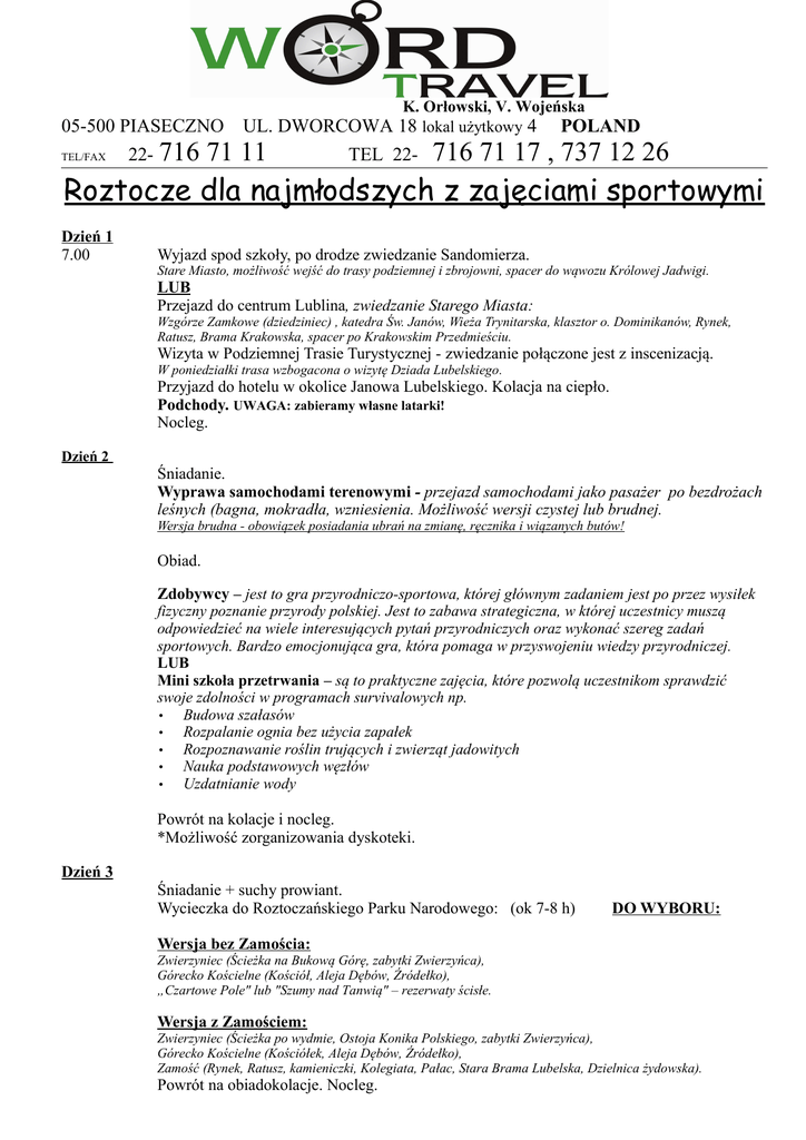 05-500 PIASECZNO TEL/FAX 22- 716 71 K. Orłowski, V. Wojeńska UL. DWORCOWA 18 lokal użytkowy 4 POLAND 11 TEL 22- 716 71 17 , 737 12 26 Roztocze dla najmłodszych z zajęciami sportowymi Dzień 1 7.00 Wyjazd spod szkoły, po drodze zwiedzanie Sandomierza. Stare Miasto, możliwość wejść do trasy podziemnej i zbrojowni, spacer do wąwozu Królowej Jadwigi. LUB Przejazd do centrum Lublina, zwiedzanie Starego Miasta: Wzgórze Zamkowe (dziedziniec) , katedra Św. Janów, Wieża Trynitarska, klasztor o. Dominikanów, Rynek, Ratusz, Brama Krakowska, spacer po Krakowskim Przedmieściu. Wizyta w Podziemnej Trasie Turystycznej - zwiedzanie połączone jest z inscenizacją. W poniedziałki trasa wzbogacona o wizytę Dziada Lubelskiego. Przyjazd do hotelu w okolice Janowa Lubelskiego. Kolacja na ciepło. Podchody. UWAGA: zabieramy własne latarki! Nocleg. Dzień 2 Śniadanie. Wyprawa samochodami terenowymi - przejazd samochodami jako pasażer po bezdrożach leśnych (bagna, mokradła, wzniesienia. Możliwość wersji czystej lub brudnej. Wersja brudna - obowiązek posiadania ubrań na zmianę, ręcznika i wiązanych butów! Obiad. Zdobywcy – jest to gra przyrodniczo-sportowa, której głównym zadaniem jest po przez wysiłek fizyczny poznanie przyrody polskiej. Jest to zabawa strategiczna, w której uczestnicy muszą odpowiedzieć na wiele interesujących pytań przyrodniczych oraz wykonać szereg zadań sportowych. Bardzo emocjonująca gra, która pomaga w przyswojeniu wiedzy przyrodniczej. LUB Mini szkoła przetrwania – są to praktyczne zajęcia, które pozwolą uczestnikom sprawdzić swoje zdolności w programach survivalowych np. • Budowa szałasów • Rozpalanie ognia bez użycia zapałek • Rozpoznawanie roślin trujących i zwierząt jadowitych • Nauka podstawowych węzłów • Uzdatnianie wody Powrót na kolacje i nocleg. *Możliwość zorganizowania dyskoteki. Dzień 3 Śniadanie + suchy prowiant. Wycieczka do Roztoczańskiego Parku Narodowego: (ok 7-8 h) DO WYBORU: Wersja bez Zamościa: Zwierzyniec (Ścieżka na Bukową Górę, zabytki Zwierzyńca), Górecko Kościelne (Kościół, Aleja Dębów, Źródełko), „Czartowe Pole" lub "Szumy nad Tanwią" – rezerwaty ścisłe. Wersja z Zamościem: Zwierzyniec (Ścieżka po wydmie, Ostoja Konika Polskiego, zabytki Zwierzyńca), Górecko Kościelne (Kościółek, Aleja Dębów, Źródełko), Zamość (Rynek, Ratusz, kamieniczki, Kolegiata, Pałac, Stara Brama Lubelska, Dzielnica żydowska). Powrót na obiadokolacje. Nocleg. Dzień 4 Śniadanie. Wyjazd na wycieczkę do Zwierzyńca : zwiedzanie muzeum przyrodniczego + lekcja 1 temat do wyboru: 1. Przyrodnicze zabawy ruchowe pokazujące zależności przyrodnicze w przyrodzie Zabawy przyrodnicze pokazujące różne zależności pokarmowe, siedliskowe na przykładzie starego drzewa. Dzieci wybierają sobie zwierzęta, które są związane z życiem drzewa np. dzięcioł, zwójka zieloneczka, pająk i tworzą sieć zależności. 2. Drzewa i krzewy w najbliższym otoczeniu. Poznajemy drzewa i krzewy występujące przy Ośrodku Edukacyjno – Muzealnym. Znajdujemy cechy odróżniające gatunki od siebie. Poznajemy świerk, jodłę, buk, sosnę. Przejazd do Zagrody Guciów – zwiedzanie muzeum etnograficzno - przyrodniczego. Możliwość wykupienia warsztatów i/ lub ogniska: - pokaz pieczenia podpłomyków, degustacja; - wyrób masła, degustacja; - warsztaty garncarskie; - ognisko z kiełbaską, chleb, keczup i musztarda; Powrót do hotelu na późny obiad. Zagadka Kryminalna: Jest to gra, która pozwala uczestnikom na wcielenie się w rolę detektywów mających do rozwiązania pewną zagadkę kryminalną. Uczestnicy podzieleni na zespoły poszukiwawcze będą musieli odnaleźć w terenie ukryte szczątki 25 informacji związanej z śmiercią wilka. Aby zdobyć niektóre elementy historii będą musieli stawiać czoła różnym wyzwaniom fizycznym umysłowym. Kryminalna zagadka jest to gra o skomplikowanej fabule, która wciąga uczestników w dobrą, bezpieczną zabawę. Kolacja plenerowa (grill). Nocleg. Dzień 5 Śniadanie. Zwariowana olimpiada-uczestnicy w grupach 5-osobowych rywalizują w 20 różnych konkurencjach np.: 18.30-19.30 Narty 5-osobowe – członkowie zespołu mają za zadanie przejść określony odcinek drogi na specjalnie przygotowanych nartach. Głównym zadaniem w tej konkurencji jest skoordynowanie ruchów całego zespołu. Spodnie 5-osobowe - wesoła konkurencja, która polega na wyścigu w specjalnych, gigantycznych spodniach. Worki 5-osobowe – konkurencja z dziecięcych lat, która przy dopingu pozostałych uczestników stanowi bardzo dobrą, wesołą zabawę. Wyścig chomików – konkurencja, w której 5-osobowe zespoły mogą wczuć się w „los biednego chomika” , pokonującego wyznaczoną trasę. Wyścig rydwanów – konkurencja, w której oprócz siły, sprawności, zaufania, współpracy, wymagana jest odwaga osoby znajdującej się na rydwanie. Bolkowe narty - konkurencja, w której 5-osobowe zespoły pokonują trasę na bolkowych nartach. Jest to zabawa wymagająca zgrania, współpracy całego zespołu. Przeciąganie liny - najbardziej popularna konkurencja na wszystkich imprezach integracyjnych, przeznaczona dla dzieci i dorosłych. Siatka Tekli - wesoła konkurencja polegająca na pokonaniu sieci przez dwa 6 osobowe zespoły. Walka kogutów – konkurencja polega na przeciąganiu się dwóch osób. Rura - zadanie zespołowe polegające na napełnieniu specjalnie przygotowanej rury wodą. Cyrkiel – integrująca zespół zabawa polegająca na wyścigu dwóch specjalnie przygotowanych cyrkli. Gąsienica - wesoła konkurencja dla trzech 5 osobowych zespołów, polegająca na wyścigu gąsienic. Mega supeł - konkurencja zmuszająca wszystkich uczestników do kreatywnego działania w zespole. Jazda na rowerze przeciwskrętnym – konkurencja polegająca na pokonaniu slalomu na rowerze. Jedynym utrudnieniem jest fakt, iż w rowerze wszystko d