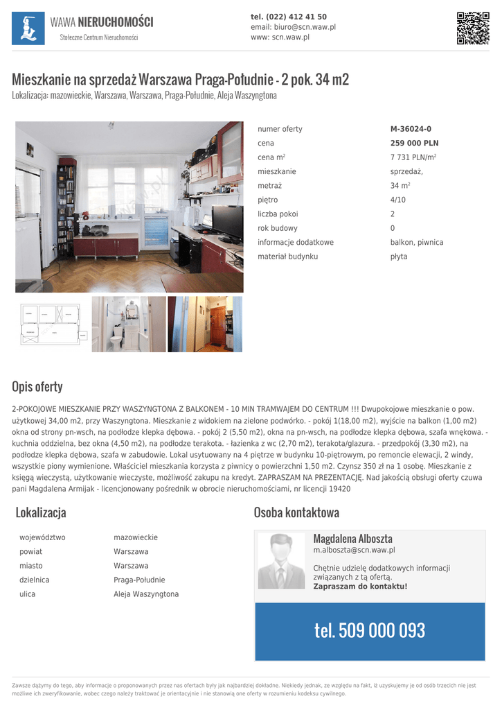 tel. (022) 412 41 50 email: [email protected] www: scn.waw.pl Mieszkanie na sprzedaż Warszawa Praga-Południe - 2 pok. 34 m2 Lokalizacja: mazowieckie, Warszawa, Warszawa, Praga-Południe, Aleja Waszyngtona numer oferty M-36024-0 cena 259 000 PLN cena m 7 731 PLN/m2 mieszkanie sprzedaż, metraż 34 m2 piętro 4/10 liczba pokoi 2 rok budowy 0 informacje dodatkowe balkon, piwnica materiał budynku płyta 2 Opis oferty 2-POKOJOWE MIESZKANIE PRZY WASZYNGTONA Z BALKONEM - 10 MIN TRAMWAJEM DO CENTRUM !!! Dwupokojowe mieszkanie o pow. użytkowej 34,00 m2, przy Waszyngtona. Mieszkanie z widokiem na zielone podwórko. - pokój 1(18,00 m2), wyjście na balkon (1,00 m2) okna od strony pn-wsch, na podłodze klepka dębowa. - pokój 2 (5,50 m2), okna na pn-wsch, na podłodze klepka dębowa, szafa wnękowa. kuchnia oddzielna, bez okna (4,50 m2), na podłodze terakota. - łazienka z wc (2,70 m2), terakota/glazura. - przedpokój (3,30 m2), na podłodze klepka dębowa, szafa w zabudowie. Lokal usytuowany na 4 piętrze w budynku 10-piętrowym, po remoncie elewacji, 2 windy, wszystkie piony wymienione. Właściciel mieszkania korzysta z piwnicy o powierzchni 1,50 m2. Czynsz 350 zł na 1 osobę. Mieszkanie z księgą wieczystą, użytkowanie wieczyste, możliwość zakupu na kredyt. ZAPRASZAM NA PREZENTACJĘ. Nad jakością obsługi oferty czuwa pani Magdalena Armijak - licencjonowany pośrednik w obrocie nieruchomościami, nr licencji 19420 Lokalizacja Osoba kontaktowa Magdalena Alboszta województwo mazowieckie powiat Warszawa [email protected] miasto Warszawa dzielnica Praga-Południe ulica Aleja Waszyngtona Chętnie udzielę dodatkowych informacji związanych z tą ofertą. Zapraszam do kontaktu! tel. 509 000 093 Zawsze dążymy do tego, aby informacje o proponowanych przez nas ofertach były jak najbardziej dokładne. Niekiedy jednak, ze względu na fakt, iż uzyskujemy je od osób trzecich nie jest możliwe ich zweryfikowanie, wobec czego należy traktować je orientacyjnie i nie stanowią one oferty w rozumieniu kodeksu cywilnego.