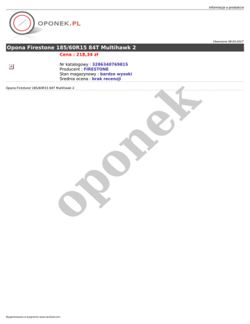 Informacje o produkcie Utworzono 08-03-2017 Opona Firestone 185/60R15 84T Multihawk 2 Cena : 218,34 zł Nr katalogowy : 3286340769815 Producent : FIRESTONE Stan magazynowy : bardzo wysoki Średnia ocena : brak recenzji op on ek Opona Firestone 185/60R15 84T Multihawk 2 Wygenerowano w programie www.oscGold.com