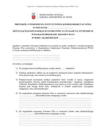 Załącznik nr 7 do Regulaminu Organizacji Współpracy Międzynarodowej PWSZ w Nysie PROTOKÓŁ Z POSIEDZENIA INSTYTUTOWEJ KOMISJI REKRUTACYJNEJ W INSYTUCIE ………..……………………. DOTYCZĄCEGO KWALIFIKACJI STUDENTÓW NA WYJAZD NA STYPENDIUM W RAMACH PROGRAMU ERASMUS PLUS W ROKU AKADEMICKIM ……………….… Zgodnie z zasadami rekrutacji studentów na wyjazdy na studia i praktyki w ramach programu Erasmus Plus zawartymi w Regulaminie Organizacji Wymiany Międzynarodowej PWSZ w Nysie, komisja kwalifikacyjna w składzie: ………………………………………………………… ………………………………………………………… ………………………………………………………… stwierdza, co następuje: 1) W postępowaniu kwalifikacyjnym wzięło udział …… studentów. 2) Selekcja studentów odbyła się na podstawie złożonych przez studenta dokumentów, testu językowego oraz rozmowy kwalifikacyjnej. 3) Podstawowymi kryteriami selekcji studentów były: wyniki w nauce, znajomość języka/języków obcych, opinia koordynatora instytutowego / opiekuna, współpraca z Biurem Współpracy Międzynarodowej oraz praca na rzecz uczelni, jako dodatkowe kryteria pod uwagę brane były: działalność w kołach naukowych, szczególne osiągnięcia, listy rekomendacyjne. 4) Na stypendium programu Erasmus Plus w semestrze zimowym roku akademickiego ……………..…… zakwalifikowano następujące osoby: ………………………………………………………………………………………… ………………………………………………………………………………………… ………………………………………………………………………………………… ………………………………………………………………………………………… ………………………………………………………………………………………… 5) Na stypendium programu Erasmus Plus w semestrze letnim roku akademickiego ……………..….. zakwalifikowano następujące osoby: ………………………………………………………………………………………… ………………………………………………………………………………………… ………………………………………………………………………………………… ………………………………………………………………………………………… ………………………………………………………………………………………… Załącznik nr 7 do Regulaminu Organizacji Współpracy Międzynarodowej PWSZ w Nysie 6) Na stypendium programu Erasmus Plus nie zakwalifikowały się następujące osoby: ………………………………………………………………………………………… ………………………………………………………………………………………… ………………………………………………………………………………………… ………………………………………………………………………………………… ………………………………………………………………………………………… 7) Na liście rezerwowej znajdują się następujące osoby / brak listy rezerwowej: ………………………………………………………………………………………… ………………………………………………………………………………………… ………………………………………………………………………………………… ………………………………………………………………………………………… ………………………………………………………………………………………… W przypadku wolnych miejsc Instytutowa Komisja Rekrutacyjna zobowiązuje się do przeprowadzenia dodatkowej rekrutacji. Nysa, dnia…………………….