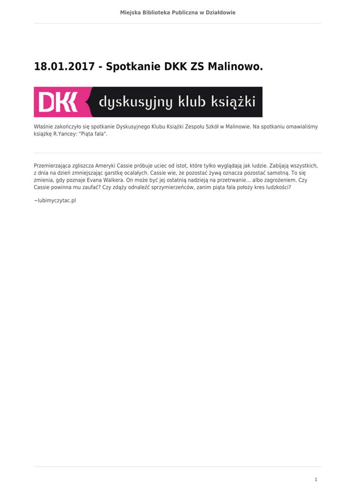 Miejska Biblioteka Publiczna w Działdowie 18.01.2017 - Spotkanie DKK ZS Malinowo. Właśnie zakończyło się spotkanie Dyskusyjnego Klubu Książki Zespołu Szkół w Malinowie. Na spotkaniu omawialiśmy książkę R.Yancey: "Piąta fala". Przemierzająca zgliszcza Ameryki Cassie próbuje uciec od istot, które tylko wyglądają jak ludzie. Zabijają wszystkich, z dnia na dzień zmniejszając garstkę ocalałych. Cassie wie, że pozostać żywą oznacza pozostać samotną. To się zmienia, gdy poznaje Evana Walkera. On może być jej ostatnią nadzieją na przetrwanie… albo zagrożeniem. Czy Cassie powinna mu zaufać? Czy zdąży odnaleźć sprzymierzeńców, zanim piąta fala położy kres ludzkości? ~lubimyczytac.pl 1