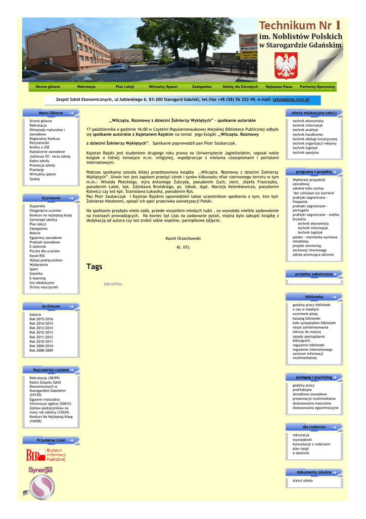 Strona główna Rekrutacja Plan Lekcji Wirtualny Spacer Zastępstwa Szkoły dla Dorosłych Najlepsza Klasa Partnerzy-Sponsorzy Zespół Szkół Ekonomicznych, ul.Sobieskiego 6, 83-200 Starogard Gdański, tel./fax +48 (58) 56 222 49, e-mail: [email protected] Menu Główne Strona główna Rekrutacja Olimpiady maturalne i zawodowe Regionalny Konkurs Recytatorski Krótko o ZSE Kształcenie zawodowe Jubileusz 50 - lecia szkoły Kadra szkoły Promocja szkoły Przetargi Wirtualny spacer Szukaj Uczniowie Stypendia Osiągnięcia uczniów Konkurs na najlepszą klasę Samorząd szkolny Plan lekcji Zastępstwa Matura Egzaminy zawodowe Praktyki zawodowe E-dziennik Poczta dla uczniów Kanał RSS Wykaz podręczników Wydarzenia Sport Gazetka E-learning Gry edukacyjne Strony nauczycieli oferta edukacyjna szkoły ,,Wilczęta. Rozmowy z dziećmi Żołnierzy Wyklętych” – spotkanie autorskie 17 października o godzinie 16:00 w Czytelni Popularnonaukowej Miejskiej Bibliotece Publicznej odbyło się spotkanie autorskie z Kajetanem Rajskim na temat jego książki ,,Wilczęta. Rozmowy z dziećmi Żołnierzy Wyklętych”. Spotkanie poprowadził pan Piotr Szubarczyk. Kajetan Rajski jest studentem drugiego roku prawa na Uniwersytecie Jagiellońskim, napisał wiele książek o różnej tematyce m.in. religijnej, współpracuje z wieloma czasopismami i portalami internetowymi. Podczas spotkania została bliżej przedstawiona książka ,,Wilczęta. Rozmowy z dziećmi Żołnierzy Wyklętych”. Utwór ten jest zapisem przeżyć córek i synów kilkunastu ofiar czerwonego terroru w tym m.in.: Witolda Pileckiego, mjra Antoniego Żubryda, pseudonim Zuch, sierż. Józefa Franciszka, pseudonim Lalek, kpt. Zdzisława Brońskiego, ps. Uskok, dypl. Macieja Kelenkiewicza, pseudonim Kotwicz czy też kpt. Stanisława Łukasika, pseudonim Ryś. Pan Piotr Szubarczyk i Kajetan Rajskim opowiedzieli także uczestnikom spotkania o tym, kim byli Żołnierze Niezłomni, opisali ich opór przeciwko sowietyzacji Polski. Na spotkanie przybyło wiele osób, przede wszystkim młodych ludzi , co wywołało wielkie zadowolenie na twarzach prowadzących. Na koniec był czas na zadawanie pytań, można było zakupić książkę z dedykacją od autora czy też zrobić sobie wspólne, pamiątkowe zdjęcie. Kamil Orzechowski Kl. IITc technik technik technik technik technik technik technik technik ekonomista informatyk analityk handlowiec obsługi turystycznej organizacji reklamy logistyk spedytor programy i projekty Wybieram przyszłość zawodową szkolne koło caritas "der schlüssel zur karriere" praktyki zagraniczne hiszpania praktyki zagraniczne portugalia praktyki zagraniczne - wielka brytania technik ekonomista technik informatyk technik logistyk polsko - niemiecka wymiana młodzieży projekt etwinning zachowaj równowagę szkoła promująca zdrowie Tags projekty zakończone BIBLIOTEKA biblioteka Archiwum Galeria Rok 2015/2016 Rok 2014/2015 Rok 2013/2014 Rok 2012/2013 Rok 2011/2012 Rok 2010/2011 Rok 2009/2010 Rok 2008/2009 godziny pracy biblioteki o nas w mediach uczniowie piszą katalog biblioteki koło sympatyków biblioteki nasze zainteresowania lektury do matury zasady sporządzania bibliografii. regulamin biblioteki regulamin internetowego centrum informacji multimedialnej Najczęściej czytane Rekrutacja (38399) Kadra Zespołu Szkół Ekonomicznych w Starogardzie Gdańskim (24130) Egzamin maturalny informacje ogólne (20012) Zestaw podręczników na nowy rok szkolny (12624) Konkurs Na Najlepszą Klasę (10458) pedagog i psycholog godziny pracy profilaktyka doradztwo zawodowe prezentacje multimedialne dostosowania maturalne dostosowania egzaminacyjne dla rodziców Przydatne Linki rekrutacja wywiadówki konsultacje z rodzicami plan zajęć e-dziennik dokumenty szkolne statut szkoły liczba odwiedzin odwiedziło nas: 2677582 imieniny Beaty, Juliana, Wincentego Do końca roku szkolnego pozostało 107 dni. przydatne linki europejski fundusz społeczny Zespół Szkół Ekonomicznych ul.Sobieskiego 6 83-200 Starogard Gdański tel./fax +48 (58) 56 222 49 e-mail: [email protected] Czas generowania strony: 0.02s.