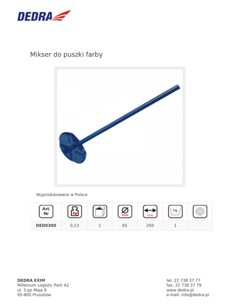 Mikser do puszki farby Wyprodukowano w Polsce DED0300 DEDRA EXIM Millenium Logistic Park A2 ul. 3-go Maja 8 05-800 Pruszków 0,13 1 65 250 1 tel. 22 738 37 77 fax. 22 738 37 79 www.dedra.pl e-mail: [email protected]