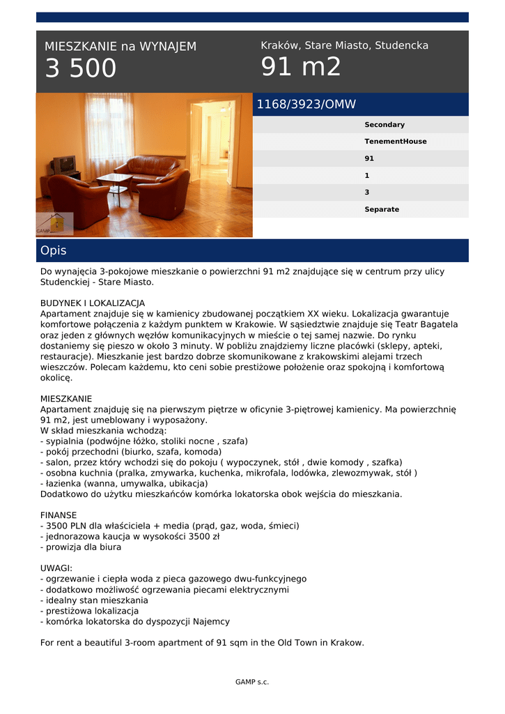MIESZKANIE na WYNAJEM 3 500 Kraków, Stare Miasto, Studencka 91 m2 1168/3923/OMW Secondary TenementHouse 91 1 3 Separate Opis Do wynajęcia 3-pokojowe mieszkanie o powierzchni 91 m2 znajdujące się w centrum przy ulicy Studenckiej - Stare Miasto. BUDYNEK I LOKALIZACJA Apartament znajduje się w kamienicy zbudowanej początkiem XX wieku. Lokalizacja gwarantuje komfortowe połączenia z każdym punktem w Krakowie. W sąsiedztwie znajduje się Teatr Bagatela oraz jeden z głównych węzłów komunikacyjnych w mieście o tej samej nazwie. Do rynku dostaniemy się pieszo w około 3 minuty. W pobliżu znajdziemy liczne placówki (sklepy, apteki, restauracje). Mieszkanie jest bardzo dobrze skomunikowane z krakowskimi alejami trzech wieszczów. Polecam każdemu, kto ceni sobie prestiżowe położenie oraz spokojną i komfortową okolicę. MIESZKANIE Apartament znajduję się na pierwszym piętrze w oficynie 3-piętrowej kamienicy. Ma powierzchnię 91 m2, jest umeblowany i wyposażony. W skład mieszkania wchodzą: - sypialnia (podwójne łóżko, stoliki nocne , szafa) - pokój przechodni (biurko, szafa, komoda) - salon, przez który wchodzi się do pokoju ( wypoczynek, stół , dwie komody , szafka) - osobna kuchnia (pralka, zmywarka, kuchenka, mikrofala, lodówka, zlewozmywak, stół ) - łazienka (wanna, umywalka, ubikacja) Dodatkowo do użytku mieszkańców komórka lokatorska obok wejścia do mieszkania. FINANSE - 3500 PLN dla właściciela + media (prąd, gaz, woda, śmieci) - jednorazowa kaucja w wysokości 3500 zł - prowizja dla biura UWAGI: - ogrzewanie i ciepła woda z pieca gazowego dwu-funkcyjnego - dodatkowo możliwość ogrzewania piecami elektrycznymi - idealny stan mieszkania - prestiżowa lokalizacja - komórka lokatorska do dyspozycji Najemcy For rent a beautiful 3-room apartment of 91 sqm in the Old Town in Krakow. GAMP s.c. BUILDING AND LOCATION The apartment is in a building from 1910. The location guarantees a comfortable connection to any point in Krakow. In vincinity there is Bagatela Theatre and one of the main hubs in the city of the same name. To get to the Market Square on foot takes about 3 minutes. Nearby you will find numerous facilities and servise trade (shops, pharmacies, restaurants etc.). I would recommend to anyone who appreciates a prestigious location and a peaceful and comfortable surroundings. FLAT The apartment is located on the first floor of a 3-storey building. It has an area of 91 sqm fully furnished and equipped. It consists of: - Bedroom (double bed, bedside tables, wardrobe) - Interconnecting room (desk, wardrobe, chest of drawers) - Living room, through which you enter the room (sofa, two armchairs, coffee table, two chests of drawers, cupboard, dining table for six people) - Separate kitchen (washing machine, dishwasher, stove with gas hob and electric oven, microwave, refrigerator, sink, table) - Bathroom (bath, washbasin, toilet) FINANCES - 3500 PLN for the owner + Utilities (electricity, gas, water, garbage) - A one-time refundable deposit of 3500 PLN - Commision for the office COMMENTS - hot water from a gas furnace - heating electric and central from gas furnace - prestigious location - storage room available to the tenant Serdecznie polecam! Bardzo proszę o kontakt lub o wypełnienie formularza na stronie: http://www.gamp-krakow.pl/zglos-poszukiwanie/ na pewno znajdziemy idealne mieszkanie, spełniające Państwa preferencje. Zachęcamy również do odwiedzenia naszej strony internetowej: www.gamp-krakow.pl KONTAKT DO AGENTA: Gabriela Bąk Tel: + 48 884 979 766 Email: [email protected] GAMP Nieruchomości. Nowa jakość. Gabriela Bąk tel. +48 884 979 766 email: [email protected] GAMP s.c. Powered by TCPDF (www.tcpdf.org)