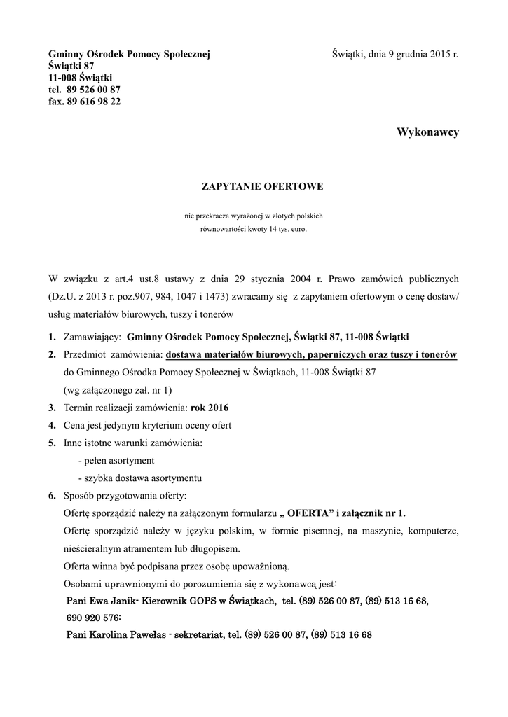 Zapytanie ofertowe materiały biurowe na 2016 rok