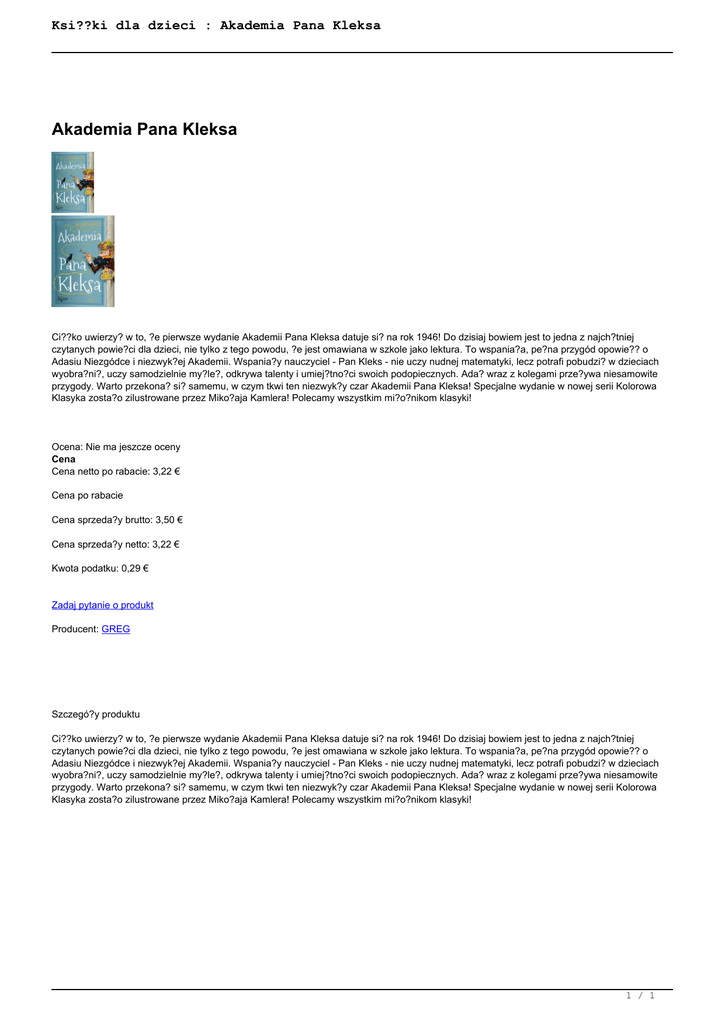 Ksi??ki dla dzieci : Akademia Pana Kleksa Akademia Pana Kleksa Ci??ko uwierzy? w to, ?e pierwsze wydanie Akademii Pana Kleksa datuje si? na rok 1946! Do dzisiaj bowiem jest to jedna z najch?tniej czytanych powie?ci dla dzieci, nie tylko z tego powodu, ?e jest omawiana w szkole jako lektura. To wspania?a, pe?na przygód opowie?? o Adasiu Niezgódce i niezwyk?ej Akademii. Wspania?y nauczyciel - Pan Kleks - nie uczy nudnej matematyki, lecz potrafi pobudzi? w dzieciach wyobra?ni?, uczy samodzielnie my?le?, odkrywa talenty i umiej?tno?ci swoich podopiecznych. Ada? wraz z kolegami prze?ywa niesamowite przygody. Warto przekona? si? samemu, w czym tkwi ten niezwyk?y czar Akademii Pana Kleksa! Specjalne wydanie w nowej serii Kolorowa Klasyka zosta?o zilustrowane przez Miko?aja Kamlera! Polecamy wszystkim mi?o?nikom klasyki! Ocena: Nie ma jeszcze oceny Cena Cena netto po rabacie: 3,22 € Cena po rabacie Cena sprzeda?y brutto: 3,50 € Cena sprzeda?y netto: 3,22 € Kwota podatku: 0,29 € Zadaj pytanie o produkt Producent: GREG Szczegó?y produktu Ci??ko uwierzy? w to, ?e pierwsze wydanie Akademii Pana Kleksa datuje si? na rok 1946! Do dzisiaj bowiem jest to jedna z najch?tniej czytanych powie?ci dla dzieci, nie tylko z tego powodu, ?e jest omawiana w szkole jako lektura. To wspania?a, pe?na przygód opowie?? o Adasiu Niezgódce i niezwyk?ej Akademii. Wspania?y nauczyciel - Pan Kleks - nie uczy nudnej matematyki, lecz potrafi pobudzi? w dzieciach wyobra?ni?, uczy samodzielnie my?le?, odkrywa talenty i umiej?tno?ci swoich podopiecznych. Ada? wraz z kolegami prze?ywa niesamowite przygody. Warto przekona? si? samemu, w czym tkwi ten niezwyk?y czar Akademii Pana Kleksa! Specjalne wydanie w nowej serii Kolorowa Klasyka zosta?o zilustrowane przez Miko?aja Kamlera! Polecamy wszystkim mi?o?nikom klasyki! 1 / 1 Powered by TCPDF (www.tcpdf.org)