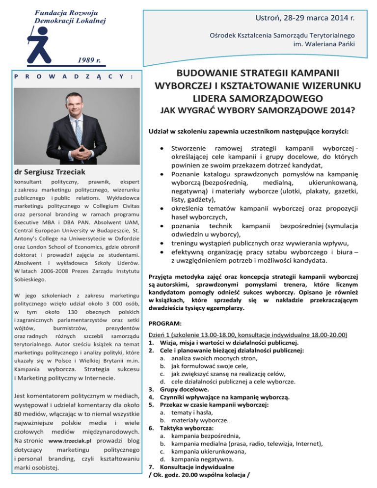 Ustroń, 28-29 marca 2014 r. Rozwiązania informatyczne Ośrodek Kształcenia Samorządu Terytorialnego im. Waleriana Pańki P R O W A D Z Ą C Y : BUDOWANIE STRATEGII KAMPANII WYBORCZEJ I KSZTAŁTOWANIE WIZERUNKU LIDERA SAMORZĄDOWEGO JAK WYGRAĆ WYBORY SAMORZĄDOWE 2014? Udział w szkoleniu zapewnia uczestnikom następujące korzyści: dr Sergiusz Trzeciak konsultant polityczny, prawnik, ekspert z zakresu marketingu politycznego, wizerunku publicznego i public relations. Wykładowca marketingu politycznego w Collegium Civitas oraz personal branding w ramach programu Executive MBA i DBA PAN. Absolwent UAM, Central European University w Budapeszcie, St. Antony’s College na Uniwersytecie w Oxfordzie oraz London School of Economics, gdzie obronił doktorat i prowadził zajęcia ze studentami. Absolwent i wykładowca Szkoły Liderów. W latach 2006-2008 Prezes Zarządu Instytutu Sobieskiego. W jego szkoleniach z zakresu marketingu politycznego wzięło udział około 3 000 osób, w tym około 130 obecnych polskich i zagranicznych parlamentarzystów oraz setki wójtów, burmistrzów, prezydentów oraz radnych różnych szczebli samorządu terytorialnego. Autor sześciu książek na temat marketingu politycznego i analizy polityki, które ukazały się w Polsce i Wielkiej Brytanii m.in. Kampania wyborcza. Strategia sukcesu i Marketing polityczny w Internecie. Jest komentatorem politycznym w mediach, występował i udzielał komentarzy dla około 80 mediów, włączając w to niemal wszystkie najważniejsze polskie media i wiele czołowych mediów międzynarodowych. Na stronie www.trzeciak.pl prowadzi blog dotyczący marketingu politycznego i personal branding, czyli kształtowaniu marki osobistej. Stworzenie ramowej strategii kampanii wyborczej określającej cele kampanii i grupy docelowe, do których powinien ze swoim przekazem dotrzeć kandydat, Poznanie katalogu sprawdzonych pomysłów na kampanię wyborczą (bezpośrednią, medialną, ukierunkowaną, negatywną) i materiały wyborcze (ulotki, plakaty, gazetki, listy, gadżety), określenia tematów kampanii wyborczej oraz propozycji haseł wyborczych, poznania technik kampanii bezpośredniej (symulacja odwiedzin u wyborcy), treningu wystąpień publicznych oraz wywierania wpływu, efektywną organizację pracy sztabu wyborczego i biura – z uwzględnieniem potrzeb i możliwości kandydata. Przyjęta metodyka zajęć oraz koncepcja strategii kampanii wyborczej są autorskimi, sprawdzonymi pomysłami trenera, które licznym kandydatom pomogły odnieść sukces wyborczy. Opisano je również w książkach, które sprzedały się w nakładzie przekraczającym dwadzieścia tysięcy egzemplarzy. PROGRAM: Dzień 1 (szkolenie 13.00-18.00, konsultacje indywidualne 18.00-20.00) 1. Wizja, misja i wartości w działalności publicznej. 2. Cele i planowanie bieżącej działalności publicznej: a. analiza swoich mocnych stron, b. jak formułować swoje cele, c. jak zwiększyć szansę na realizację celów, d. cele działalności publicznej a cele wyborcze. 3. Grupy docelowe. 4. Czynniki wpływające na kampanię wyborczą. 5. Przekaz w czasie kampanii wyborczej: a. tematy i hasła, b. materiały wyborcze. 6. Taktyka wyborcza: a. kampania bezpośrednia, b. kampania medialna (prasa, radio, telewizja, Internet), c. kampania ukierunkowana, d. kampania negatywna. 7. Konsultacje indywidualne / Ok. godz. 20.00 wspólna kolacja / D A N E D O K O N T A K T U : Ośrodek Kształcenia Samorządu Terytorialnego im. Waleriana Pańki 40-014 Katowice ul. Mariacka 1 tel/fax. 32 259 86 73, 32 253 84 09 e-mail: [email protected] www.okst.pl OSO BA DO K ONT AKT U: Marcin Smala tel. 32 259 86 73, 32 253 84 09, 32 206 98 43 w. 30, [email protected] Z G Ł O S Z E N I A Dzień 2 (szkolenie 9.00-14.00, konsultacje indywidualne 14.00-15.00) 8. Zarządzanie zespołem zaangażowanym w kampanię wyborczą. 9. Komunikacja interpersonalna oraz wywieranie wpływu. 10. Wystąpienia publiczne: a. zasady przygotowania wystąpień publicznych z uwzględnieniem celu wystąpienia, profilu odbiorców, tematu oraz dostępnych narzędzi, b. wskazówki, o czym pamiętać w trakcie wystąpień i jak reagować w sytuacjach kryzysowych, c. sposoby na uatrakcyjnienie wystąpienia. 11. Obrona przed czarnym PR. 12. Konsultacje indywidualne. Termin i godzina: 28-29 marca 2014 r. (początek: piątek 28.03 o godz. 13.00, zakończenie szkolenia w sobotę 29.03 ok. godz. 15.00) Miejsce szkolenia: Ustroń, Hotel Belweder*****, ul. Zdrojowa 15, : Wypełnioną kartę zgłoszenia należy przesłać mailem lub faksem do 14 marca 2014 r. Uwaga: Ilość miejsc ograniczona. Brak pisemnej rezygnacji na 7 dni przed szkoleniem będzie równoznaczny z obciążeniem Państwa pełnym kosztem szkolenia. www.hotelbelweder.pl Cena: 1.199 zł netto/os. zawiera udział w autorskim szkoleniu, materiały szkoleniowe, nocleg ze śniadaniem w Hotelu Belweder***** w Ustroniu, kolacja pierwszego dnia, obiad drugiego dnia szkolenia, serwis kawowy podczas szkolenia, możliwość korzystania z centrum wypoczynkowo-rekreacyjnego bez ograniczeń. Uwaga: Przy zgłoszeniu do 15 lutego 2014 r. specjalna cena szkolenia 999 zł netto/os. Karta zgłoszenia - kod szkolenia 311/14/S Nazwa Nabywcy(dane do FVAT):.................................................................................………………………………………… Ulica, nr domu: ........................................... Miejscowość…………………..………………kod pocztowy………….….……….. NIP: ............................................................. Tel......................................…………e-mail………………………..……………… 1. ............................................................................................................................................................................. imię i nazwisko, (wypełnić drukowanymi) wydział/ stanowisko 2.....................................