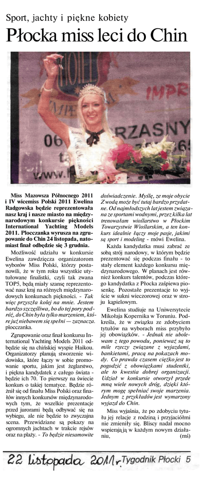 Sport, jachty i piękne kobiety Płocka miss leci do Chin Miss Mazowsza Północnego 2011 i IV wicemiss Polski 2011 Ewelina Radgowska będzie reprezentowała nasz kraj i nasze miasto na między narodowym konkursie piękności International Yachting Models 2011. Plocczanka wyrusza na zgru powanie do Chin 24 listopada, nato miast finał odbędzie się 3 grudnia. Możliwość udziału w konkursie Ewelina zawdzięcza organizatorom wyborów Miss Polski, którzy posta nowili, że w tym roku wszystkie uty tułowane finalistki, czyli tak zwana TOP5, będą miały szansę reprezento wać nasz kraj na różnych międzynaro dowych konkursach piękności. - Tak więc przyszła kolej na mnie. Jestem bardzo szczęśliwa, bo do tej pory pod róż, do Chin była tylko marzeniem, któ re już niebawem się spełni — zaznacza. plocczanka. Zgrupowanie oraz finał konkursu In ternational Yachting Models 2011 od będzie się na chińskiej wyspie Haikou. Organizatorzy planują stworzenie wi dowiska, które łączy w sobie promo wanie sportu, jakim jest żeglarstwo, i piękna kandydatek z całego świata będzie ich 70. To pierwszy na świecie konkurs o takiej tematyce. Będzie ró żnił się od finału Miss Polski oraz fina łów innych konkursów międzynarodo wych tym, że wszelkie prezentacje przed jurorami będą odbywać się na wybiegu, ale nie będzie to zwyczajna scena. Przewidziane są pokazy na ogromnych jachtach w trakcie rejsów oraz na plaży. - To będzie niesamowite doświadczenie. Myślę, ze moje obycie Z wodą może być tutaj bardzo przydat ne. Od najmłodszych lat jestem związa na ze sportami wodnymi, przez kilka lat trenowałam wioślarstwo w Płockim Towarzystwie Wioślarskim, a ten kon kurs idealnie łączy moje pasje, jakimi są sport i modeling - mówi Ewelina. Każda kandydatka musi zabrać ze sobą strój narodowy, w którym będzie prezentować się podczas finału - to stały element każdego konkursu mię dzynarodowego. W planach jest rów nież konkurs talentów, podczas które go kandydatka z Płocka zaśpiewa pio senkę. Pozostałe prezentacje to wyj ście w sukni wieczorowej oraz w stro ju kąpielowym. Ewelina studiuje na Uniwersytecie Mikołaja Kopernika w Toruniu. Pod kreśla, że w związku ze zdobyciem tytułów na wyborach miss przybyło jej obowiązków. - Jednak nie ubole wam z tego powodu, ponieważ są to mile rzeczy związane z wyjazdami, bankietami, pracą na pokazach mo dy. Co prawda czasem ciężko jest to pogodzić z obowiązkami studentki, ale to kwestia dobrej organizacji. Udział w konkursie otworzył przede mną wiele nowych dróg, dzięki któ rym mogę spełniać swoje marzenia. Jednym z przykładów jest wymarzony wyjazd do Chin. Miss wyjaśnia, że po zdobyciu tytu łu jej relacje z rodziną i przyjaciółmi nie zmieniły się. Bliscy nadal mocno wspierają ją w każdym nowym działa niu, (mś)