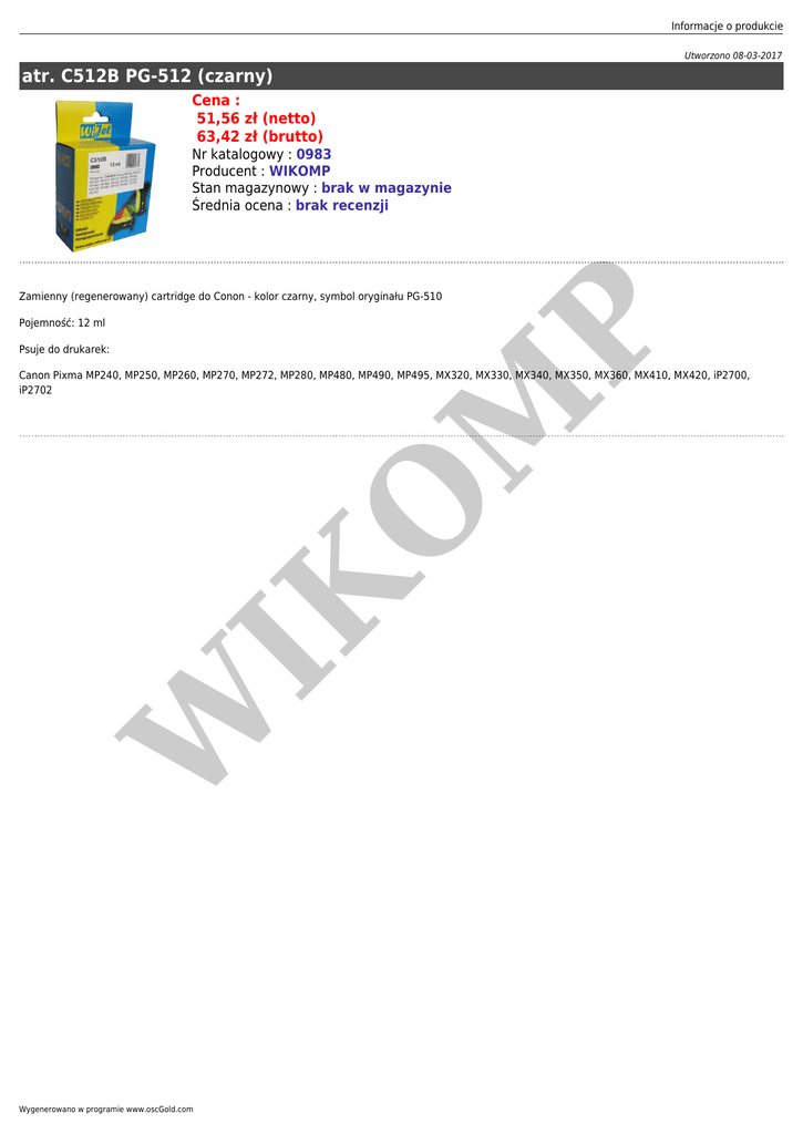 Informacje o produkcie Utworzono 08-03-2017 atr. C512B PG-512 (czarny) Cena : 51,56 zł (netto) 63,42 zł (brutto) Nr katalogowy : 0983 Producent : WIKOMP Stan magazynowy : brak w magazynie Średnia ocena : brak recenzji Zamienny (regenerowany) cartridge do Conon - kolor czarny, symbol oryginału PG-510 P Pojemność: 12 ml Psuje do drukarek: W IK O M Canon Pixma MP240, MP250, MP260, MP270, MP272, MP280, MP480, MP490, MP495, MX320, MX330, MX340, MX350, MX360, MX410, MX420, iP2700, iP2702 Wygenerowano w programie www.oscGold.com