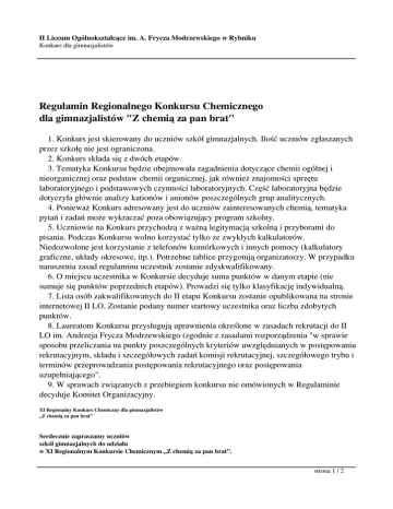II Liceum Ogólnokształcące im. A. Frycza Modrzewskiego w Rybniku Konkurs dla gimnazjalistów Regulamin Regionalnego Konkursu Chemicznego dla gimnazjalistów "Z chemią za pan brat" 1. Konkurs jest skierowany do uczniów szkół gimnazjalnych. Ilość uczniów zgłaszanych przez szkołę nie jest ograniczona. 2. Konkurs składa się z dwóch etapów. 3. Tematyka Konkursu będzie obejmowała zagadnienia dotyczące chemii ogólnej i nieorganicznej oraz podstaw chemii organicznej, jak również znajomości sprzętu laboratoryjnego i podstawowych czynności laboratoryjnych. Część laboratoryjna będzie dotyczyła głównie analizy kationów i anionów poszczególnych grup analitycznych. 4. Ponieważ Konkurs adresowany jest do uczniów zainteresowanych chemią, tematyka pytań i zadań może wykraczać poza obowiązujący program szkolny. 5. Uczniowie na Konkurs przychodzą z ważną legitymacją szkolną i przyborami do pisania. Podczas Konkursu wolno korzystać tylko ze zwykłych kalkulatorów. Niedozwolone jest korzystanie z telefonów komórkowych i innych pomocy (kalkulatory graficzne, układy okresowe, itp.). Potrzebne tablice przygotują organizatorzy. W przypadku naruszenia zasad regulaminu uczestnik zostanie zdyskwalifikowany. 6. O miejscu uczestnika w Konkursie decyduje suma punktów w danym etapie (nie sumuje się punktów poprzednich etapów). Prowadzi się tylko klasyfikację indywidualną. 7. Lista osób zakwalifikowanych do II etapu Konkursu zostanie opublikowana na stronie internetowej II LO. Zostanie podany numer startowy uczestnika oraz liczba zdobytych punktów. 8. Laureatom Konkursu przysługują uprawnienia określone w zasadach rekrutacji do II LO im. Andrzeja Frycza Modrzewskiego (zgodnie z zasadami rozporządzenia "w sprawie sposobu przeliczania na punkty poszczególnych kryteriów uwzględnianych w postępowaniu rekrutacyjnym, składu i szczegółowych zadań komisji rekrutacyjnej, szczegółowego trybu i terminów przeprowadzania postępowania rekrutacyjnego oraz postępowania uzupełniającego". 9. W sprawach związanych z przebiegiem konkursu nie omówionych w Regulaminie decyduje Komitet Organizacyjny. XI Regionalny Konkurs Chemiczny dla gimnazjalistów „Z chemią za pan brat” Serdecznie zapraszamy uczniów szkół gimnazjalnych do udziału w XI Regionalnym Konkursie Chemicznym „Z chemią za pan brat”. strona 1 / 2 II Liceum Ogólnokształcące im. A. Frycza Modrzewskiego w Rybniku Konkurs dla gimnazjalistów 1.Konkurs składa się z dwóch etapów: • I etap – w tym etapie zawodnicy rozwiązują zadania, a zdobyte przez nich punkty decydują o udziale w drugim etapie. Ta część Konkursu obejmuje zadania testowe – zarówno teoretyczne, jak i obliczeniowe. Etap pierwszy będzie przeprowadzony 23.03.2017 r (czwartek) o godzinie 9.00. Punkt informacyjny Konkursu będzie znajdował się na parterze Zespołu Nr 2 (ul. Mikołowska 19, 44-200 Rybnik). Czas trwania: 60 minut Ogłoszenie wyników I etapu: 27.03.2017 ( na stronie internetowej szkoły) • II etap – w tym etapie przewidujemy zadania otwarte i część doświadczalną. Do II etapu przejdzie około 10 najlepszych uczniów. Etap drugi odbędzie się 10.04.2017 r. (poniedziałek) o godzinie 10.00. Czas trwania: część pisemna - 60 minut, część doświadczalna – 60 minut. 2.Zgłoszenia uczestników należy przesłać na kartach zgłoszenia w nieprzekraczalnym terminie do 20.03.2017 r. (poniedziałek) na adres: Zespół Szkół Nr 2 II Liceum Ogólnokształcące im. Andrzeja Frycza Modrzewskiego 44-200 Rybnik, ul. Mikołowska 19 z dopiskiem: XI Regionalny Konkurs Chemiczny dla gimnazjalistów „Z chemią za pan brat” lub pocztą elektroniczną [email protected] Wyniki XI Regionalnego Konkursu Chemicznego dla gimnazjalistów "Z chemią za pan brat" strona 2 / 2