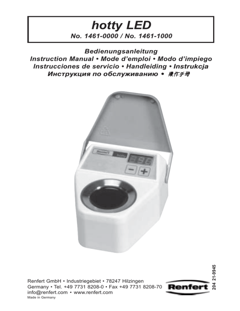hotty LED No. 1461-0000 / No. 1461-1000 Renfert GmbH • Industriegebiet • 78247 Hilzingen Germany • Tel. +49 7731 8208-0 • Fax +49 7731 8208-70 [email protected] • www.renfert.com Made in Germany 204 21-9945 Bedienungsanleitung Instruction Manual • Mode d’emploi • Modo d’impiego Instrucciones de servicio • Handleiding • Instrukcja Инструкция по обслуживанию • hotty LED Nr. 14610000 / Nr. 14611000 POLSKI 1. Wprowadzenie Cieszymy się, że zdecydowali się Państwo na zakup podgrzewacza do wosku hotty LED. Prosimy stosować się do naszych zaleceń a gwarantujemy długą i bezproble mową pracę urządzenia. 2. Zastosowanie hotty LED jest elektronicznie regu lowanym urządzeniem do wykony wania czapeczek woskowych tech niką zanurzania. Nadaje się najlepiej do rozpuszczania i utrzymywania w stanie płynnym wszystkich pows zechnie znanych wosków do wyko nywania czapeczek. Wysoka jakość urządzenia hotty LED daje Państwu następujące korzyści: precyzyjna regulacja temperatury (+/ 2°C [3,6°F]) dba o najwyższą jakość czapeczek woskowych. Szybka reakcja elementów grzej nych na wahania temperatury nie pozwala na przegrzanie się wosku. Proszę wziąć pod uwagę, że podgrzewanie wosku jest procesem delikatnym. Potrzeba trochę czasu, żeby wosk stał się w pełni płynny. Poprzez kontrolowane podwyższanie temperatury wosku wykluczone jest, aby temperatura w pojemniku została przekroczona powyżej ustawionej wartości. Pozwala to na ciągłe utrzy mywanie wysokiej jakości wosku. hotty LED stwarza Państwu opty malne warunki do pracy. Na przykład przykrywka jest tak zbudowana, że zarówno prawo jak i lewo ręczni mogą w czasie pracy z urządzeniem pode przeć wygodnie rękę o blat stołu. Po zakończeniu pracy urządzenie daje się łatwo zamknąć. 2.1 Warunki otoczenia (według EN 610101) hotty LED można używać tylko: • w pomieszczeniach • do wysokości 2.000 m npm. • przy temperaturze otoczenia od 5 40°C [41 104°F] *), • przy maksymalnej względnej wil gotności powietrza od 80% przy 31°C [87,8°F], liniowo zmniejszają cej się aż do 50% względnej wilgot ności powietrza przy 40°C [104°F]*), • przy sieci elektrycznej w której zachwiania napięcia nie przekrac zają 10% wartości nominalnej. • przy stopniu zanieczyszczenia 2. • przy kategorii przepięcia II. *) Urządzenie jest gotowe do użycia przy temperaturze od 5 – 30°C [41 86°F] i wilgotności powietrza aż do 80%. Przy temperaturach od 31 40°C [87,8 104°F], aby utrzymać urząd zenie w pełnej gotowości do pracy, wilgotność powietrza musi być propor cjonalnie zmniejszana (np. przy 35°C [95°F] = 65% wilgotności powietrza, przy 40°C [104°F] = 50% wilgotności powietrza). Przy temperaturach powyżej 40°C [104°F] urządzenie nie powinno pracować. 3. Informacje doty czące bezpieczeństwa Urzadzenie hotty LED jest urzadzeniem potencjalnie niebezpiecznym. Moze ono byc podlaczony / uzywany tylko po uprzednim sprawdze niu zgodnosci z odnosnymi normami krajowymi przez upowaznionych specjalistów. • Przed uruchomieniem urządzenia porównajcie Państwo parametry napię cia z tabliczki znamionowej z wielkością napięcia w sieci. • Urządzenie z uszkodzonym przewodem elektrycznym lub innym uszkodzeniem nie powinno być używane. • Kabel elektryczny (C) pod czas pracy powinien być rozwinięty (niebezpieczeń stwo przegrzania w przy padku zbyt krótkiego połączenia). • Wosk w stanie płynnym może się łatwo zapalić. Nie należy poruszać urządzenia podczas pracy! • Pojemnik na wosk (F) nagr zewa się w czasie pracy także na rancie urządzenia. Przy nieodpowiednim uży waniu może to doprowad zić do pożaru (także ok. 30 min. po wyłączeniu). • hotty LED przystosowany jest do pracy tylko z wos kami dentystycznymi dostępnymi w sprzedaży. W żadnym wypadku nie może być napełniany innymi materiałami! • Prosimy uważać: zbyt pełny pojemnik może doprowad zić do wylania się wosku! • Materiały / substancje, których punkt zapalny leży poniżej 175°C [347°F] nie powinny być przechowy wane w pobliżu podgrze wacza i nie powinny mieć z nim styczności. • Urządzenia nie zanurzać w wodzie i nie spłukiwać wodą! Może to doprowad zić do porażenia prądem. 3.1 Utrata gwarancji Renfert GmbH odmówi każdego odszkodowania i roszczenia dotyczącego gwarancji w przypadku gdy: • urządzenie użyte było do innych celów niż podane w instrukcji obsługi. • urządzenie w jakikolwiek sposób zostało przerobione wyłączając zmiany opisa ne w instrukcji obsługi. • urządzenie było repero wane w nie autoryzowanych punktach napraw albo nie użyto do naprawy oryginal nych części firmy Renfert. • urządzenie nadal było stosowane mimo znanych braków bezpieczeństwa. • produkt narażony był na mechaniczne uderzenia albo został upuszczony. 4. Elementy obsługi (zdj. 1) A) B) C) D) E) F) Włącznik, wyłącznik Przykrywka Kabel sieciowy Wskaźnik LED Ustawianie temperatury +/ Pojemnik podgrzewacza 5. Uruchomienie / Obsługa 1. Połączyć podgrzewacz hotty LED z gniazdkiem sieci elektrycznej (zdj. 2). 2. Otworzyć przykrywkę (B) (zdj. 3). 3. Napełnić pojemnik woskiem do zanurzania (F) (zdj. 4). 4. hotty LED włączyć przełącznikiem (A). Na wyświetlaczu LED (D) pokaże się najpierw jednostka temperatury (°C albo °F),następ nie zaprogramowana tempera tura a na koniec, automatycznie, temperatura aktualnie panująca w pojemniku. 5. W prawym dolnym rogu wyświet lacza LED pokazuje się punkt (zdj. 5). Gaśnie on w momencie osiągnięcia ustawionej tempera tury. 5.1 Ustawianie jednostki temperatury °C albo °F Prosimy wziąć pod uwagę, że urządzenia na 230 V ustawiane są fabrycznie w °C a urządzenia pracujące na 120 V – ustawione są fabryc znie w °F ! 1. Najpierw należy wykonać kroki 1 – 4 z pkt. 5. 2. Należy przytrzymać wciśnięte przyciski i + (zdj. 6) i włączyć hotty 
