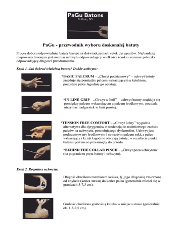 PaGu - przewodnik wyboru doskonałej batuty Proces doboru odpowiedniej batuty bazuje na doświadczeniach setek dyrygentów. Najbardziej rozpowszechnionym jest rozmiar uchwytu odpowiadający wielkości kciuka i rozmiar pałeczki odpowiadający długości przedramienia. Krok 1. Jak dobrać właściwą batutę? Dobór uchwytu: *BASIC FALCRUM – „Chwyt podstawowy” – uchwyt batuty znajduje się pomiędzy palcem wskazującym a kciukiem, pozostałe palce łagodnie go oplatają. *IN-LINE-GRIP – „Chwyt w linii” - uchwyt batuty znajduje się pomiędzy palcem wskazującym a palcem środkowym; pozwala utrzymać nadgarstek w linii prostej. *TENSION FREE COMFORT – „Chwyt luźny” wygodna alternatywa dla dyrygentów z tendencją do nadmiernego zacisku palców na uchwycie, powodującego dyskomfort. Uchwyt jest podtrzymywany środkowym i czwartym palcem ręki, a palec wskazujący i kciuk łagodnie otaczają batutę; w rezultacie punkt balansu jest nieco przesunięty do przodu. *BEHIND THE COLLAR PINCH – „Chwyt poza uchwytem” (na pograniczu pręta batuty i uchwytu). Krok 2. Rozmiary uchwytu: Długość określona rozmiarem kciuka, tj. jego długością zmierzoną od knykcia (końca stawu) do końca palca (generalnie mieści się w granicach 5-7,5 cm). Grubość określona grubością kciuka w miejscu stawu (generalnie ok. 1,3-2,5 cm). Krok 3. Balans Aby określić odpowiednią długość batuty, należy zmierzyć długość przedramienia zgiętego w kącie prostym, po jego wewnętrznej stronie, od zgięcia w stawie łokciowym do środka dłoni (zazwyczaj jest to ok. 28-33 cm, w zależności od wzrostu). Długość ta wyznacza przybliżoną długość batuty, a tym samym określa jej optymalny balans. SERIA OPUS 1 Batuty i etui z serii Opus 1 zostały zaprojektowane z myślą o młodych adeptach sztuki dyrygenckiej i charakteryzują się dobrą jakością połączoną z przystępną ceną. Batuty te są zbalansowane pod kątem chwytu podstawowego, stąd jedynym parametrem wymagającym zmierzenia jest długość. W rezultacie są to bardzo wygodne batuty „codziennego użytku”. Uchwyty batut serii Opus 1 są wykonane z wyselekcjonowanych gatunków drewna dla zapewnienia właściwego balansu; Wykończenie powierzchni wszystkich batut PaGu zapewnia pewny i bezpieczny uchwyt nawet w spoconej dłoni. Rodzaje drewna, z którego wykonane są uchwyty: czarne drewno afrykańskie klon „Ambrozja” gwajakowiec argentyński klon „Ptasie oczko” drewno Katalox drewno Kingwood heban Macassar drewno oliwkowe drewno Padauk palisander honduraski drewno Tamboti orzech włoski Twoja batuta jest Twoim instrumentem! Nie używaj więc tego instrumentu, jako metronomu, gdyż może to skutkować pęknięciem drewna, odpryskami lakieru, rozwarstwieniami materiału. Opinie dyrygentów: „Jestem zaszczycony faktem, że jeden z modeli został zaprojektowany dla mnie i jest sygnowany moim nazwiskiem. Phil Aguglia wytwarza batuty-arcydzieła, które są piękne, eleganckie, dobrze dopasowane i zbalansowane. Używam wyłącznie tych batut, dzięki czemu zawsze czuję duży komfort pracy.” JoAnn Falletta, Dyrektor artystyczny Buffalo Philharmonic i Virginia Symphony „Nie wyobrażam sobie dyrygowania musicalu ''Wicked'' na Broadwayu inną batutą, niż moja PaGu. To jest zdecydowanie najwygodniejsza batuta ze wszystkich, których kiedykolwiek używałem.” Ben Cohen „Oczywiście można dyrygować bez batuty gdy chcemy, by gesty ręki odzwierciedlały nasze muzyczne wyobrażenia... ale doskonale wykonana batuta może być świetnym przedłużeniem tej ręki. Magia batut PaGu sprawia, że nie mają sobie równych w świecie...” Marco Ossani, Bologna, Italy ZACHĘCAMY DO ZAKUPU! Z muzycznymi pozdrowieniami Firma Henglewscy
