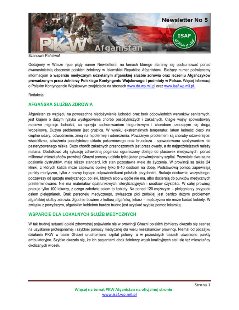 Szanowni Państwo! Oddajemy w Wasze ręce piąty numer Newslettera, na łamach którego staramy się podsumować ponad dwunastoletnią obecność polskich żołnierzy w Islamskiej Republice Afganistanu. Bieżący numer poświęcamy informacjom o wsparciu medycznym udzielanym afgańskiej służbie zdrowia oraz leczeniu Afgańczyków prowadzonym przez żołnierzy Polskiego Kontyngentu Wojskowego i podmioty w Polsce. Więcej informacji o Polskim Kontyngencie Wojskowym znajdziecie na stronach www.do.wp.mil.pl oraz www.isaf.wp.mil.pl. Redakcja. AFGAŃSKA SŁUŻBA ZDROWIA Afganistan ze względu na powszechne niedożywienie ludności oraz brak odpowiednich warunków sanitarnych, jest krajem o dużym ryzyku występowania chorób pasożytniczych i zakaźnych. Ciągłe wojny spowodowały masowe migracje ludności, co sprzyja zachorowaniom biegunkowym i chorobom szerzącym się drogą kropelkową. Dużym problemem jest gruźlica. W wyniku ekstremalnych temperatur, latem ludność cierpi na cieplne udary, odwodnienie, zimą na hipotermię i odmrożenia. Poważnym problemem są choroby odzwierzęce: wścieklizna, zakażenia pasożytnicze układu pokarmowego oraz bruceloza - spowodowana spożywaniem nie pasteryzowanego mleka. Dużo chorób zakaźnych przenoszonych jest przez owady, a do najgroźniejszych należy malaria. Dodatkowo złą sytuację zdrowotną pogarsza ograniczony dostęp do placówek medycznych: ponad milionowi mieszkańców prowincji Ghazni pomocy udziela tylko jeden prowincjonalny szpital. Pozostałe dwa są na poziomie dystryktów, mają niższy standard, ich stan pozostawia wiele do życzenia. W prowincji są także 24 kliniki, z których każda może zapewnić opiekę tylko 8-10 osobom na dobę. Podstawową pomoc zapewniają punkty medyczne, tylko z nazwy będące odpowiednikami polskich przychodni. Brakuje dosłownie wszystkiego: począwszy od sprzętu medycznego, po leki, których albo w ogóle nie ma, albo docierają do punktów medycznych przeterminowane. Nie ma materiałów opatrunkowych, sterylizacyjnych i środków czystości. W całej prowincji pracuje tylko 100 lekarzy, z czego zaledwie osiem to kobiety. Na ponad 120 mężczyzn – pielęgniarzy przypada osiem pielęgniarek. Brak personelu medycznego, zwłaszcza płci żeńskiej jest bardzo dużym problemem afgańskiej służby zdrowia. Zgodnie bowiem z kulturą afgańską, lekarz – mężczyzna nie może badać kobiety. W związku z powyższym, afgańskim kobietom bardzo trudno jest uzyskać szybką pomoc lekarską. WSPARCIE DLA LOKALNYCH SŁUŻB MEDYCZNYCH W tak trudnej sytuacji opieki zdrowotnej pojawienie się w prowincji Ghazni polskich żołnierzy okazało się szansą na uzyskanie profesjonalnej i szybkiej pomocy medycznej dla wielu mieszkańców prowincji. Niemal od początku działania PKW w bazie Ghazni uruchomiono szpital polowy, a w pozostałych bazach utworzono punkty ambulatoryjne. Szybko okazało się, że ich pacjentami obok żołnierzy wojsk koalicyjnych stali się też mieszkańcy okolicznych wiosek. Strona 1 Więcej na temat PKW Afganistan na oficjalnej stronie www.isaf.wp.mil.pl 5.08.2009. Kilka minut po godz. 22.00 do polskiego ambulatorium w bazie Ghazni przywieziono 19 Afgańczyków z ranami odłamkowymi nóg, głowy i klatki piersiowej. W czasie, kiedy pierwszej grupie rannych udzielano pomocy, do ambulatorium zostali przetransportowani kolejni poszkodowani. Ze względu na dużą liczbę rannych lekarze musieli udzielać pomocy także poza budynkiem szpitalnym. Natychmiast rozstawiono stelaże, na których kładziono nosze z rannymi i na dworze zaopatrywano chirurgicznie rannych, podawano kroplówki, a tych których stan tego wymagał przygotowywano do zabiegów chirurgicznych i operacji. Mimo iż do tej pory, w polskiej bazie nie było, takich masowych przyjęć, to dzięki współpracy polskich i amerykańskich lekarzy oraz pomagających im żołnierzy, strażaków i pracowników cywilnych wszystko przebiegło sprawnie i co najważniejsze, mimo ciężkich obrażeń prawie wszystkim pacjentom udało się pomóc. Lekarze opatrzyli dziesiątki ran na rękach i nogach oraz klatce piersiowej. U trzech pacjentów lekarze musieli przeprowadzić amputację kończyn dolnych. Około północy 9 lżej rannych pacjentów, którzy wcześniej zostali zaopatrzeni chirurgicznie i ich życiu nie zagrażało już niebezpieczeństwo, przetransportowano do szpitala w Ghazni. Trzy godziny później śmigłowce medyczne przetransportowały do szpitala w Gardez pozostałych 9 pacjentów. Spośród 19 rannych przywiezionych do bazy w Ghazni jednemu nie udało się uratować życia. W ponad pięciogodzinnej akcji ratowania życia Afgańczykom, uczestniczyło około 150 osób. Oprócz lekarzy w akcji uczestniczyli także polscy strażacy oraz żołnierze Zgrupowania Bojowego Alfa. Bezcenna okazała się także pomoc tłumaczy. Była to pierwsza akcja ratownicza przeprowadzona na taką skalę w polskiej bazie Ghazni. Zdecydowana większość pacjentów nadal szukała pomocy medycznej w szpitalu miejskim w stolicy prowincji. Przez 6 lat obecności Polaków placówka znacznie podniosła standard świadczonej pomocy. Złożyło się na to kilka powodów. Zespół Specjalistów PRT zrealizował kilka projektów pomocowych, w tym m.in. remont oddziału położniczego, zakup sprzętu specjalistycznego (stoły operacyjne, urządzenia rentgenowskie, kolumny anestezjologiczne, 40 łóżek na oddział pediatryczny), zakup generatora zapewniającego niezakłóconą dostawę prądu. Ale był to też remont poczekalni dla rodzin pacjentów, wymiana nawierzchni parkingu przed szpitalem. To szczególnie ważne, gdyż budynek, w którym znajduje się placówka ma ponad 70 lat. Równie cenna była pomoc, jaka za pomocą żołnierzy trafiła do szpitala, a którą ofiarowały organizacje pozarządowe działające w Polsce. Dzięki nim placówka zyskała m.in. wyposażenie gabinetu na oddziale położniczym, inkubatory, USG, leki, środki me