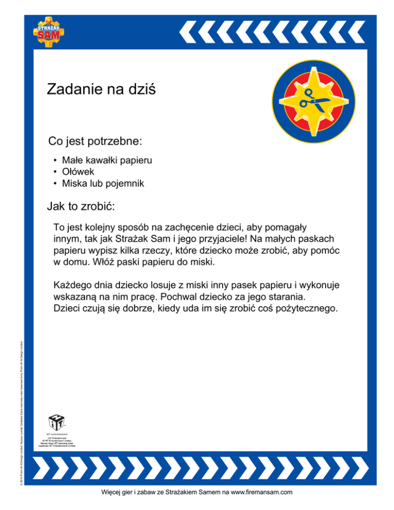 Zadanie na dziś Co jest potrzebne: • Małe kawałki papieru • Ołówek • Miska lub pojemnik Jak to zrobić: To jest kolejny sposób na zachęcenie dzieci, aby pomagały innym, tak jak Strażak Sam i jego przyjaciele! Na małych paskach papieru wypisz kilka rzeczy, które dziecko może zrobić, aby pomóc w domu. Włóż paski papieru do miski. © 2014 Prism Art & Design Limited. Nazwa i postać Strażaka Sama stanowią znaki towarowe firmy Prism Art & Design Limited. Każdego dnia dziecko losuje z miski inny pasek papieru i wykonuje wskazaną na nim pracę. Pochwal dziecko za jego starania. Dzieci czują się dobrze, kiedy uda im się zrobić coś pożytecznego. Więcej gier i zabaw ze Strażakiem Samem na www.firemansam.com