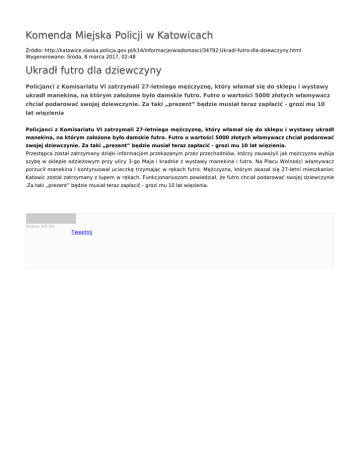 Komenda Miejska Policji w Katowicach Źródło: http://katowice.slaska.policja.gov.pl/k14/informacje/wiadomosci/34792,Ukradl-futro-dla-dziewczyny.html Wygenerowano: Środa, 8 marca 2017, 02:48 Ukradł futro dla dziewczyny Policjanci z Komisariatu VI zatrzymali 27-letniego mężczyznę, który włamał się do sklepu i wystawy ukradł manekina, na którym założone było damskie futro. Futro o wartości 5000 złotych włamywacz chciał podarować swojej dziewczynie. Za taki „prezent” będzie musiał teraz zapłacić - grozi mu 10 lat więzienia Policjanci z Komisariatu VI zatrzymali 27-letniego mężczyznę, który włamał się do sklepu i wystawy ukradł manekina, na którym założone było damskie futro. Futro o wartości 5000 złotych włamywacz chciał podarować swojej dziewczynie. Za taki „prezent” będzie musiał teraz zapłacić - grozi mu 10 lat więzienia. Przestępca został zatrzymany dzięki informacjom przekazanym przez przechodniów, którzy zauważyli jak mężczyzna wybija szybę w sklepie odzieżowym przy ulicy 3-go Maja i kradnie z wystawy manekina i futro. Na Placu Wolności włamywacz porzucił manekina i kontynuował ucieczkę trzymając w rękach futro. Mężczyzna, którym okazał się 27-letni mieszkaniec Katowic został zatrzymany z łupem w rękach. Funkcjonariuszom powiedział, że futro chciał podarować swojej dziewczynie .Za taki „prezent” będzie musiał teraz zapłacić - grozi mu 10 lat więzienia. Ocena: 0/5 (0) Tweetnij