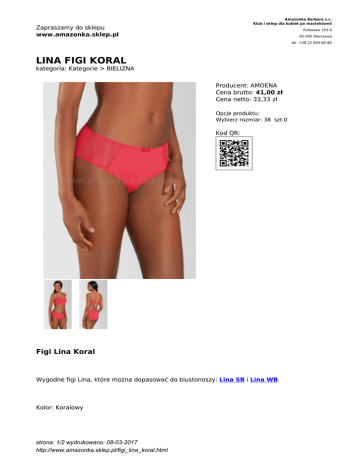 Amazonka Barbara s.c. Klub i sklep dla kobiet po mastektomii Zapraszamy do sklepu www.amazonka.sklep.pl Puławska 103 A 02-595 Warszawa tel. +48 22 844-05-65 LINA FIGI KORAL kategoria: Kategorie > BIELIZNA Producent: AMOENA Cena brutto: 41,00 zł Cena netto: 33,33 zł Opcje produktu: Wybierz rozmiar: 38 szt.0 Kod QR: Figi Lina Koral Wygodne figi Lina, które można dopasować do biustonoszy: Lina SB i Lina WB. Kolor: Koralowy strona: 1/2 wydrukowano: 08-03-2017 http://www.amazonka.sklep.pl/figi_lina_koral.html Materiał: 77% poliamid, 17% elastan, 6% bawełna , - miękka tkanina z mikrowłókien sprawia, że figi są wygodne i nie odznaczają się pod ubraniem, - siateczka z boku to cecha charakterystyczna linii Lina - boczna wysokość fig w rozmiarze 38 - około 8 cm (dla zapewnienia wygody, wysokość wzrasta wraz z rozmiarami) Biustonosze z kieszonkami Amoena przywracają naturalny kształt, bezpiecznie utrzymują protezę, pomagając zaakceptować swój wygląd. Łączą dobry styl i wygodę, których oczekujesz od pięknej bielizny o przemyślanym wzornictwie zapewniającej całodzienny komfort. Wybierz biustonosz spośród niezawodnej kolekcji everyday i wspaniałych kompletów fashion. KOLEKCJA SEZONOWA - DO WYCZERPANIA ZAPASÓW ! strona: 2/2 wydrukowano: 08-03-2017 http://www.amazonka.sklep.pl/figi_lina_koral.html