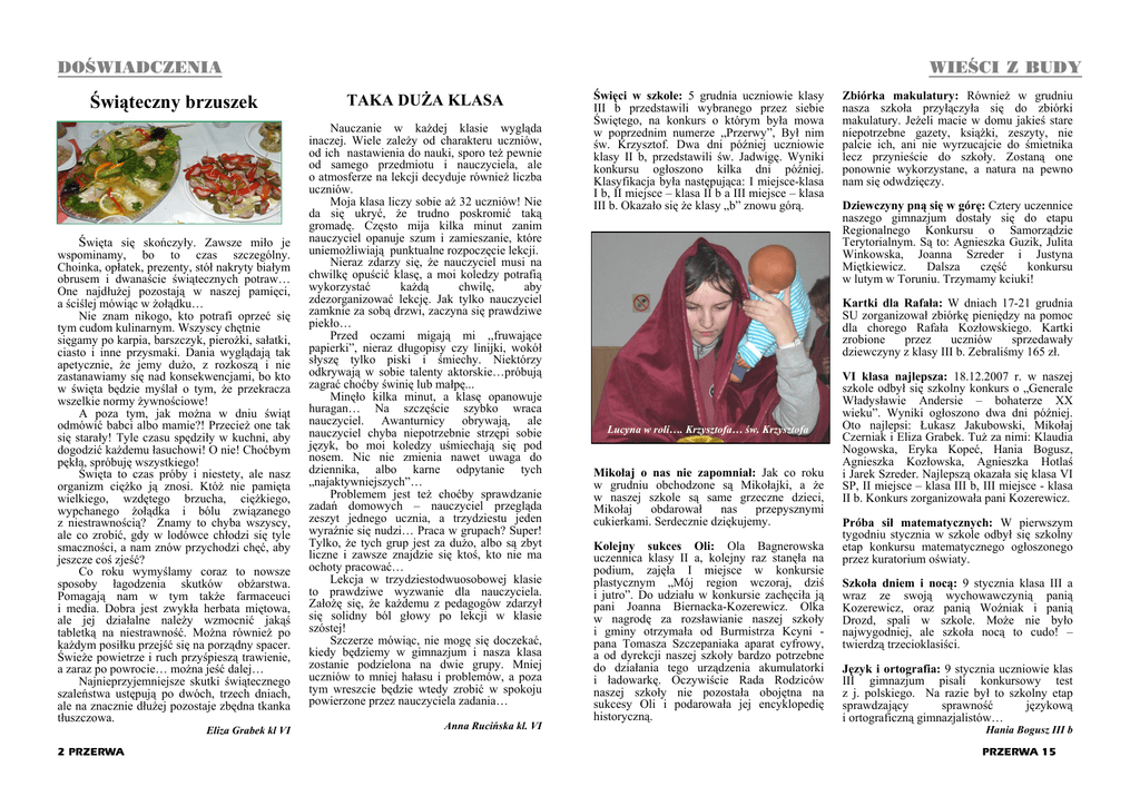 DOŚWIADCZENIA Świąteczny brzuszek Święta się skończyły. Zawsze miło je wspominamy, bo to czas szczególny. Choinka, opłatek, prezenty, stół nakryty białym obrusem i dwanaście świątecznych potraw… One najdłużej pozostają w naszej pamięci, a ściślej mówiąc w żołądku… Nie znam nikogo, kto potrafi oprzeć się tym cudom kulinarnym. Wszyscy chętnie sięgamy po karpia, barszczyk, pierożki, sałatki, ciasto i inne przysmaki. Dania wyglądają tak apetycznie, że jemy dużo, z rozkoszą i nie zastanawiamy się nad konsekwencjami, bo kto w święta będzie myślał o tym, że przekracza wszelkie normy żywnościowe! A poza tym, jak można w dniu świąt odmówić babci albo mamie?! Przecież one tak się starały! Tyle czasu spędziły w kuchni, aby dogodzić każdemu łasuchowi! O nie! Choćbym pękła, spróbuję wszystkiego! Święta to czas próby i niestety, ale nasz organizm ciężko ją znosi. Któż nie pamięta wielkiego, wzdętego brzucha, ciężkiego, wypchanego żołądka i bólu związanego z niestrawnością? Znamy to chyba wszyscy, ale co zrobić, gdy w lodówce chłodzi się tyle smaczności, a nam znów przychodzi chęć, aby jeszcze coś zjeść? Co roku wymyślamy coraz to nowsze sposoby łagodzenia skutków obżarstwa. Pomagają nam w tym także farmaceuci i media. Dobra jest zwykła herbata miętowa, ale jej działalne należy wzmocnić jakąś tabletką na niestrawność. Można również po każdym posiłku przejść się na porządny spacer. Świeże powietrze i ruch przyśpieszą trawienie, a zaraz po powrocie… można jeść dalej… Najnieprzyjemniejsze skutki świątecznego szaleństwa ustępują po dwóch, trzech dniach, ale na znacznie dłużej pozostaje zbędna tkanka tłuszczowa. Eliza Grabek kl VI 2 PRZERWA WIEŚCI Z BUDY TAKA DUŻA KLASA Nauczanie w każdej klasie wygląda inaczej. Wiele zależy od charakteru uczniów, od ich nastawienia do nauki, sporo też pewnie od samego przedmiotu i nauczyciela, ale o atmosferze na lekcji decyduje również liczba uczniów. Moja klasa liczy sobie aż 32 uczniów! Nie da się ukryć, że trudno poskromić taką gromadę. Często mija kilka minut zanim nauczyciel opanuje szum i zamieszanie, które uniemożliwiają punktualne rozpoczęcie lekcji. Nieraz zdarzy się, że nauczyciel musi na chwilkę opuścić klasę, a moi koledzy potrafią wykorzystać każdą chwilę, aby zdezorganizować lekcję. Jak tylko nauczyciel zamknie za sobą drzwi, zaczyna się prawdziwe piekło… Przed oczami migają mi ,,fruwające papierki”, nieraz długopisy czy linijki, wokół słyszę tylko piski i śmiechy. Niektórzy odkrywają w sobie talenty aktorskie…próbują zagrać choćby świnię lub małpę... Minęło kilka minut, a klasę opanowuje huragan… Na szczęście szybko wraca nauczyciel. Awanturnicy obrywają, ale nauczyciel chyba niepotrzebnie strzępi sobie język, bo moi koledzy uśmiechają się pod nosem. Nic nie zmienia nawet uwaga do dziennika, albo karne odpytanie tych „najaktywniejszych”… Problemem jest też choćby sprawdzanie zadań domowych – nauczyciel przegląda zeszyt jednego ucznia, a trzydziestu jeden wyraźnie się nudzi… Praca w grupach? Super! Tylko, że tych grup jest za dużo, albo są zbyt liczne i zawsze znajdzie się ktoś, kto nie ma ochoty pracować… Lekcja w trzydziestodwuosobowej klasie to prawdziwe wyzwanie dla nauczyciela. Założę się, że każdemu z pedagogów zdarzył się solidny ból głowy po lekcji w klasie szóstej! Szczerze mówiąc, nie mogę się doczekać, kiedy będziemy w gimnazjum i nasza klasa zostanie podzielona na dwie grupy. Mniej uczniów to mniej hałasu i problemów, a poza tym wreszcie będzie wtedy zrobić w spokoju powierzone przez nauczyciela zadania… Anna Rucińska kl. VI Święci w szkole: 5 grudnia uczniowie klasy III b przedstawili wybranego przez siebie Świętego, na konkurs o którym była mowa w poprzednim numerze „Przerwy”, Był nim św. Krzysztof. Dwa dni później uczniowie klasy II b, przedstawili św. Jadwigę. Wyniki konkursu ogłoszono kilka dni później. Klasyfikacja była następująca: I miejsce-klasa I b, II miejsce – klasa II b a III miejsce – klasa III b. Okazało się że klasy „b” znowu górą. Zbiórka makulatury: Również w grudniu nasza szkoła przyłączyła się do zbiórki makulatury. Jeżeli macie w domu jakieś stare niepotrzebne gazety, książki, zeszyty, nie palcie ich, ani nie wyrzucajcie do śmietnika lecz przynieście do szkoły. Zostaną one ponownie wykorzystane, a natura na pewno nam się odwdzięczy. Dziewczyny pną się w górę: Cztery uczennice naszego gimnazjum dostały się do etapu Regionalnego Konkursu o Samorządzie Terytorialnym. Są to: Agnieszka Guzik, Julita Winkowska, Joanna Szreder i Justyna Miętkiewicz. Dalsza część konkursu w lutym w Toruniu. Trzymamy kciuki! Kartki dla Rafała: W dniach 17-21 grudnia SU zorganizował zbiórkę pieniędzy na pomoc dla chorego Rafała Kozłowskiego. Kartki zrobione przez uczniów sprzedawały dziewczyny z klasy III b. Zebraliśmy 165 zł. Lucyna w roli…. Krzysztofa… św. Krzysztofa Mikołaj o nas nie zapomniał: Jak co roku w grudniu obchodzone są Mikołajki, a że w naszej szkole są same grzeczne dzieci, Mikołaj obdarował nas przepysznymi cukierkami. Serdecznie dziękujemy. Kolejny sukces Oli: Ola Bagnerowska uczennica klasy II a, kolejny raz stanęła na podium, zajęła I miejsce w konkursie plastycznym „Mój region wczoraj, dziś i jutro”. Do udziału w konkursie zachęciła ją pani Joanna Biernacka-Kozerewicz. Olka w nagrodę za rozsławianie naszej szkoły i gminy otrzymała od Burmistrza Kcyni pana Tomasza Szczepaniaka aparat cyfrowy, a od dyrekcji naszej szkoły bardzo potrzebne do działania tego urządzenia akumulatorki i ładowarkę. Oczywiście Rada Rodziców naszej szkoły nie pozostała obojętna na sukcesy Oli i podarowała jej encyklopedię historyczną. VI klasa najlepsza: 18.12.2007 r. w nas